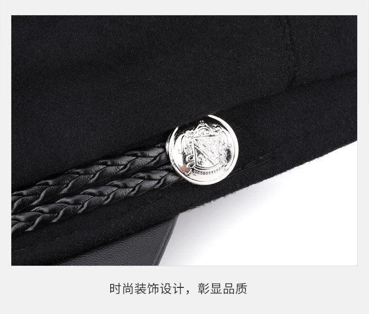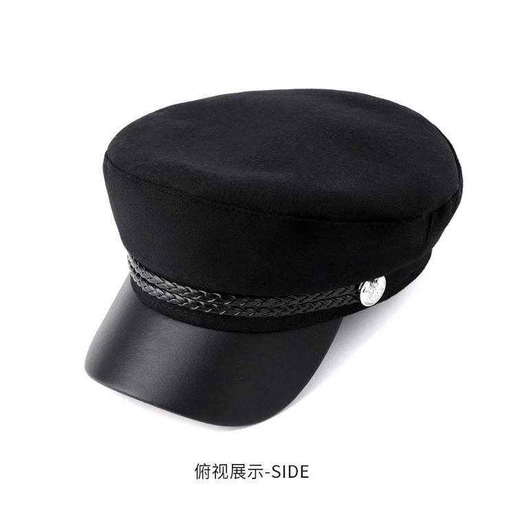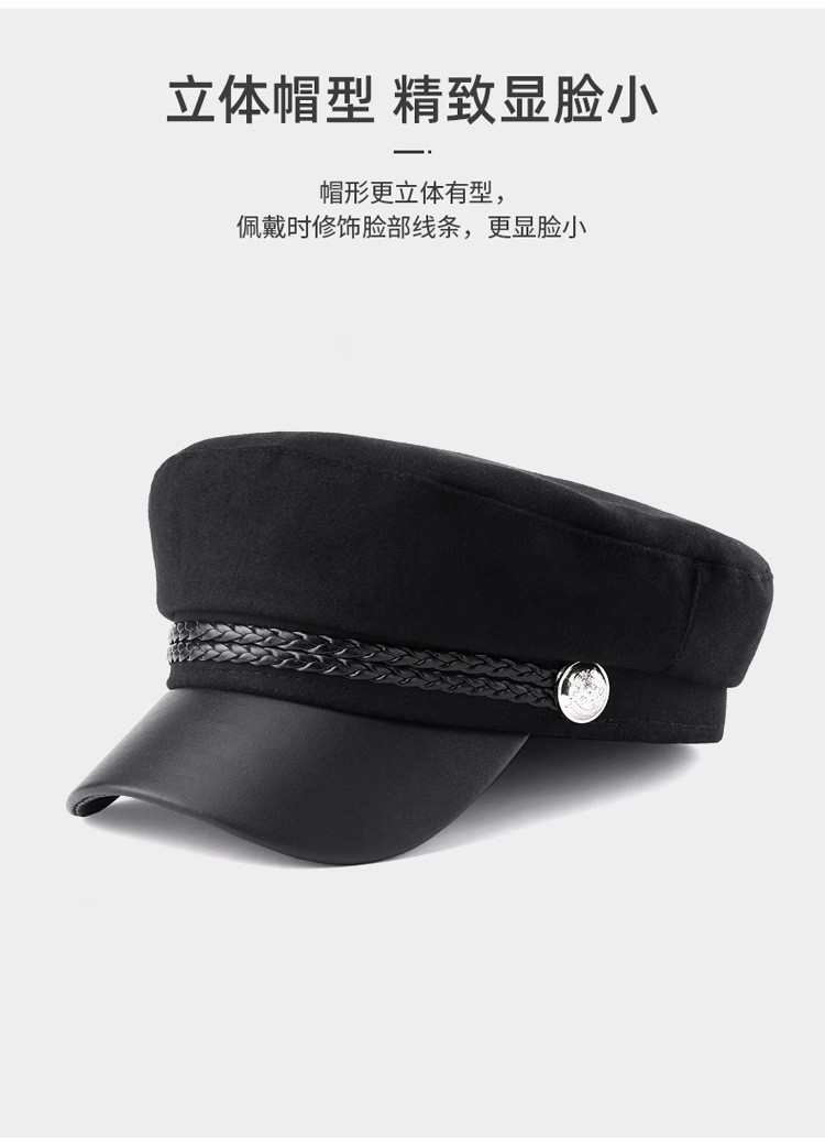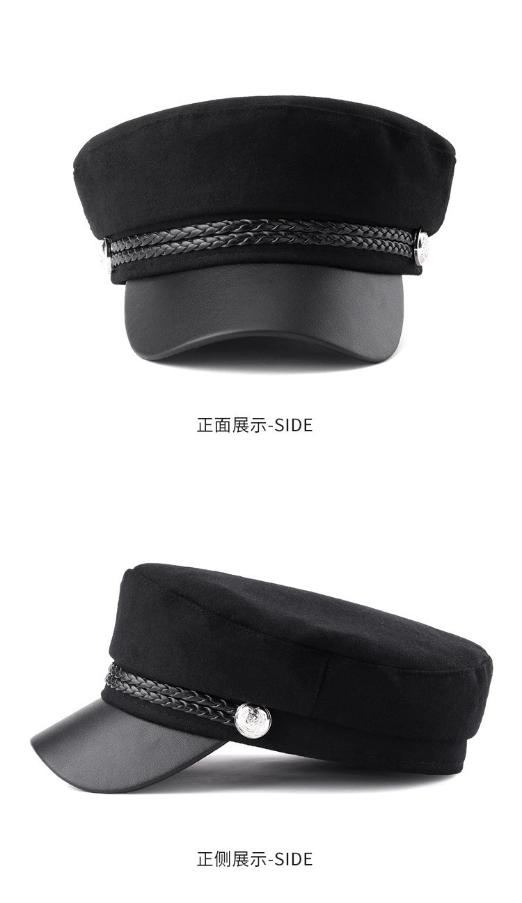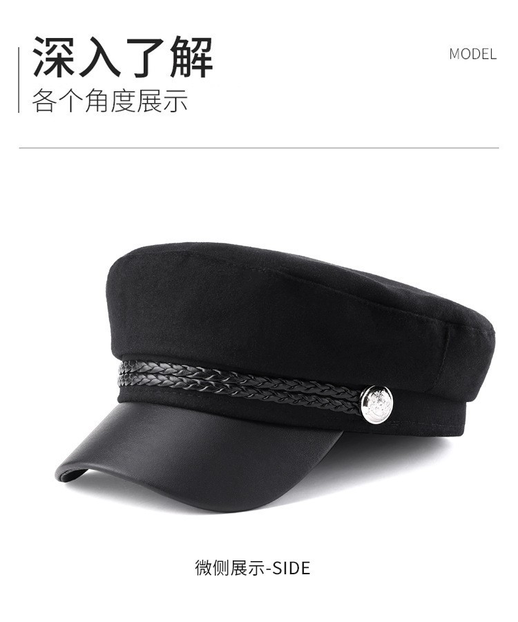 韩版复古时尚海军帽女春秋季潮酷网红毛呢皮绳平顶帽子防风保暖帽