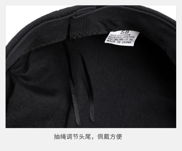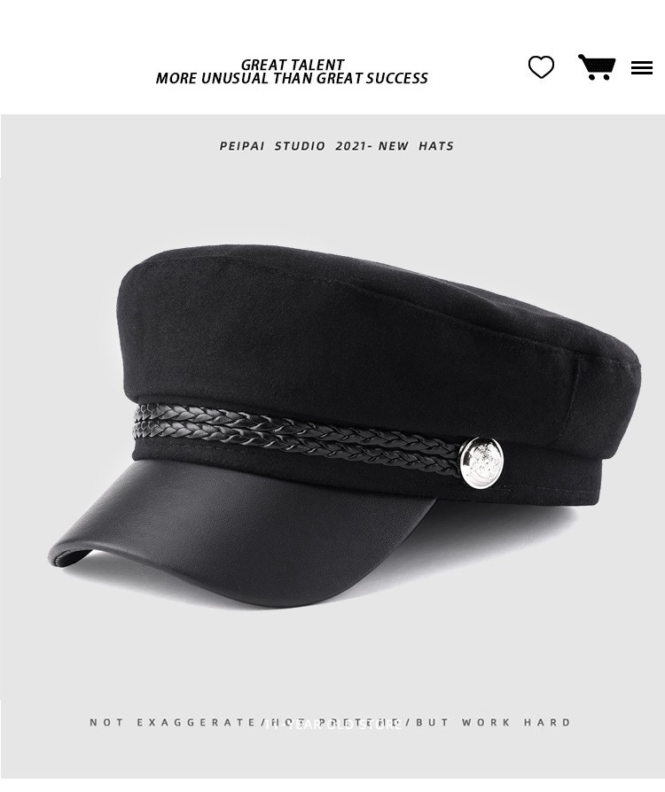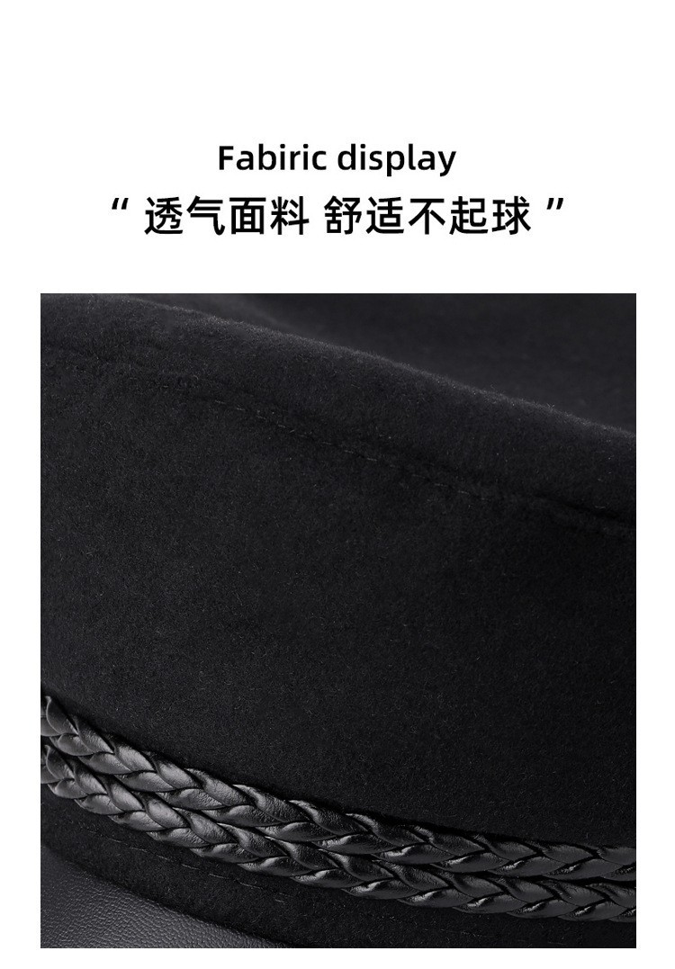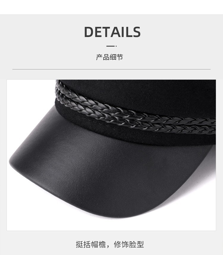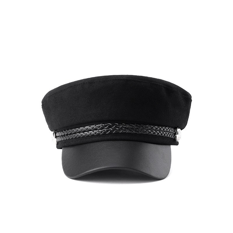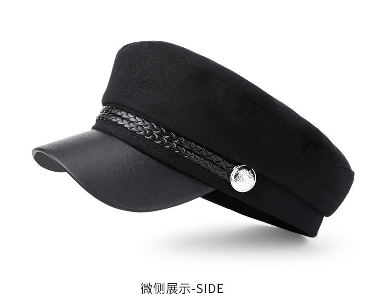 韩版复古时尚海军帽女春秋季潮酷网红毛呢皮绳平顶帽子防风保暖帽