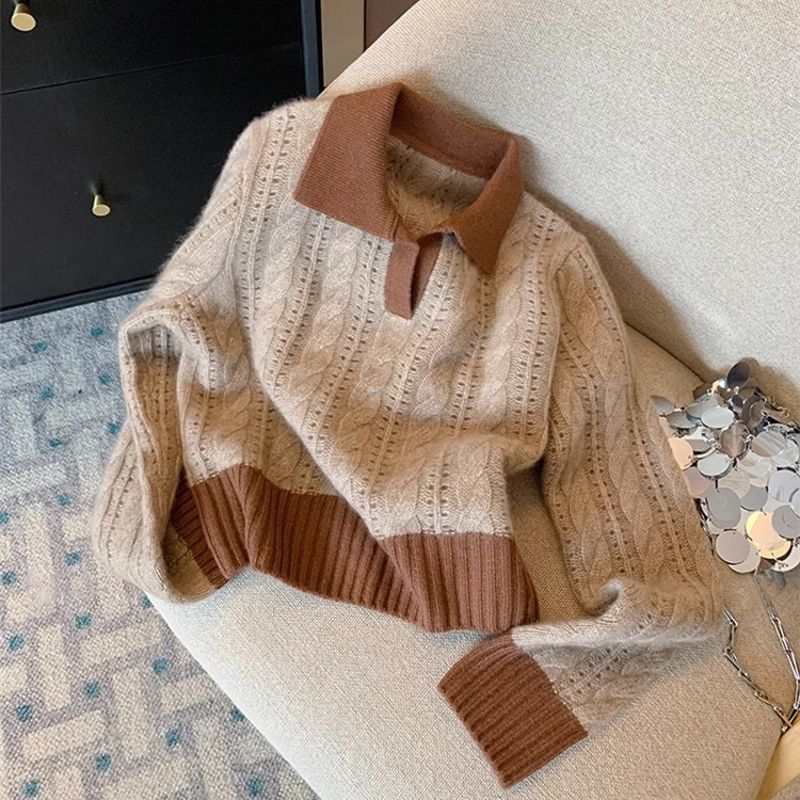 秋冬秋冬季新款女装慵懒polo麻花复古针织衫上衣短款翻领毛衣