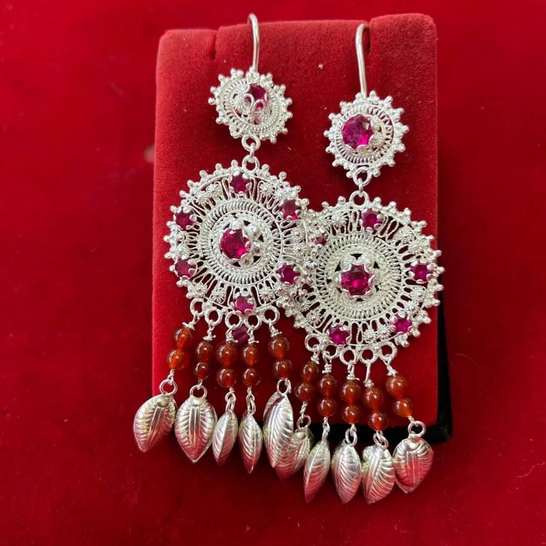 民族風孜熱イヤリング女性ウイグル族伝統的な手作りレトロ耳飾りドリル銀色花糸イヤリング