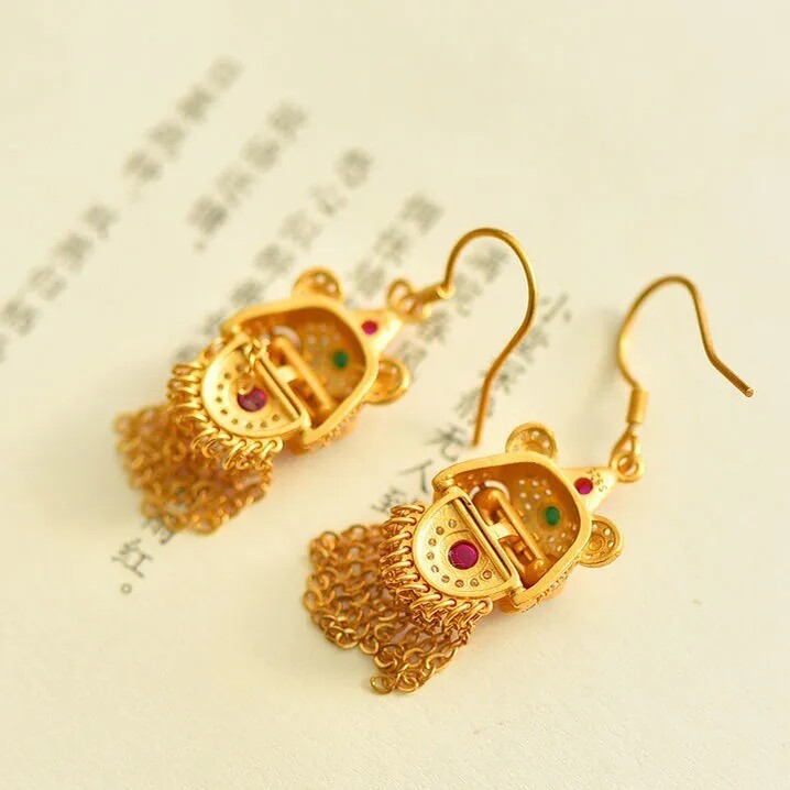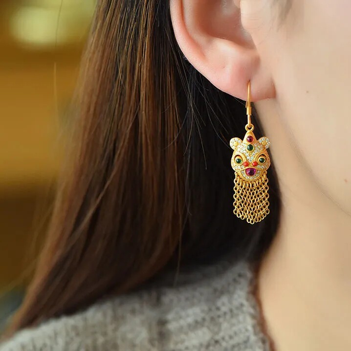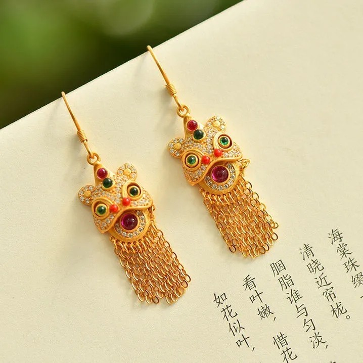 925銀の目が覚めた獅子の流蘇のイヤリングの古い法の金メッキの民族の風のイヤリングは漢服の唐の服装の古着の耳飾りの女性を配合します。
