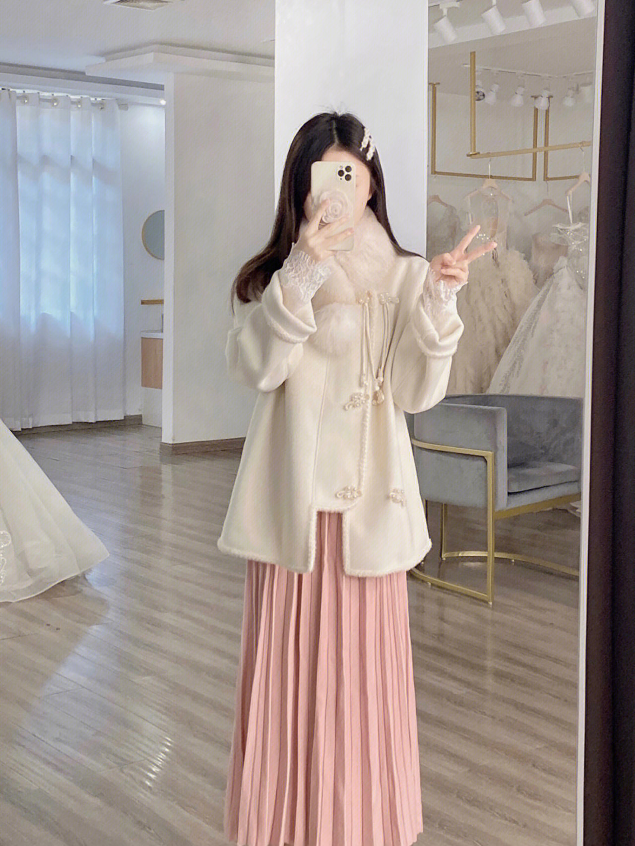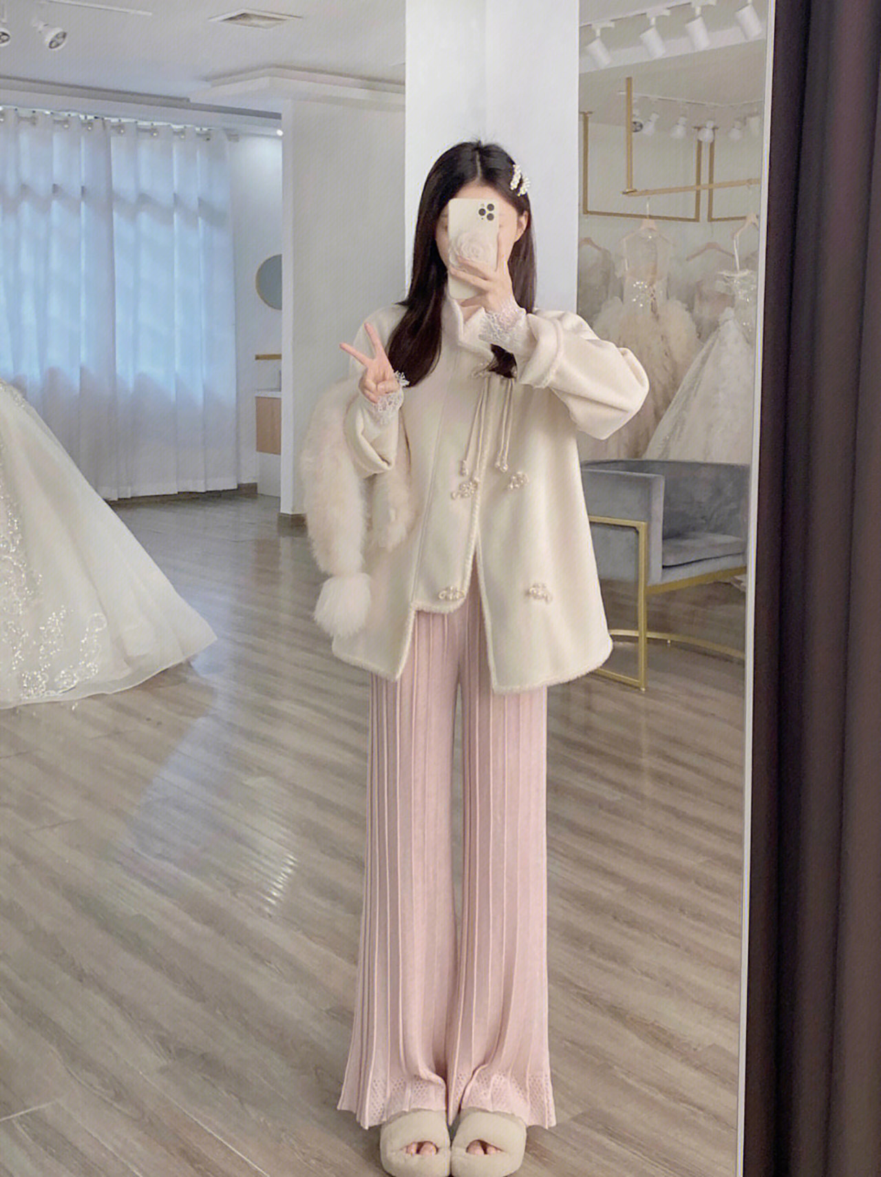 反季特惠 新中式立领大衣女小个子高级感短款粉色毛呢外套