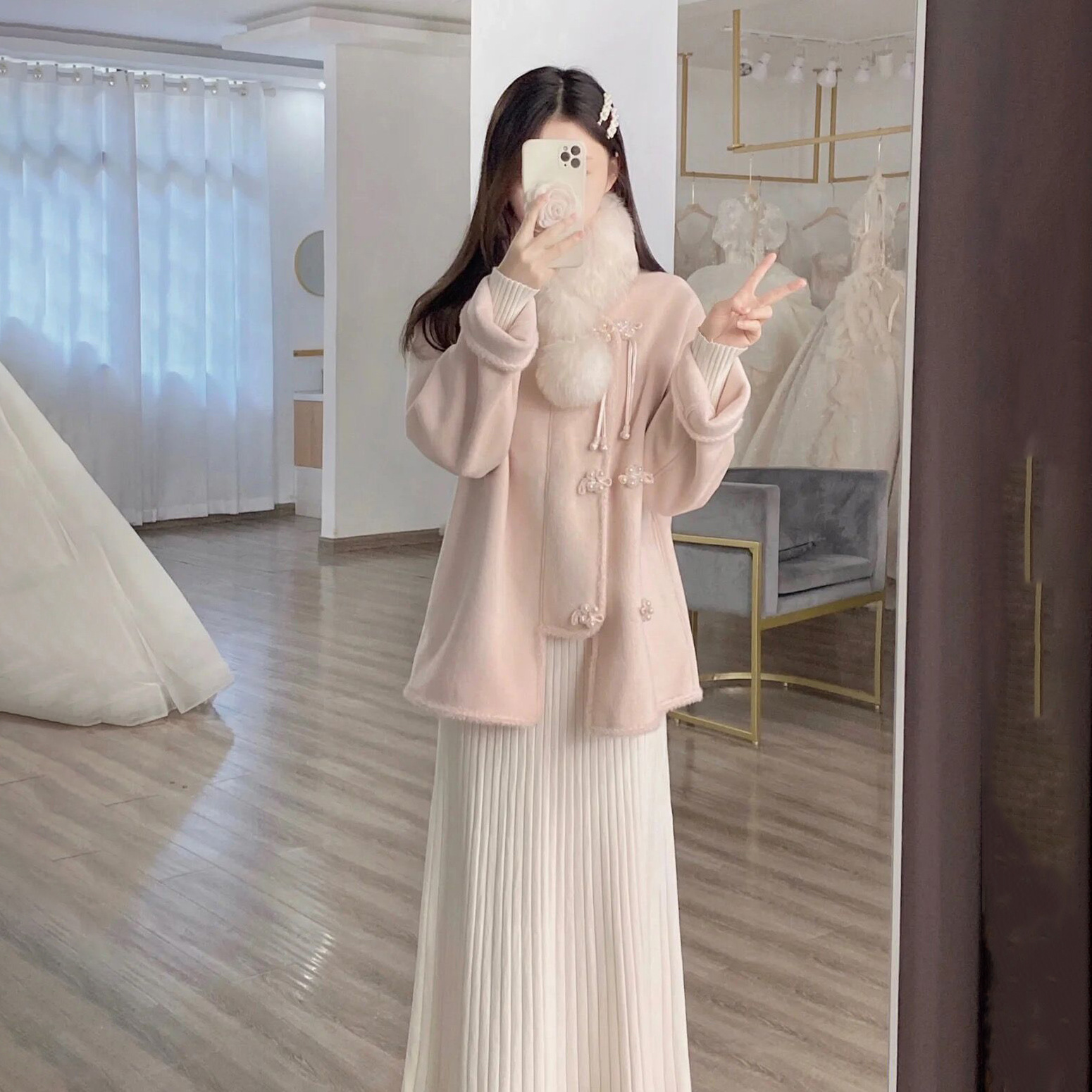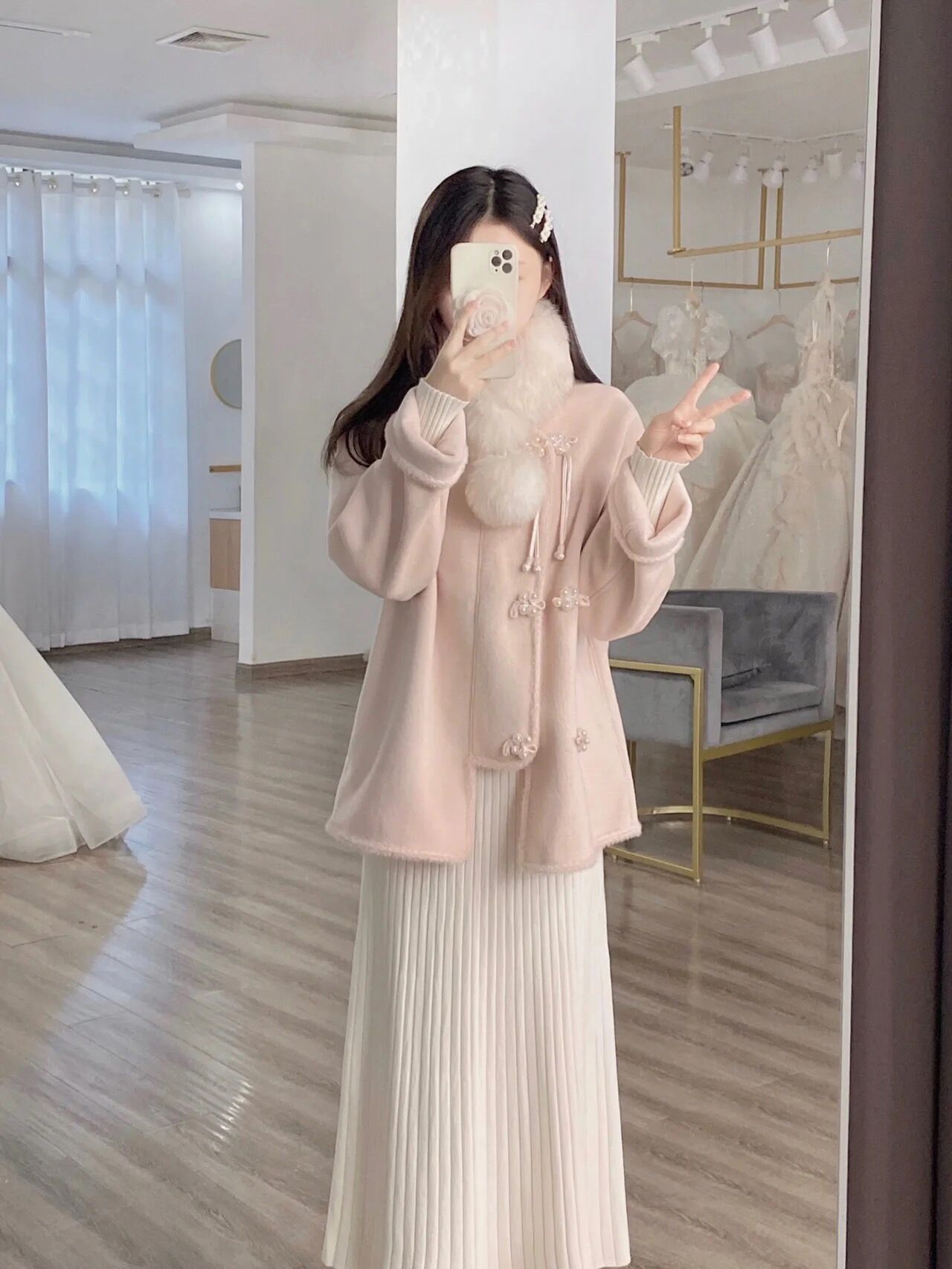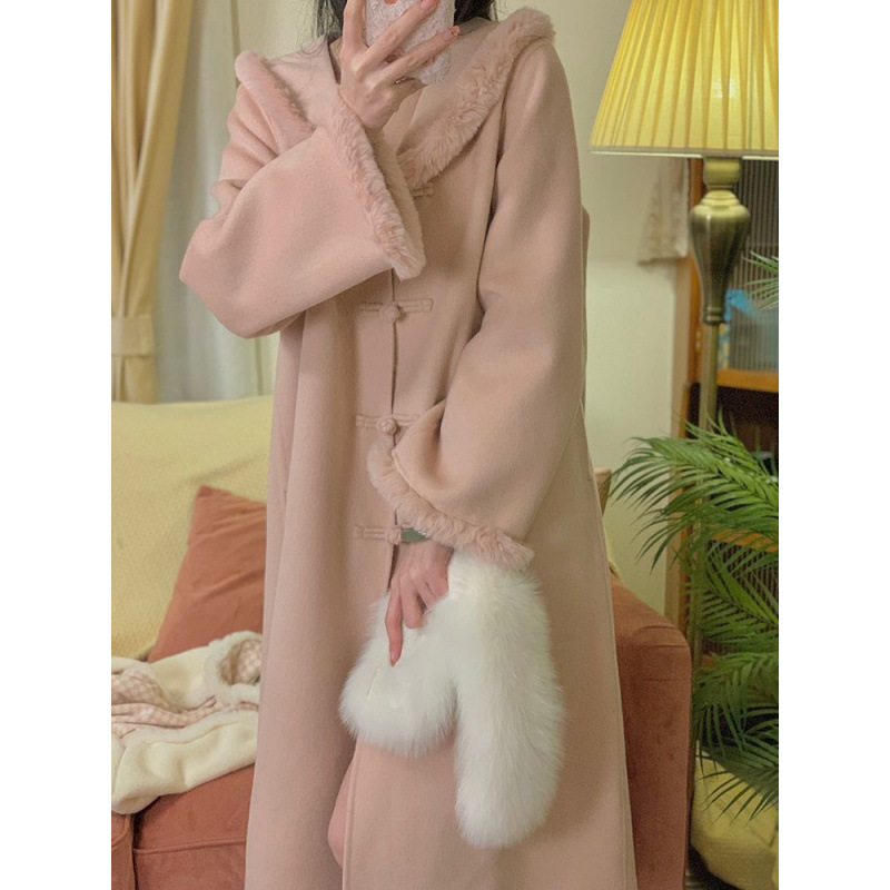 新中式ピンクウールコート2025年大襟手縫いボタンロングウールコート冬国潮