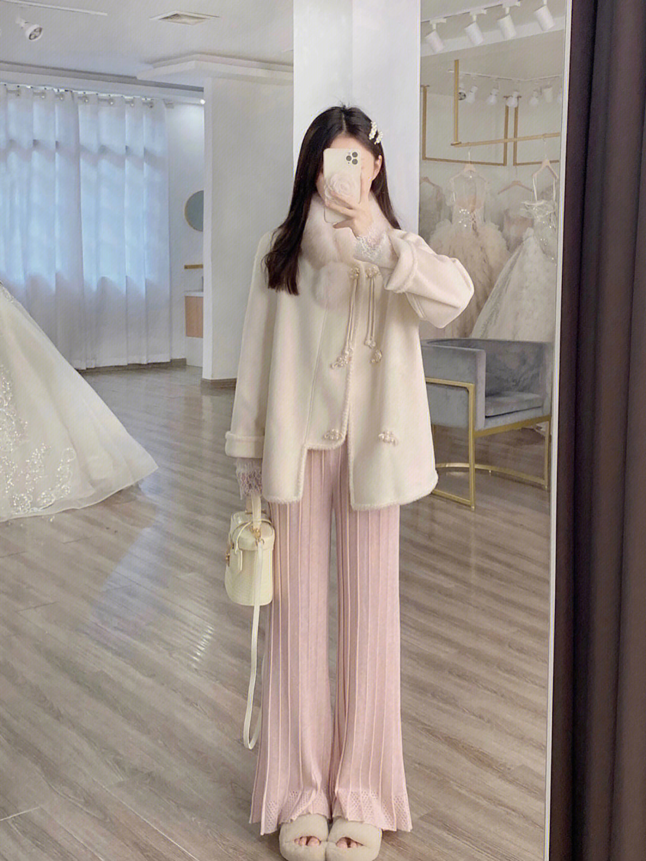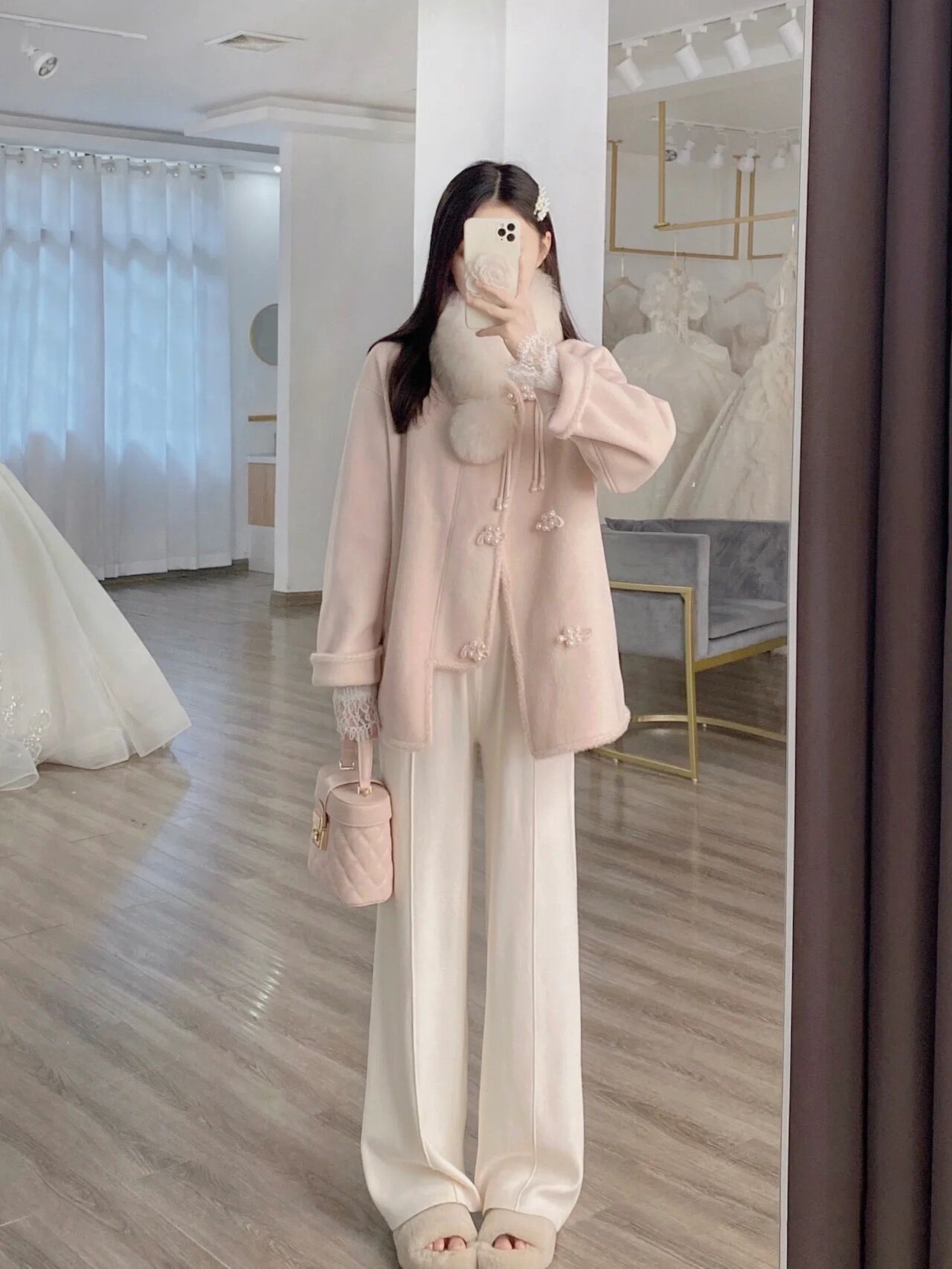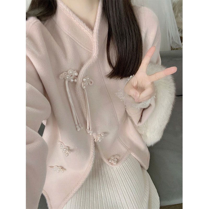 新中式ボタン付きウールコート レディース 秋冬 高級感 2025年新作 エレガント ラグジュアリー風 ピンクコート