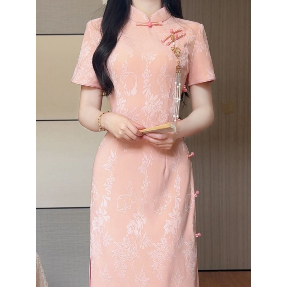 抹茶 2025 春夏新作ピンクジャカード改良チャイナドレスエレガントガール新作チャイナドレス