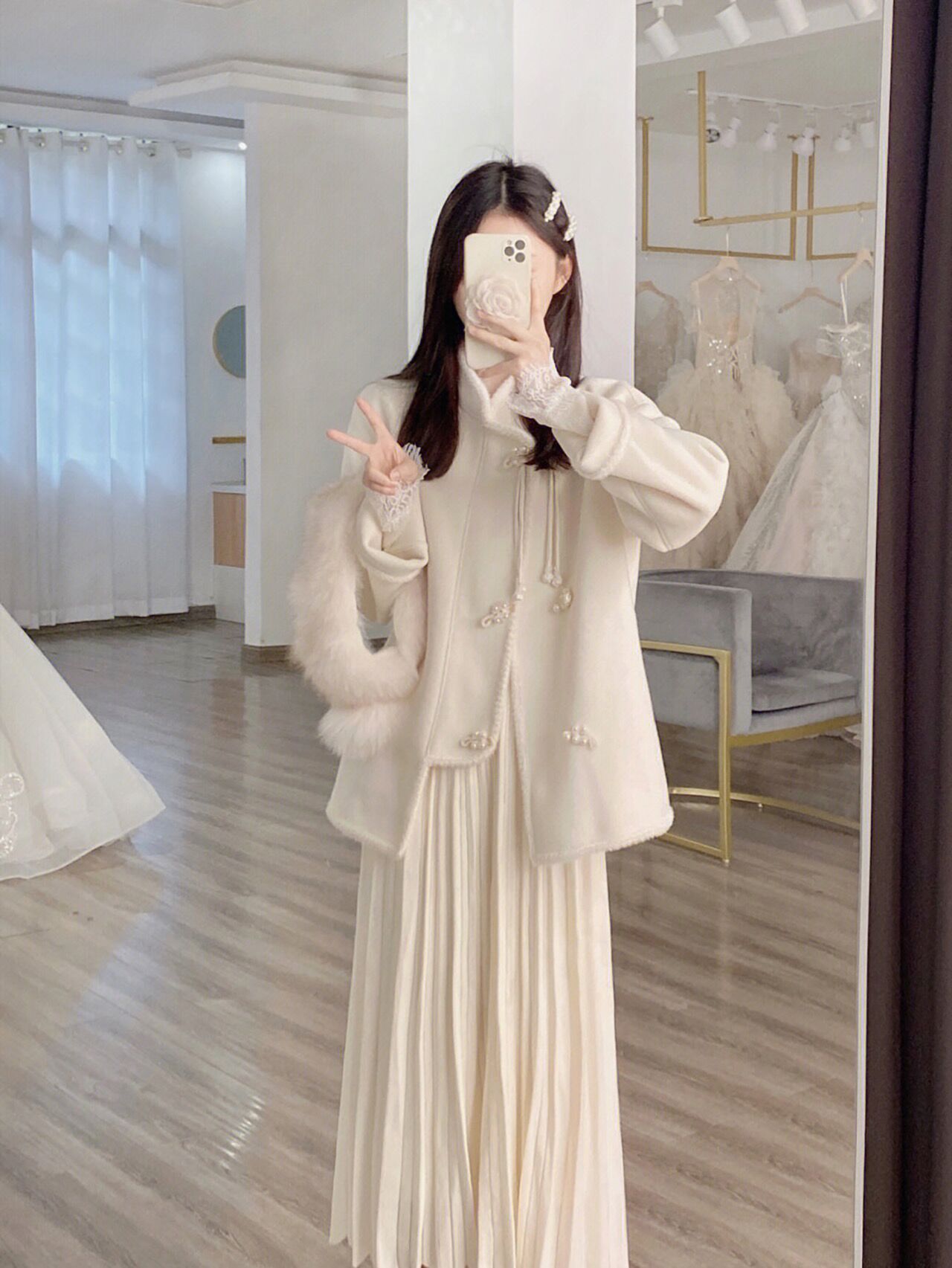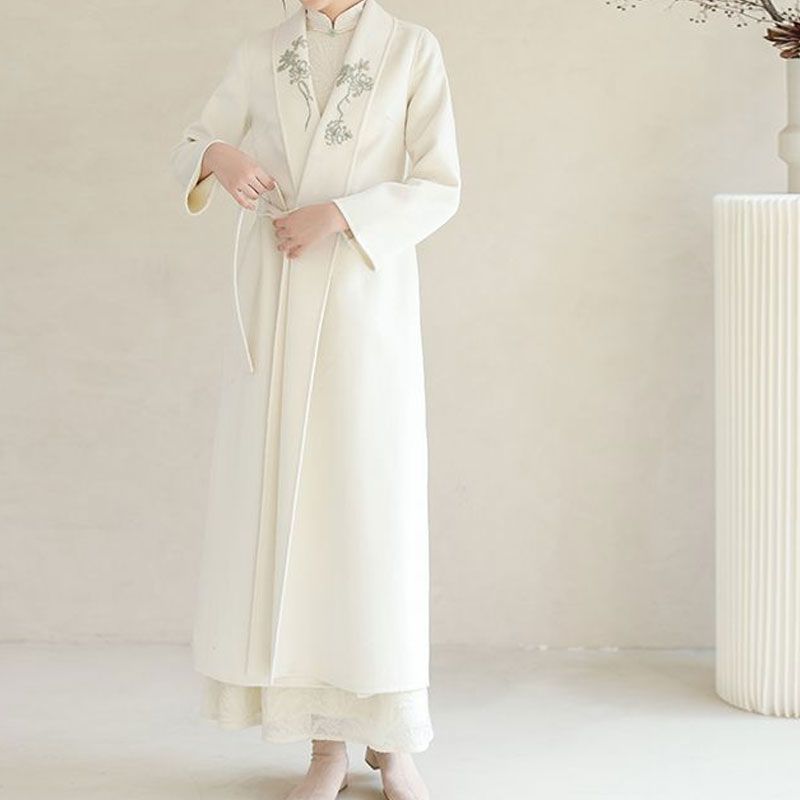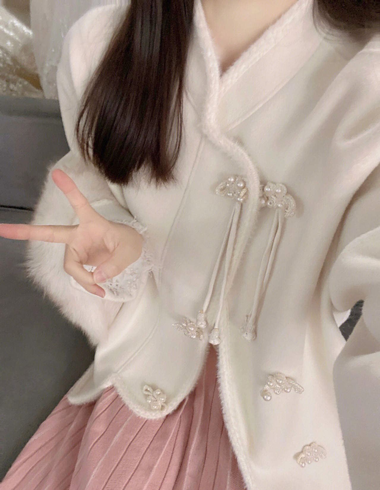 2025秋季款文艺中国风复古毛呢改良长袖V领系带日常可穿白色外套