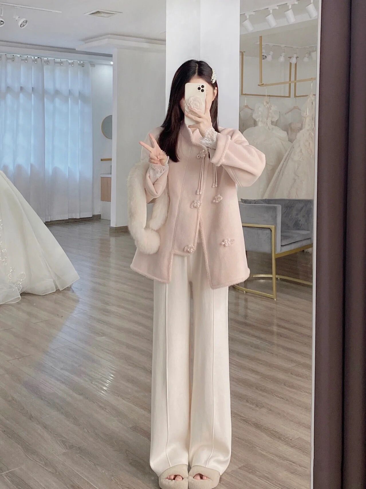新中式国风毛呢短款外套秋冬加厚保暖盘扣刺绣粉色羊毛双面大衣女
