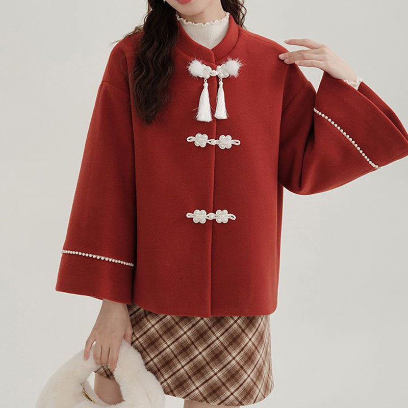 現物新中国風の国風の赤い毛は上着の女性の冬の新型の唐装の新年の赤いコートのスーツです。