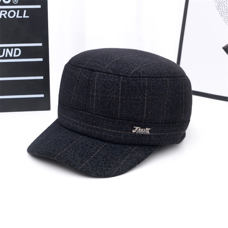 冬の新作中高年男性用防寒耳当て付きコットン帽子、フラットトップハット、おじいちゃん用裏起毛厚手ウール防寒帽子