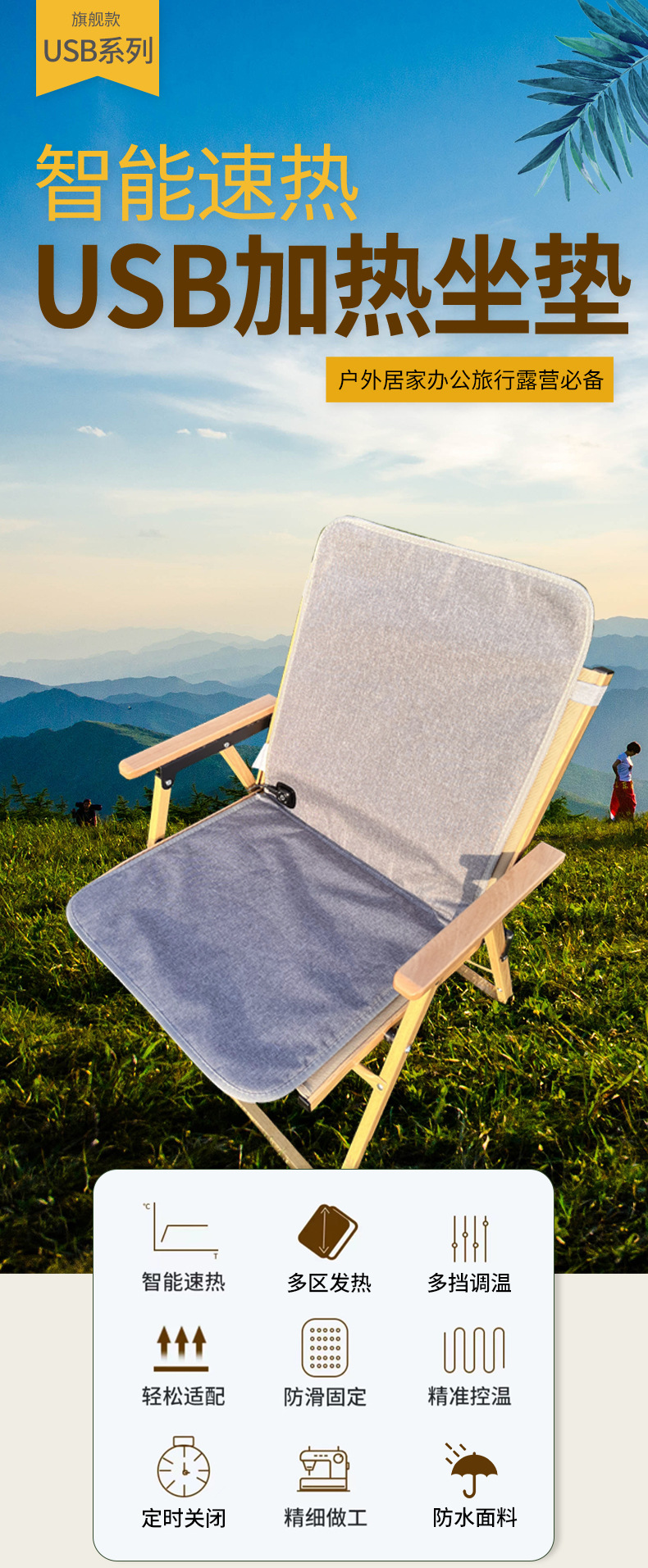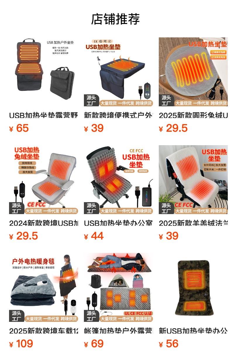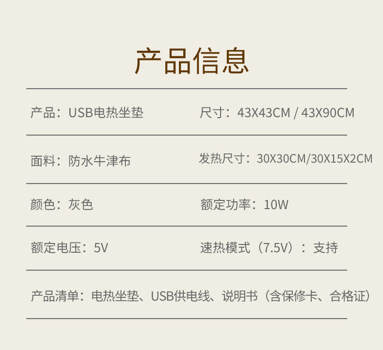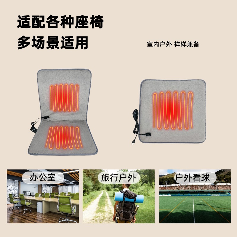 【USB坐垫】防水牛津布,内层定制加防水涂层,背部防滑布,填充物:无纺布+海绵,电阻丝加热;USB端口,43x43cm,额定电压:5V,额定功率10W,配置70度温控保护器;3挡控温,参考温度40-45-50;包装尺寸43x43x0.4,毛重量约240g;跨境无认证、端口担忧;