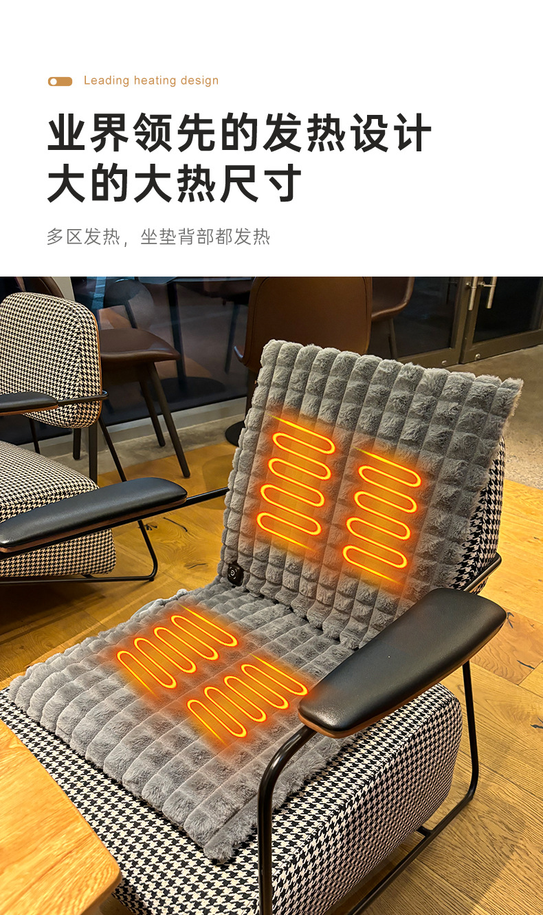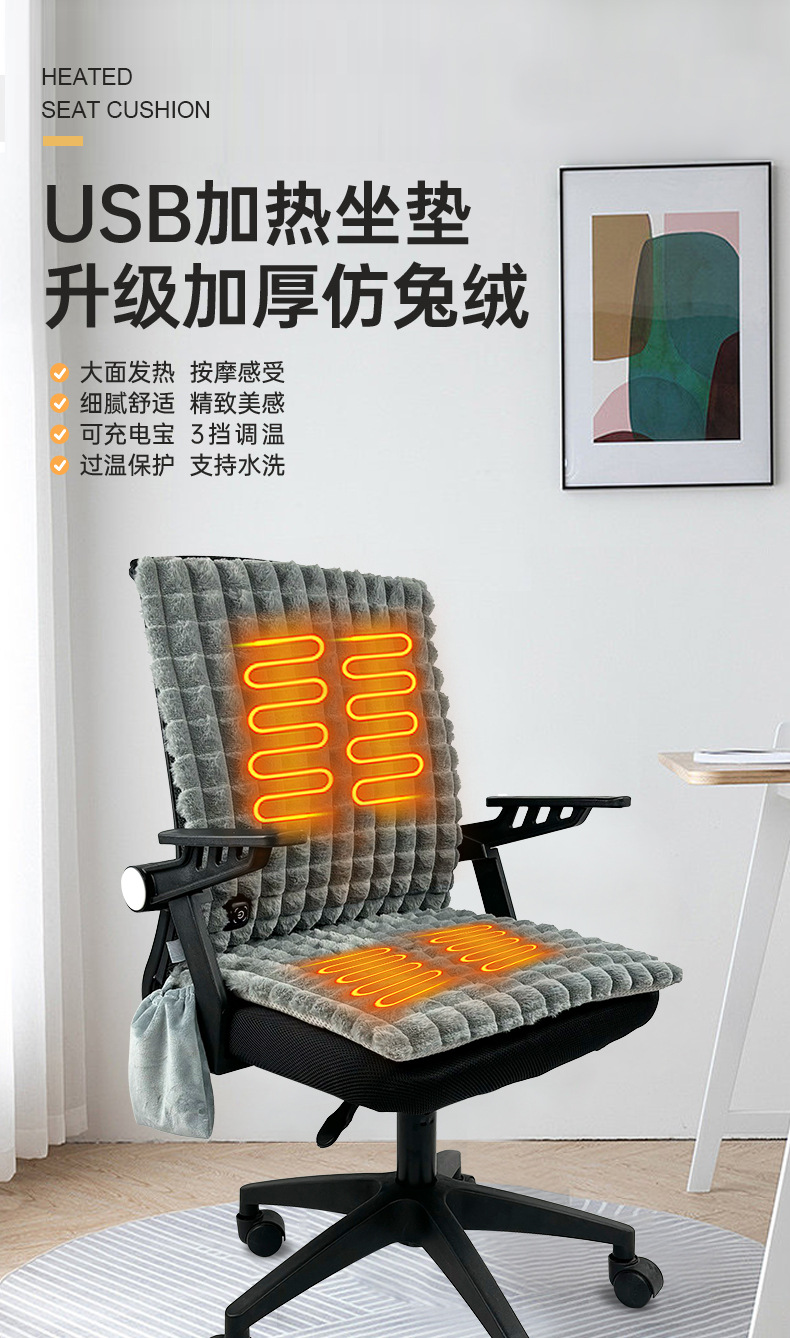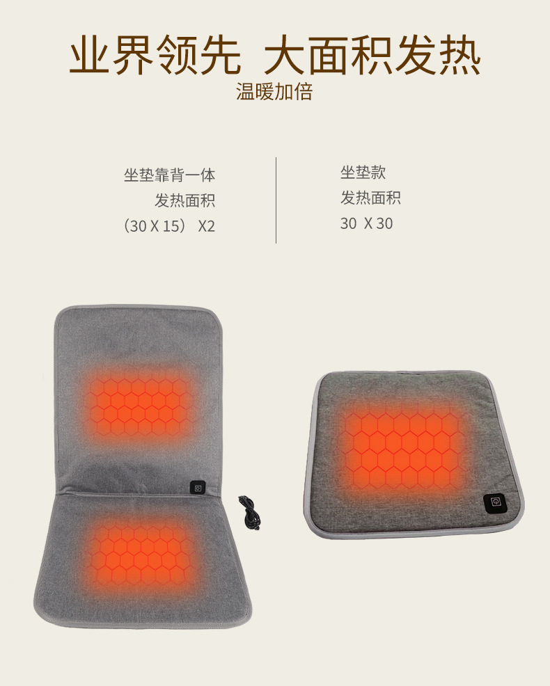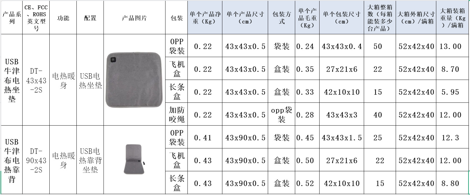 【USB带靠背坐垫】防水牛津布,内层定制加防水涂层,背部防滑布,填充物:无纺布+海绵,电阻丝加热;USB端口,43x90cm,额定电压5V,额定功率10W,配置70度温控器,2X2区发热区;3挡控温,参考温度40-45-50;包装尺寸43x43x1.5,毛重量约400g;跨境无认证、端口担忧;箱规52X42X38cm,25件,约11kg;