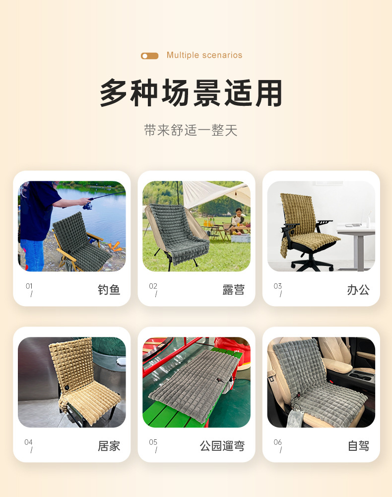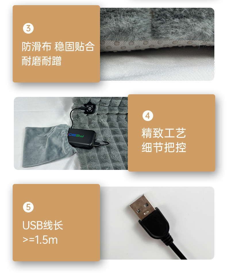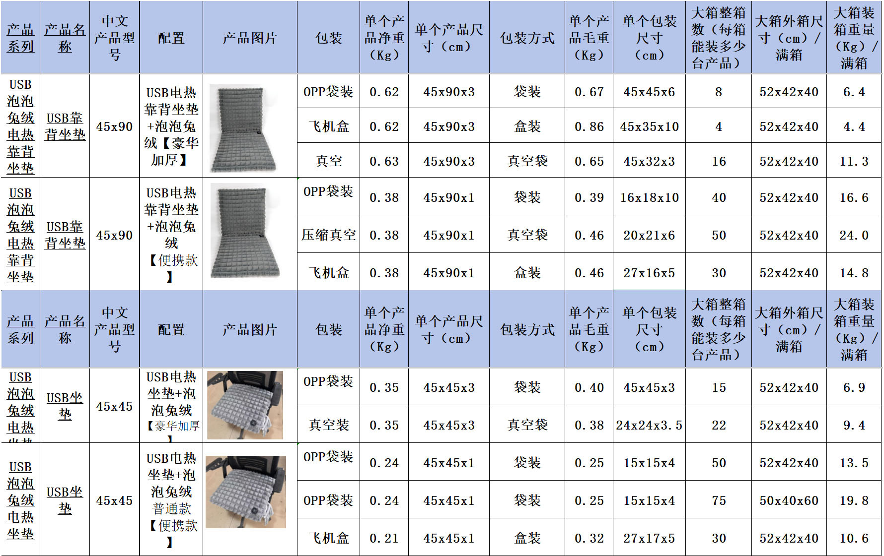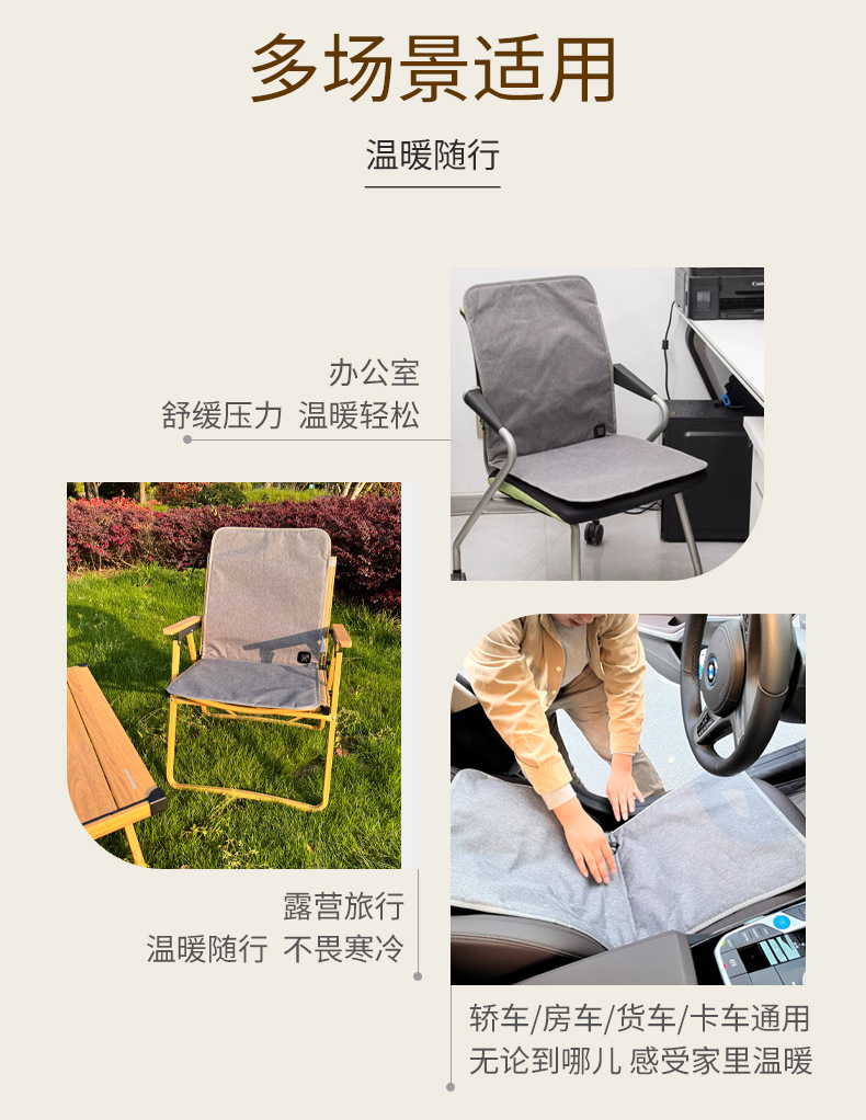 【USB带靠背坐垫】防水牛津布,内层定制加防水涂层,背部防滑布,填充物:无纺布+海绵,电阻丝加热;USB端口,43x90cm,额定电压5V,额定功率10W,配置70度温控器,2X2区发热区;3挡控温,参考温度40-45-50;包装尺寸43x43x1.5,毛重量约400g;跨境无认证、端口担忧;箱规52X42X38cm,25件,约11kg;