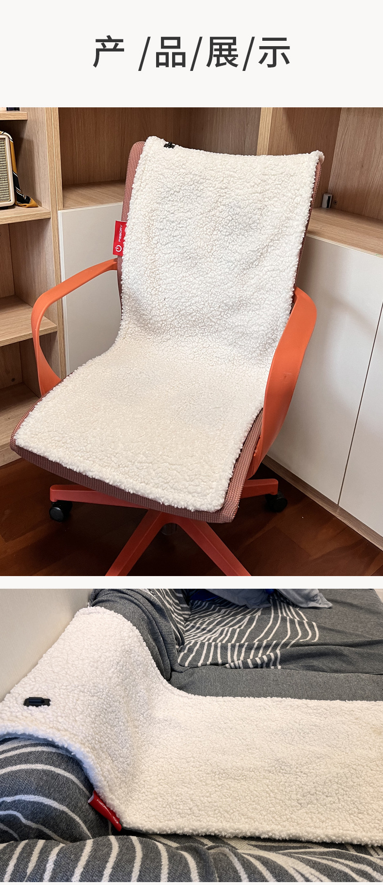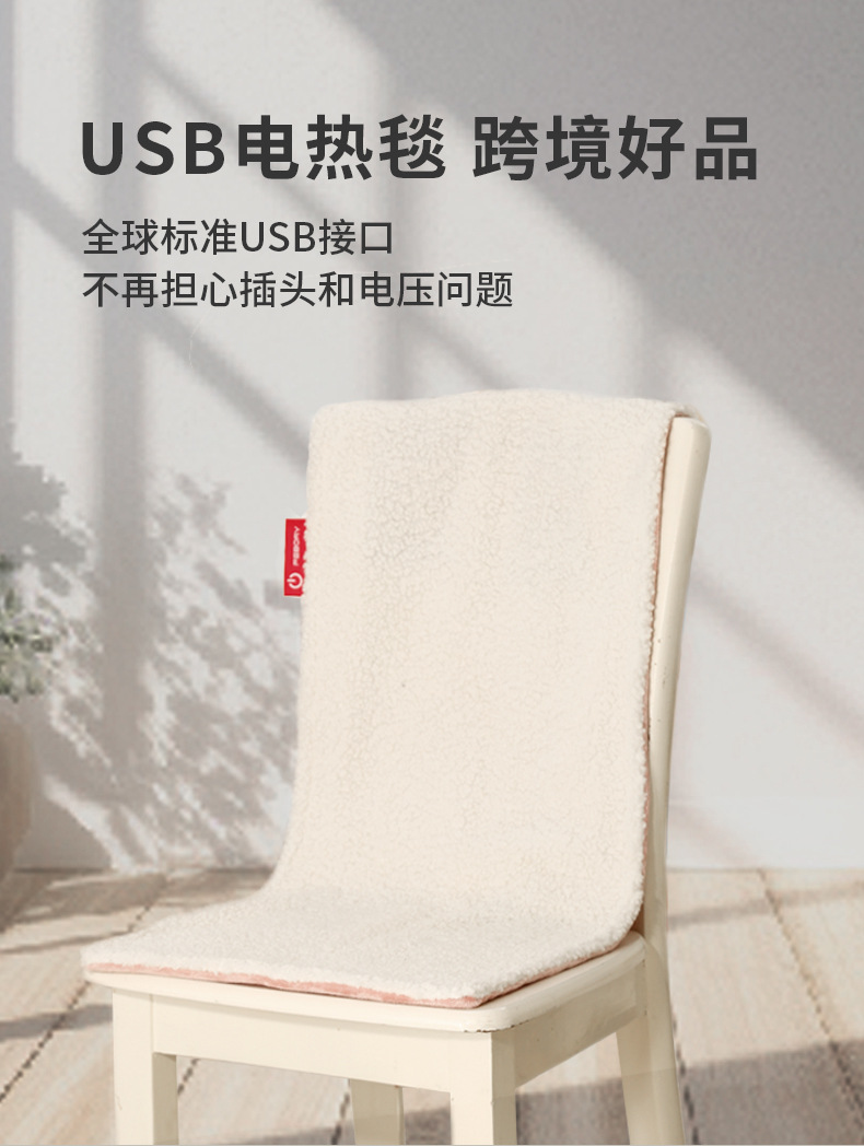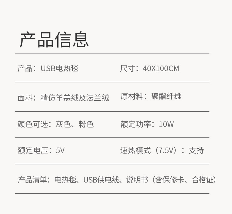 新款【加厚羊羔绒+超柔法兰绒】;白+灰,白+粉,2色可选;usb端口,100x40cm,5V,额定功率10W,配置70度温控保护器,线控5挡控温,参考温度35-40-45-50-55;包赚参数约:净重410g,毛重430g,产品尺寸100x40x2cm,默认包装38x24x4cm(可改小袋子装32x28x10cm),外箱52X42X40cm,20件,9.6kg;