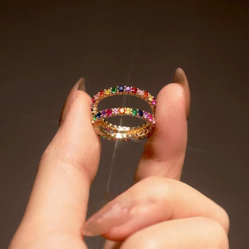 七色のドリルの指輪の女性の大衆の軽豪華なネットの赤いinsの潮の気質の人差指の精巧な1列のドリルは18kの金の指輪をめっきします。