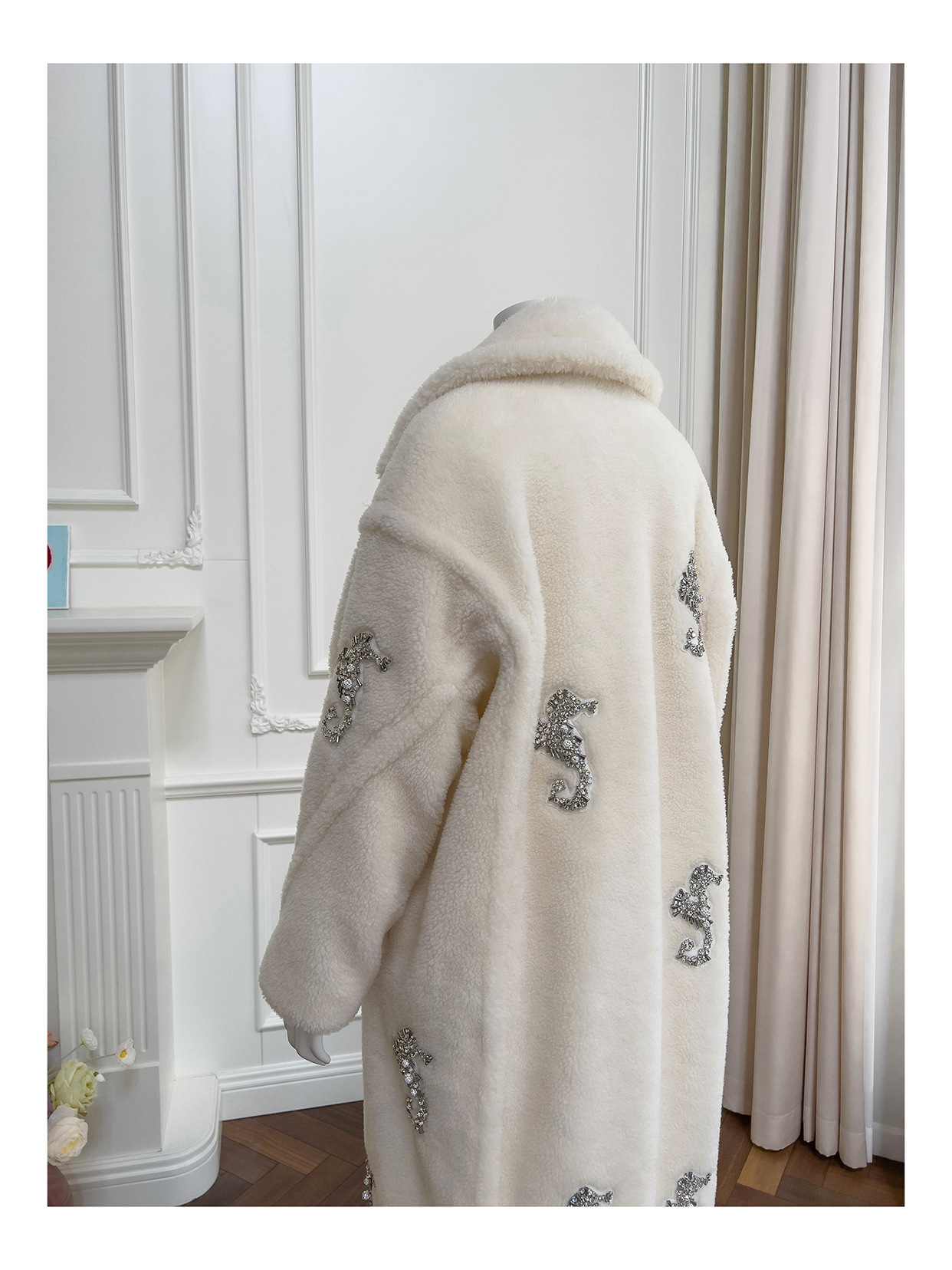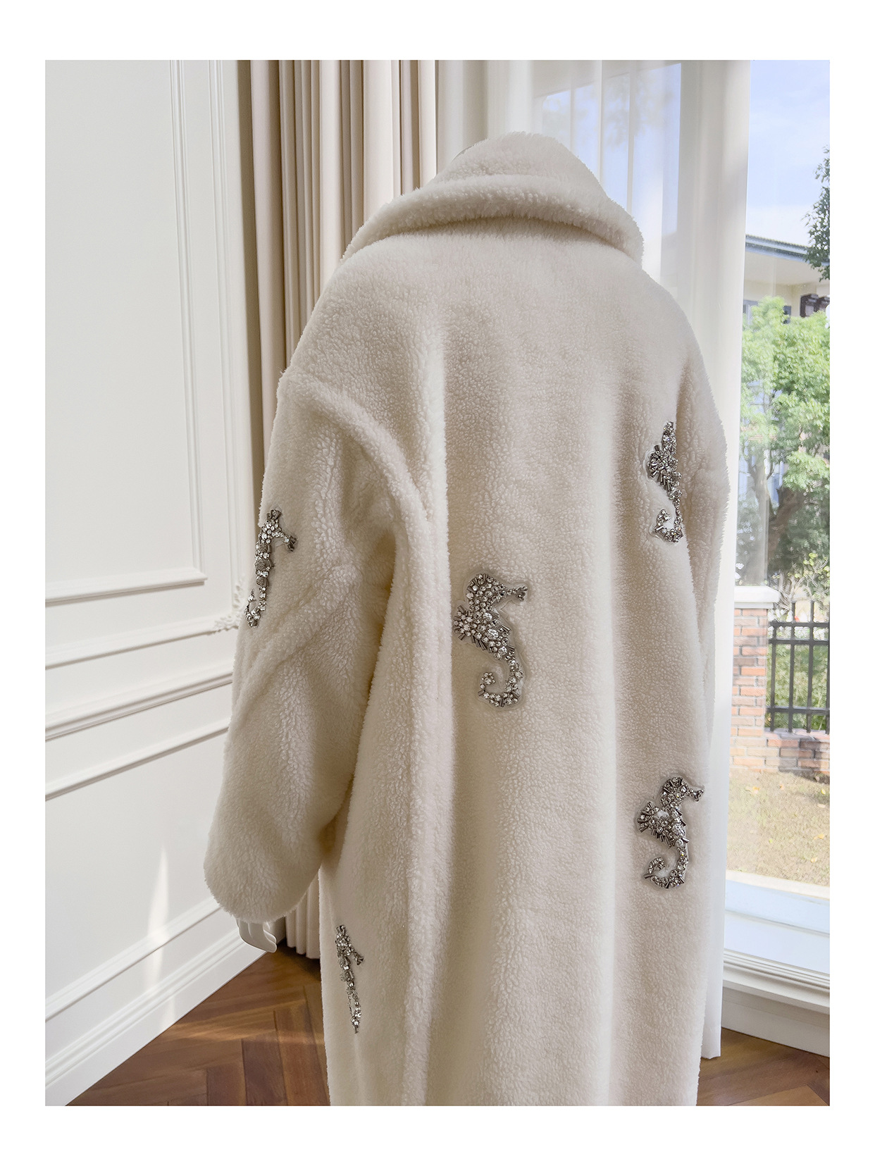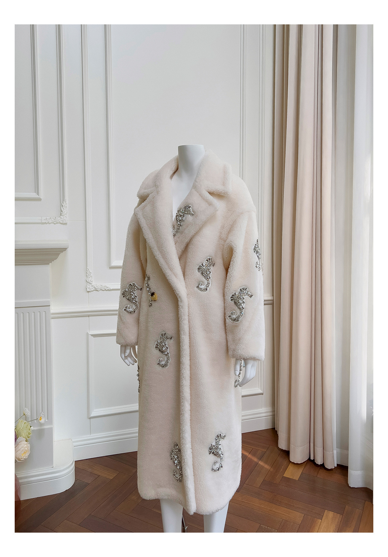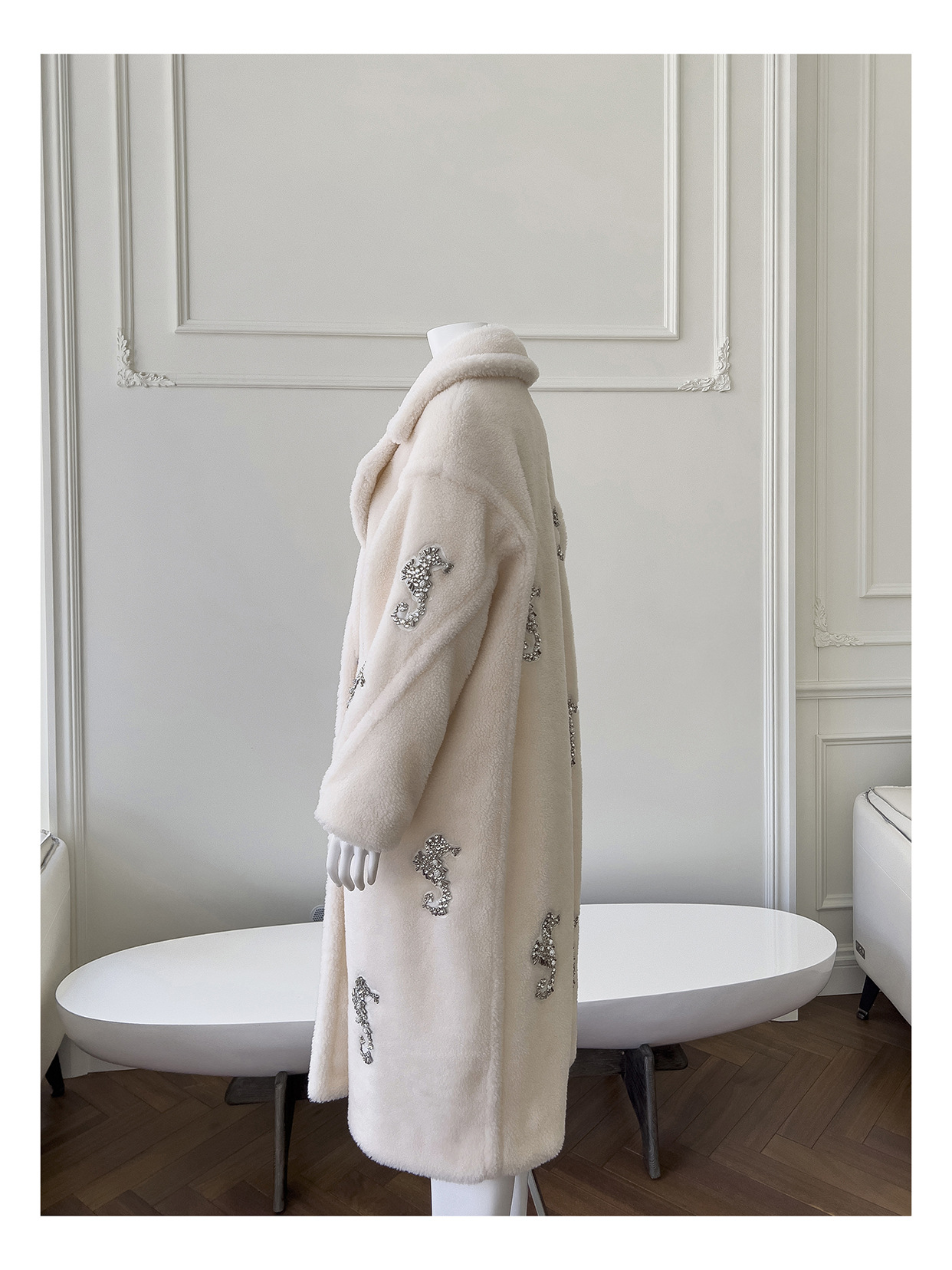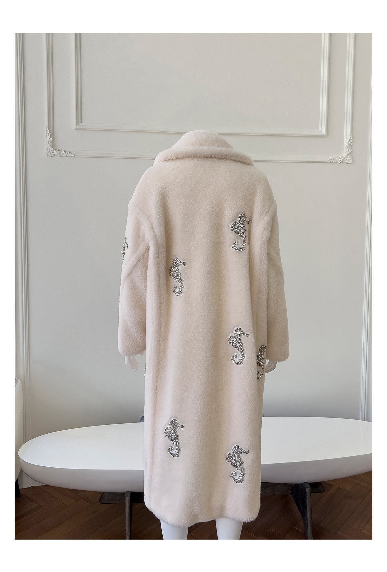 2025 新しい手刺繍タツノオトシゴ明るいダイヤモンドとスパンコール装飾ロングホワイトぬいぐるみテディコート女性用