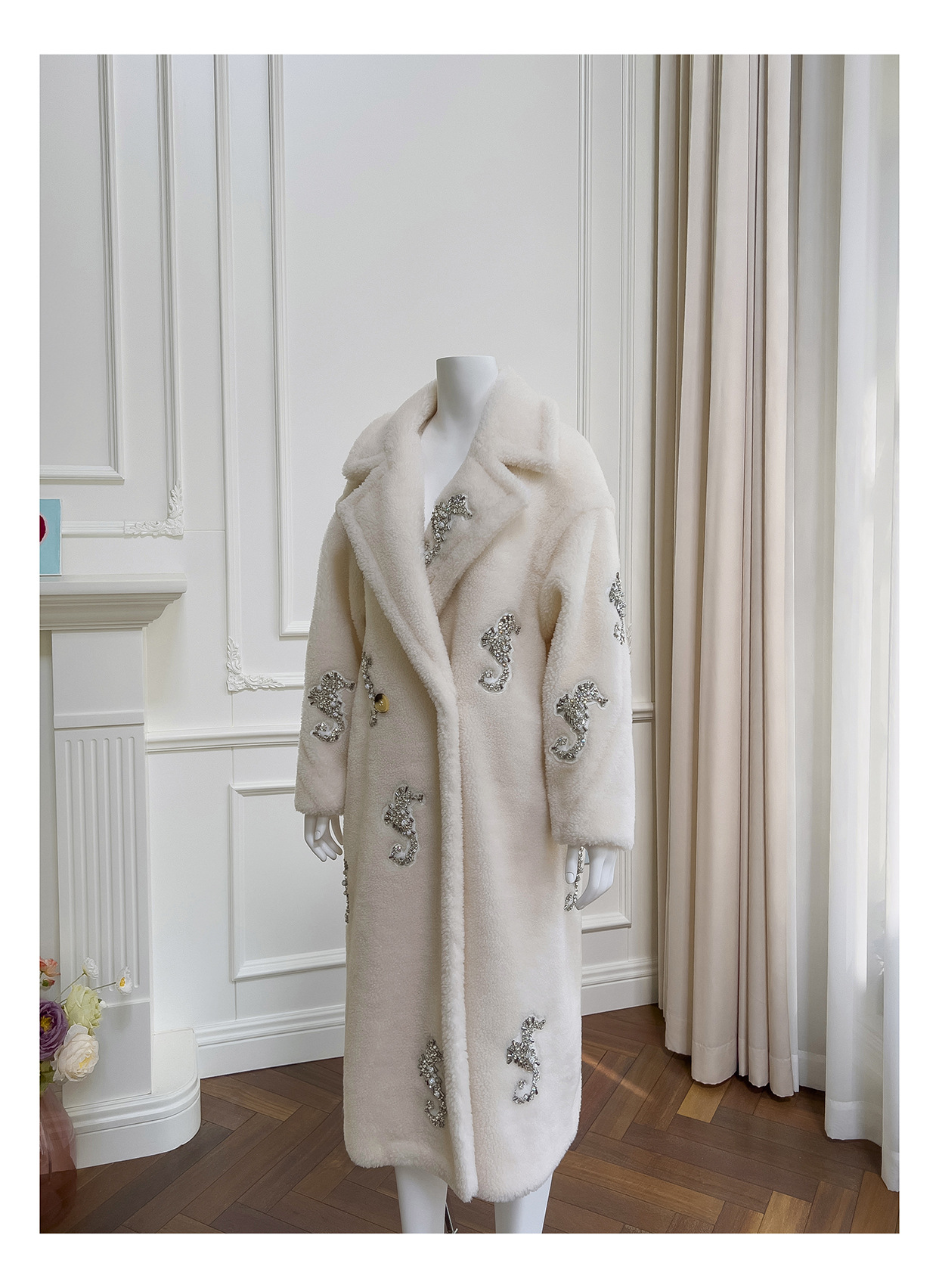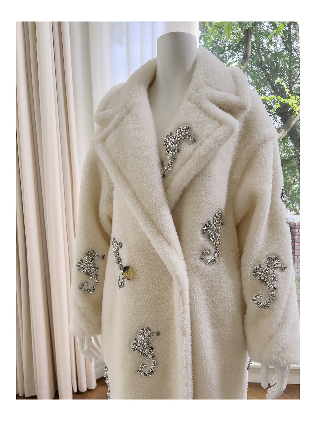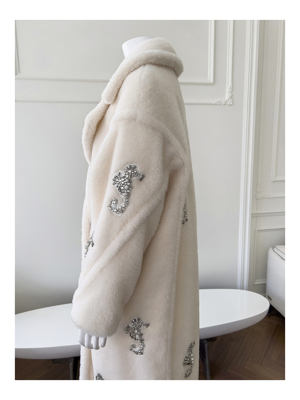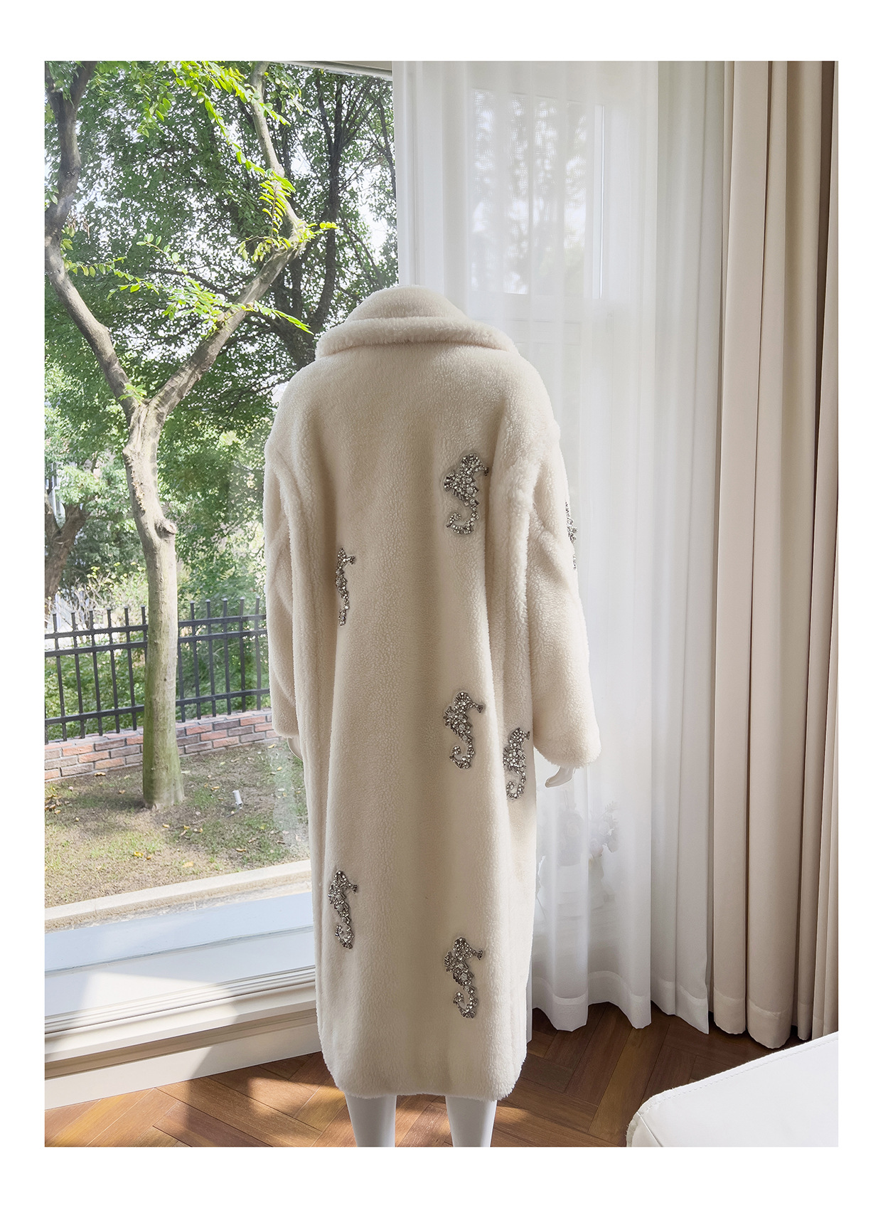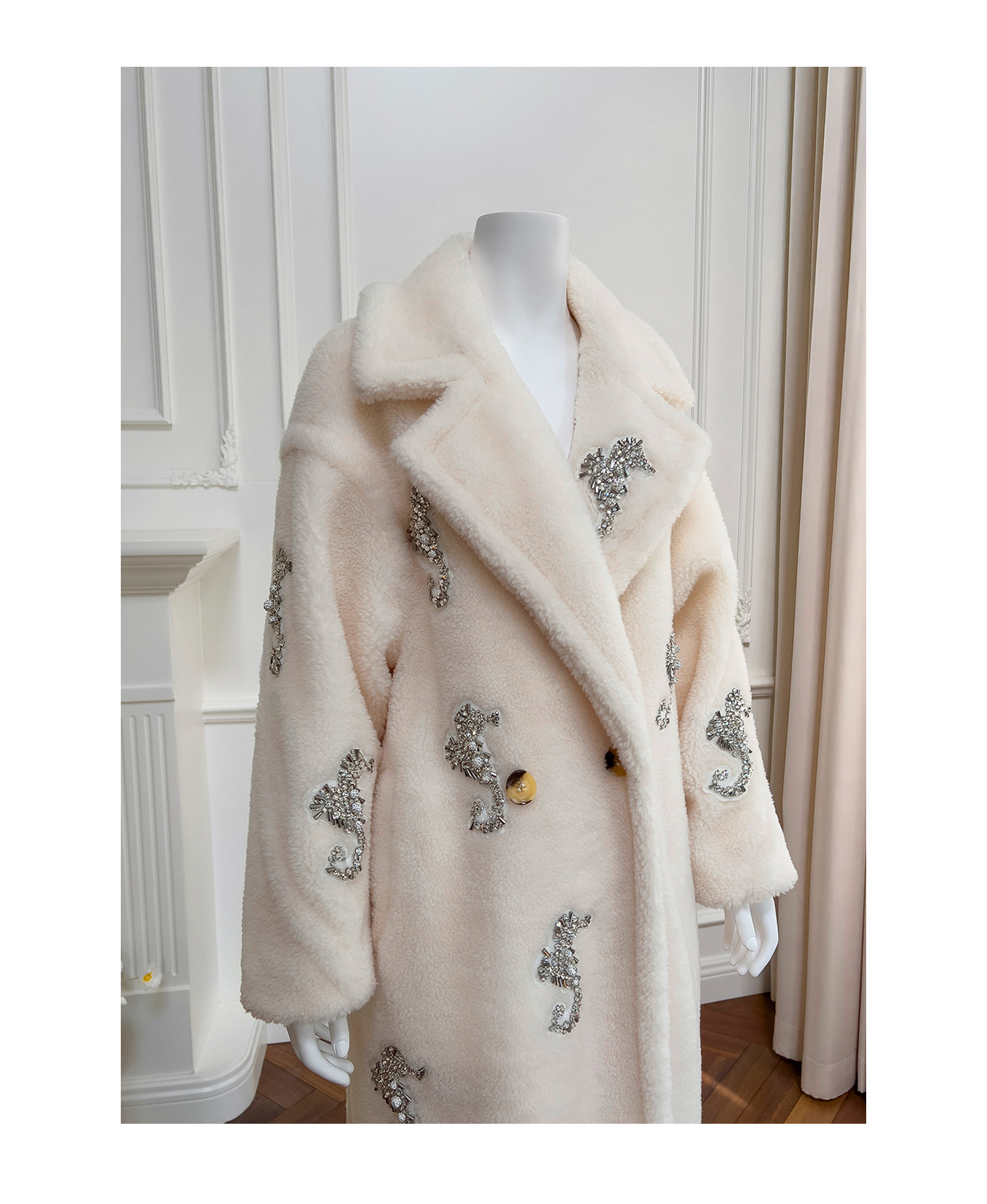 2025 新しい手刺繍タツノオトシゴ明るいダイヤモンドとスパンコール装飾ロングホワイトぬいぐるみテディコート女性用