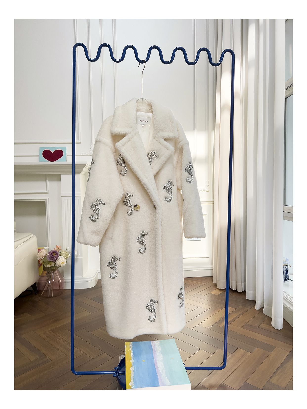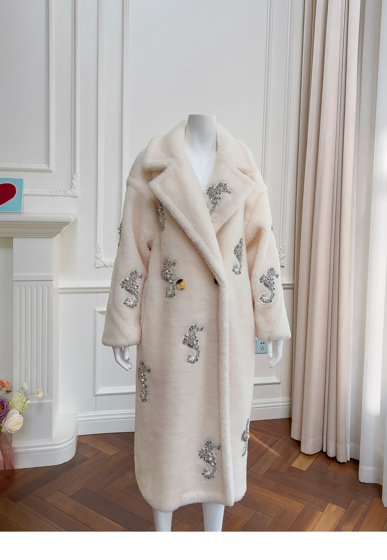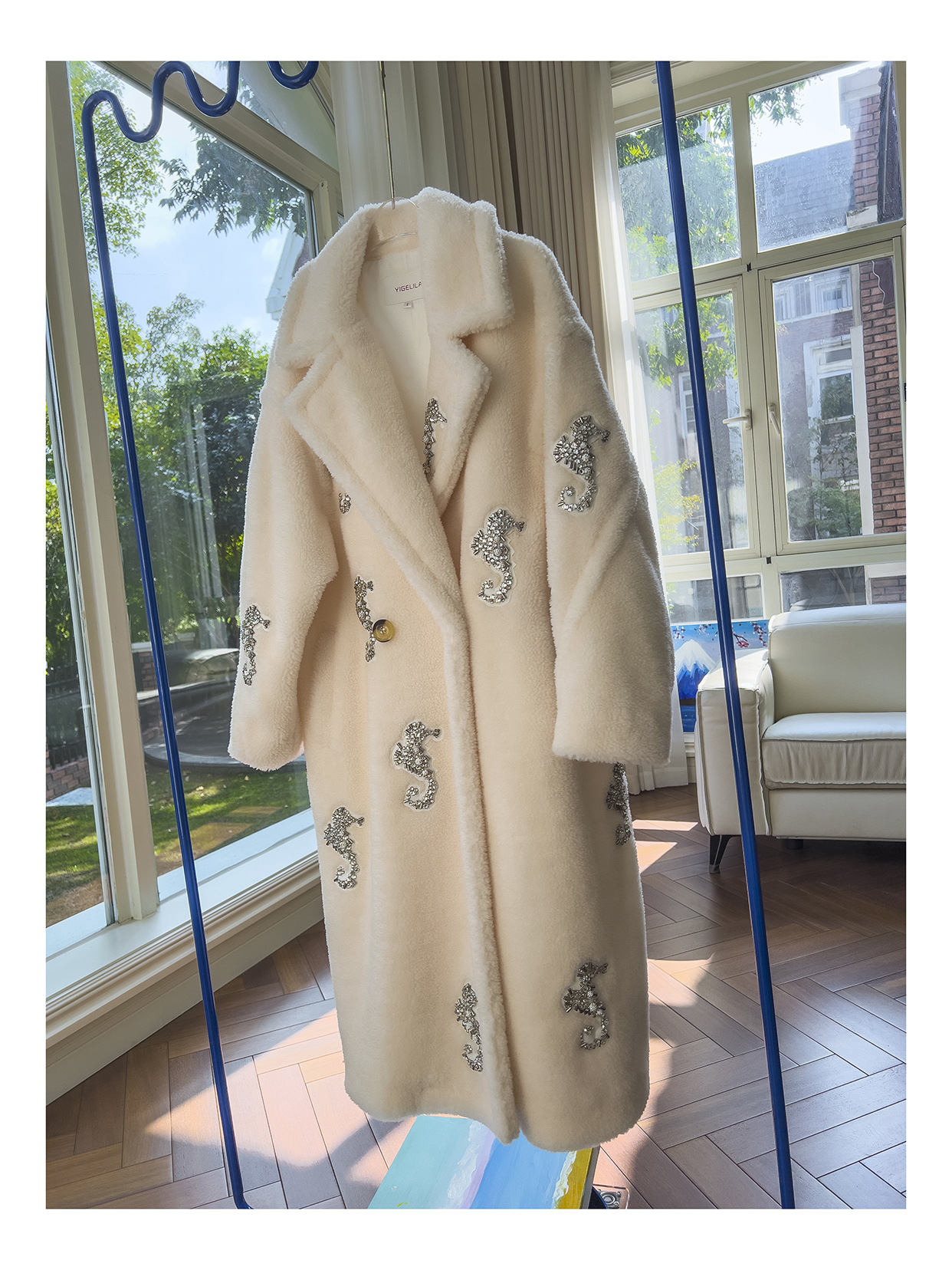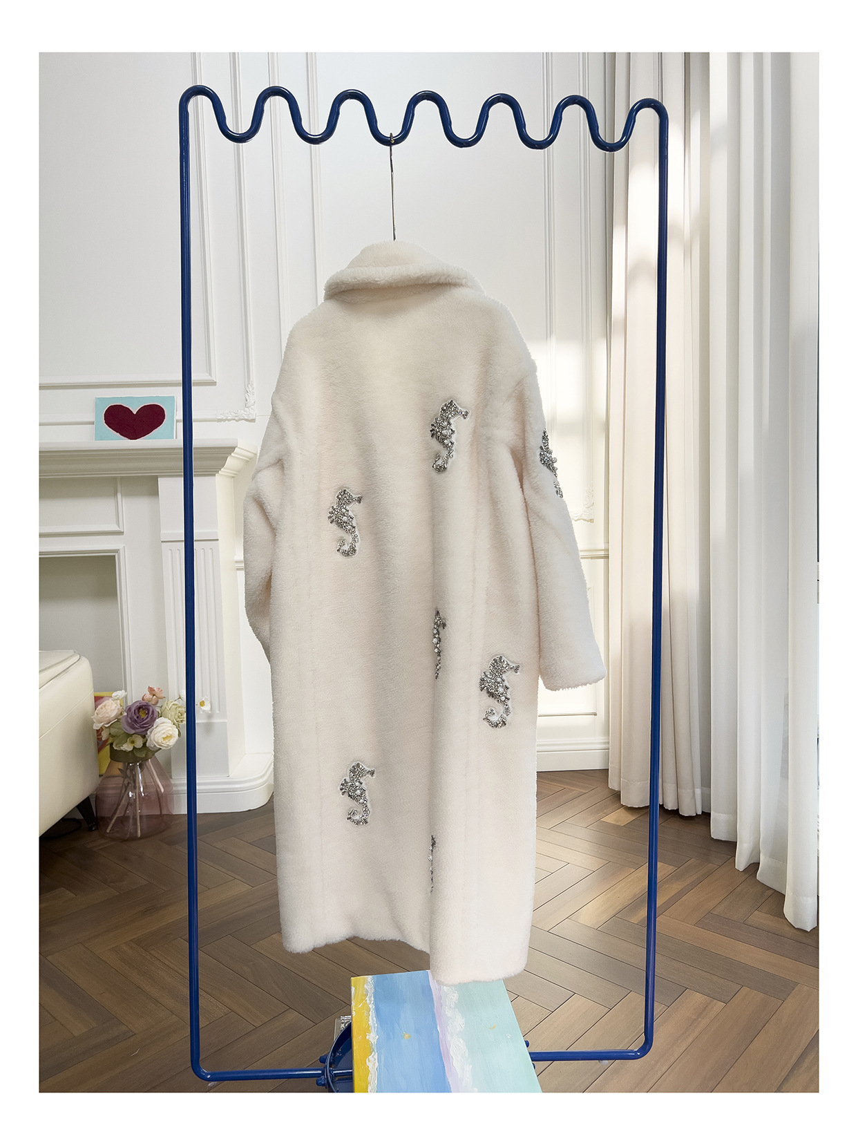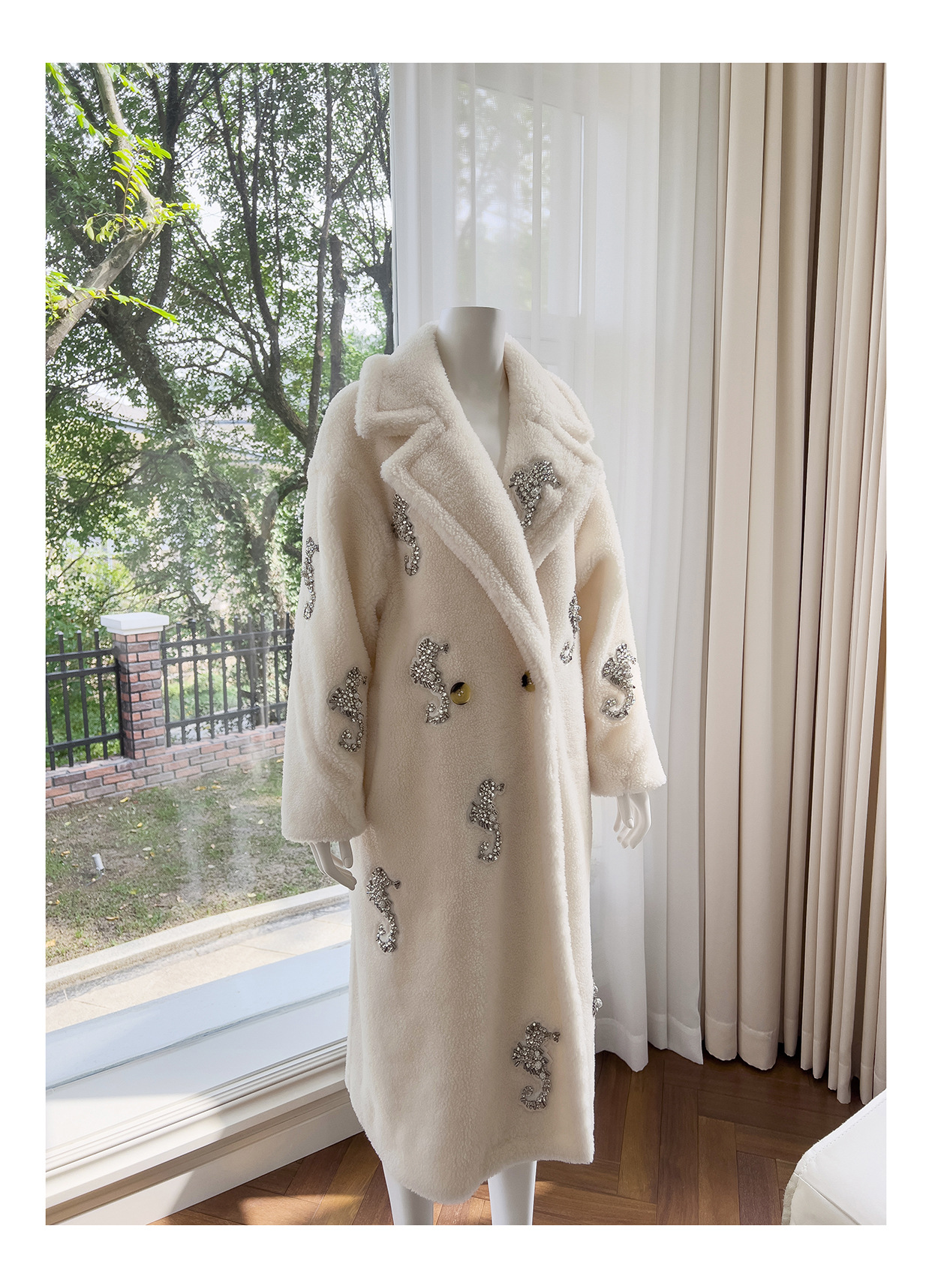 2025 新しい手刺繍タツノオトシゴ明るいダイヤモンドとスパンコール装飾ロングホワイトぬいぐるみテディコート女性用