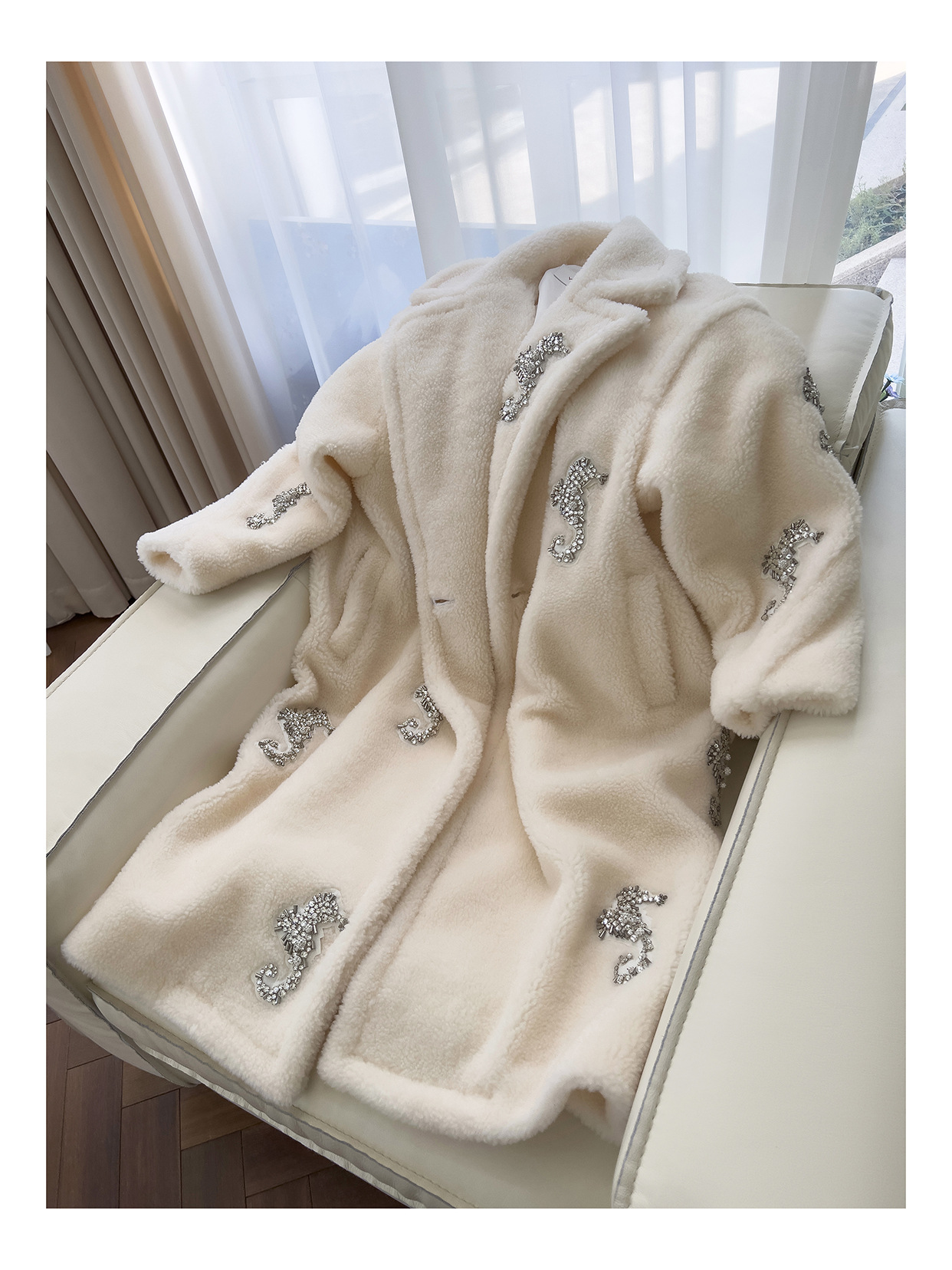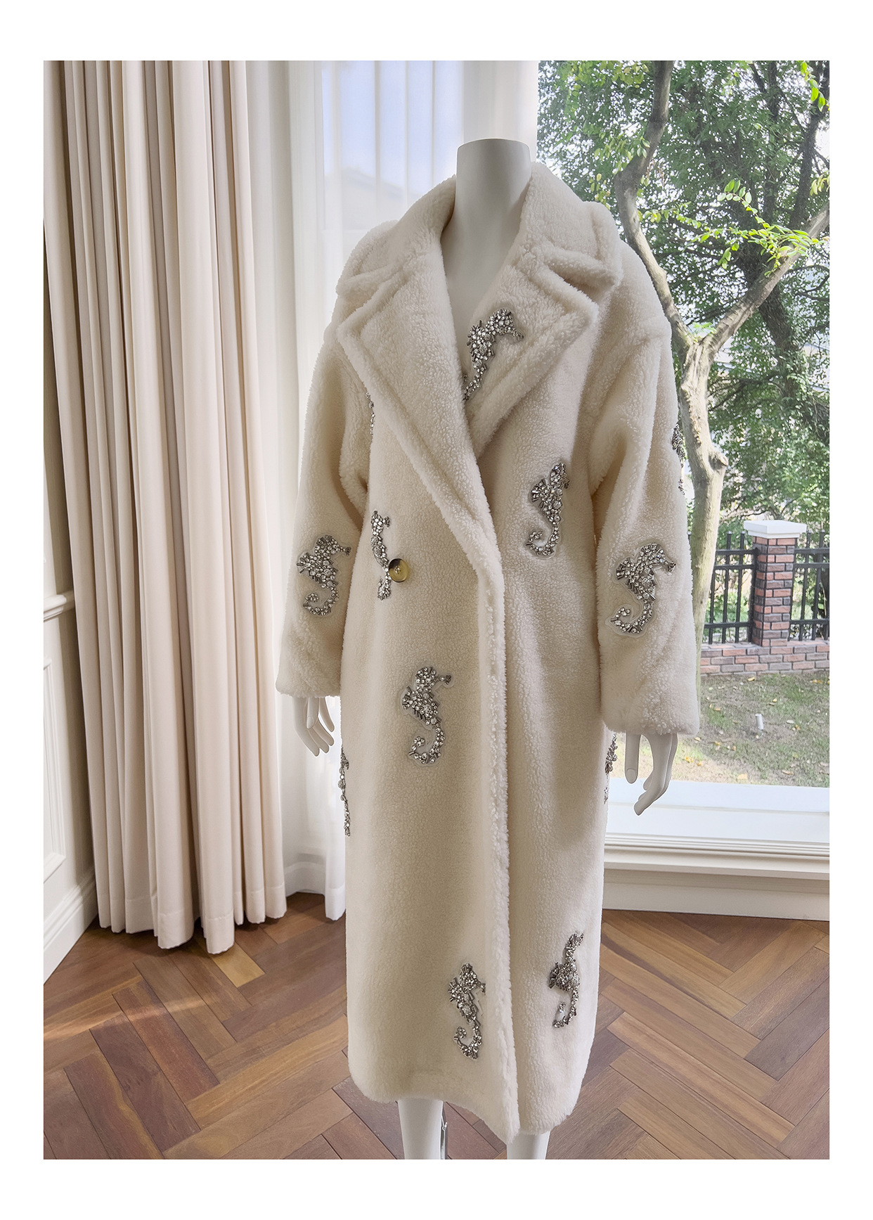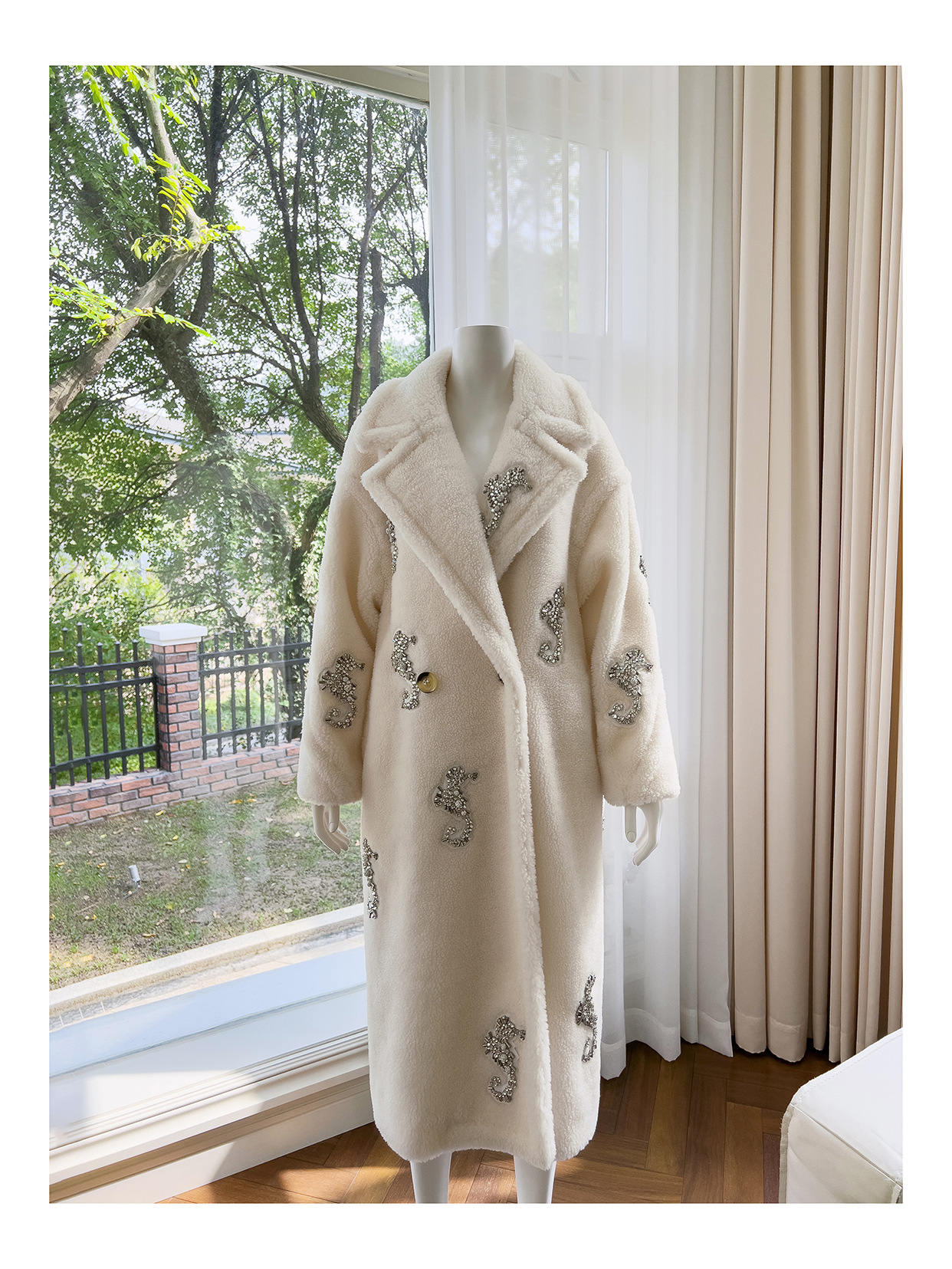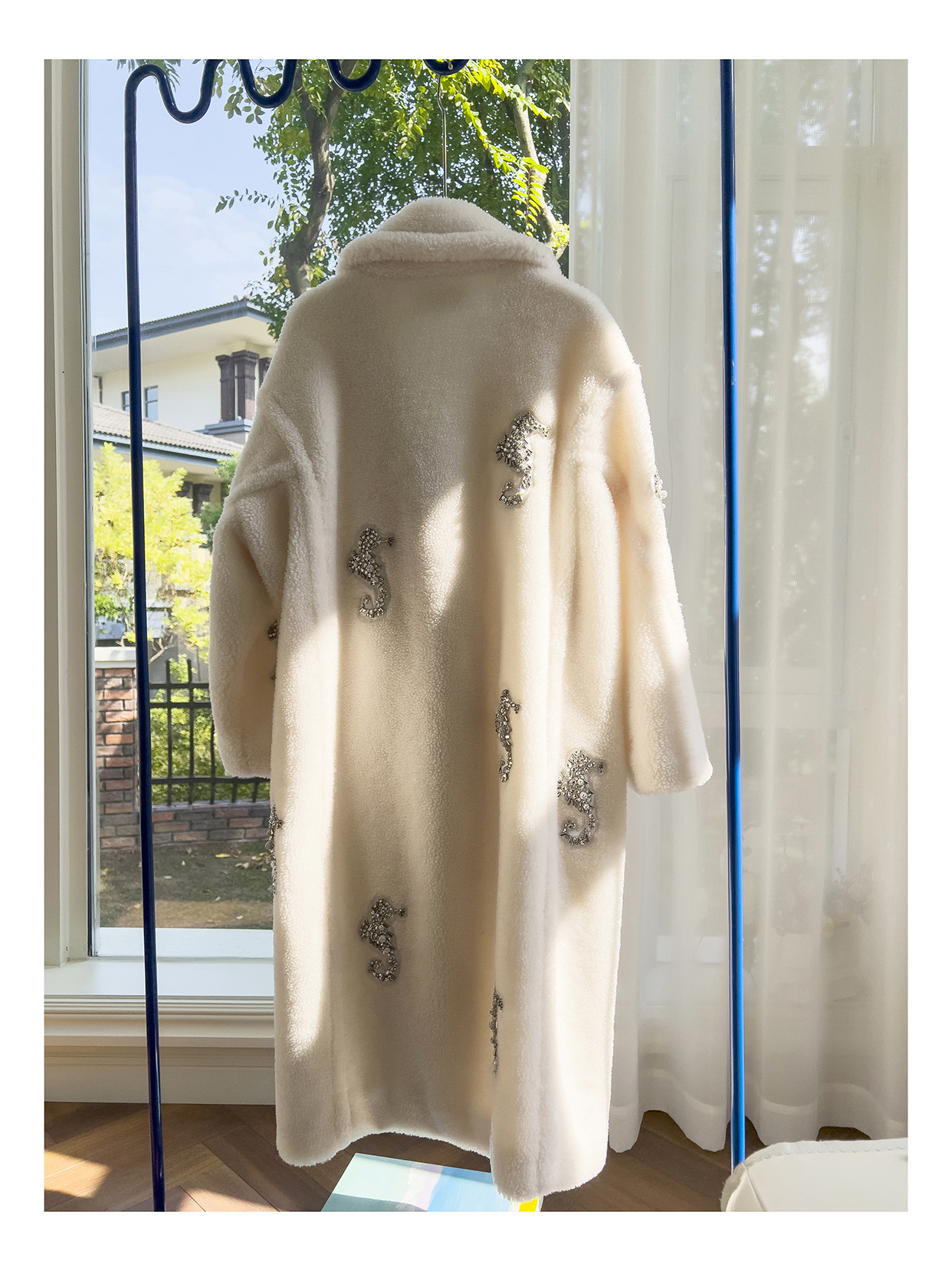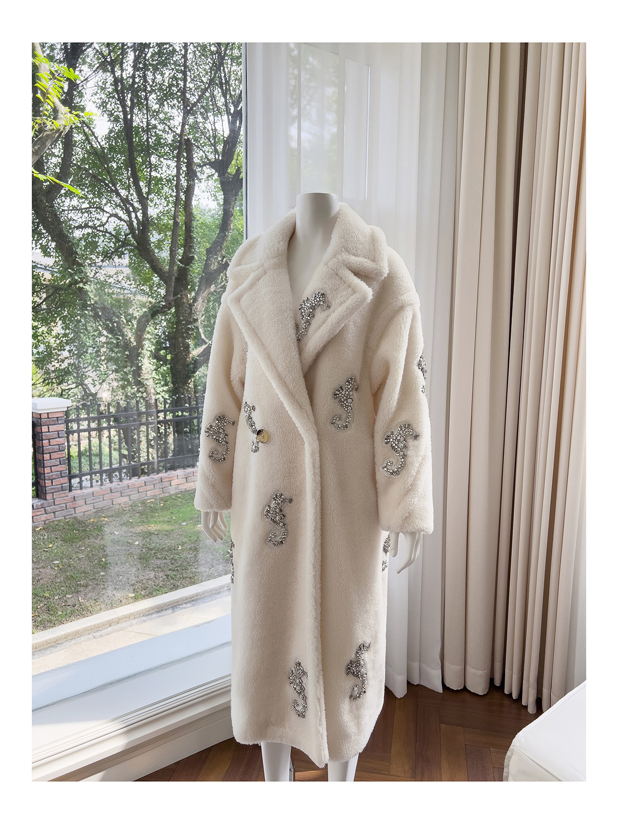 2025 新しい手刺繍タツノオトシゴ明るいダイヤモンドとスパンコール装飾ロングホワイトぬいぐるみテディコート女性用