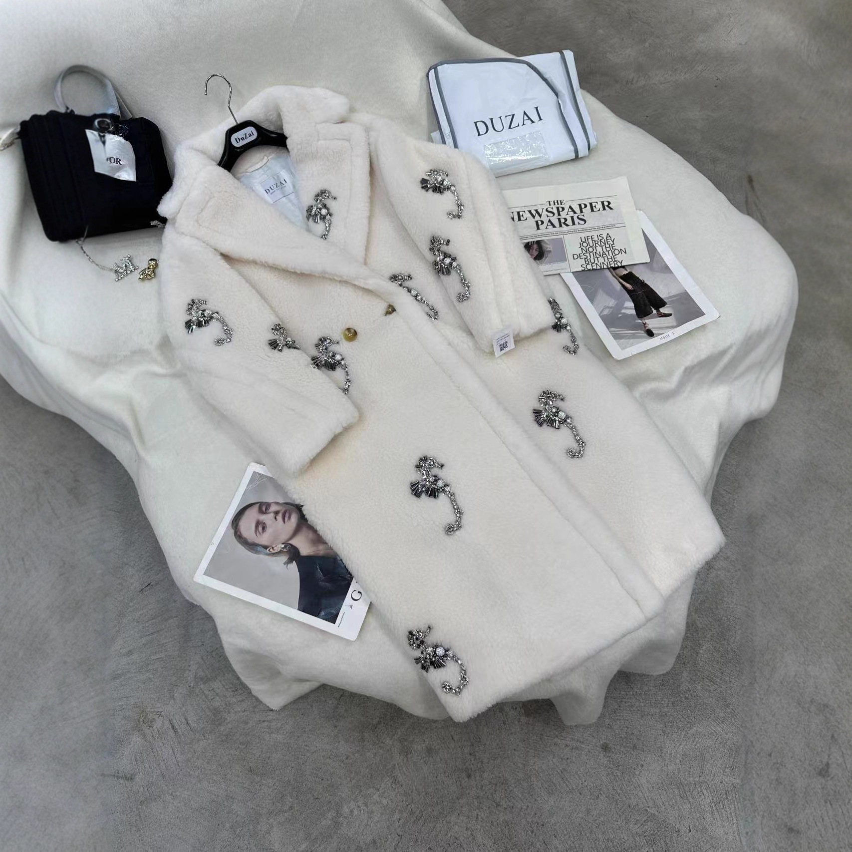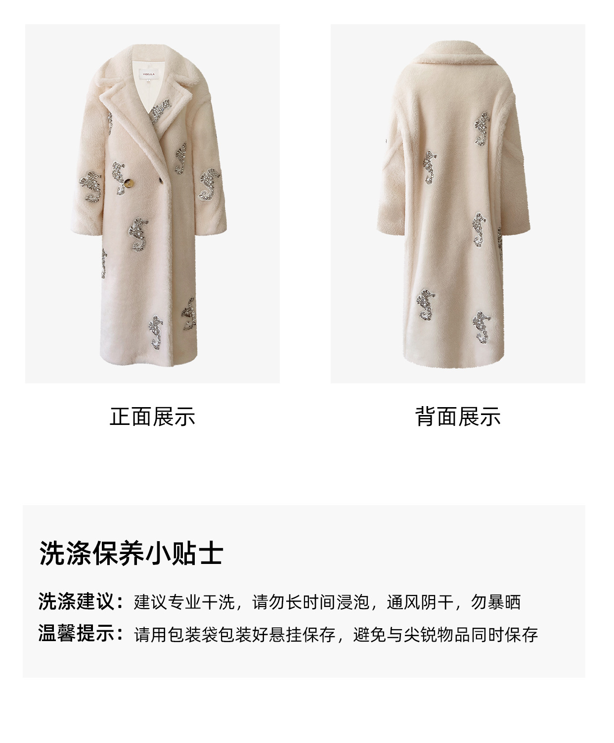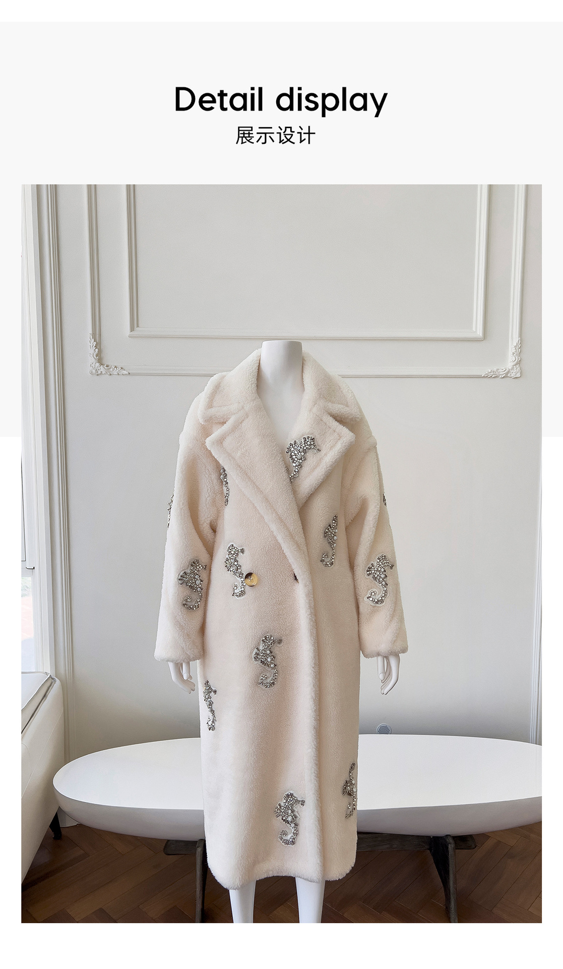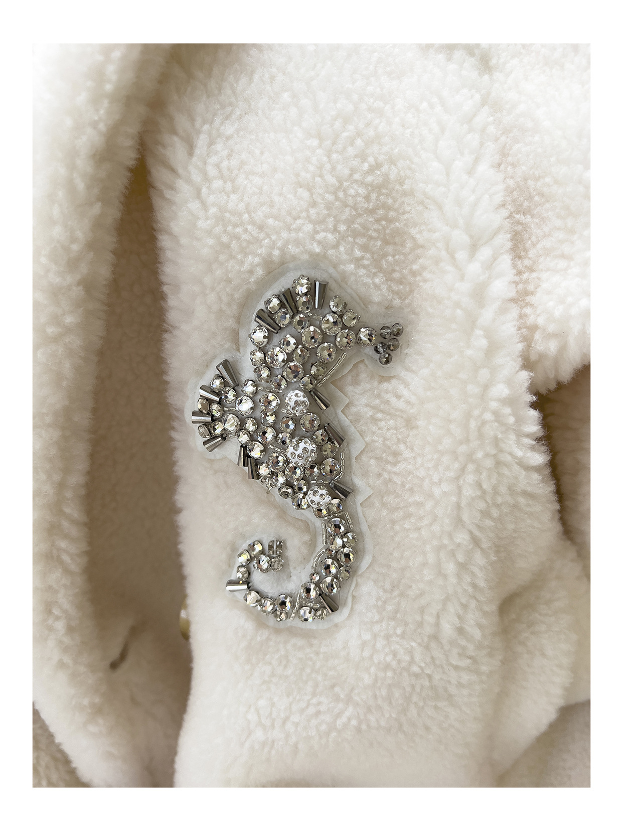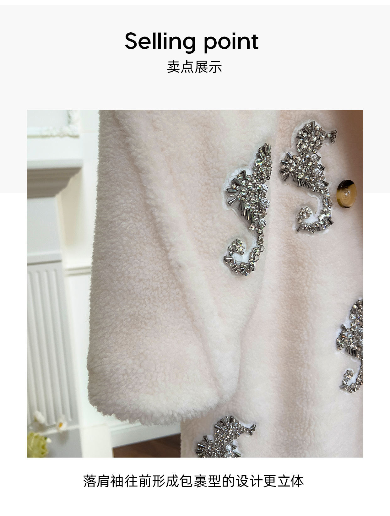 2025 新しい手刺繍タツノオトシゴ明るいダイヤモンドとスパンコール装飾ロングホワイトぬいぐるみテディコート女性用