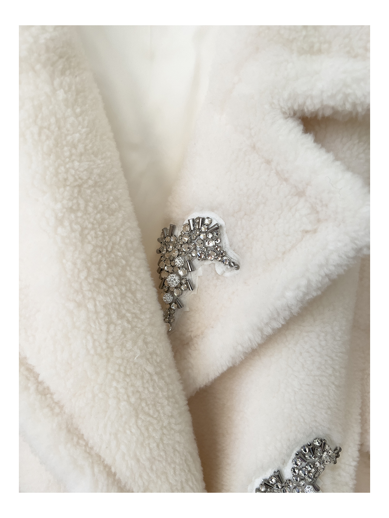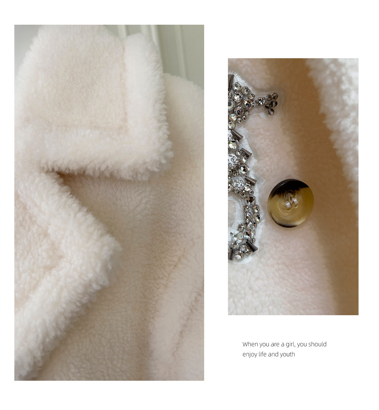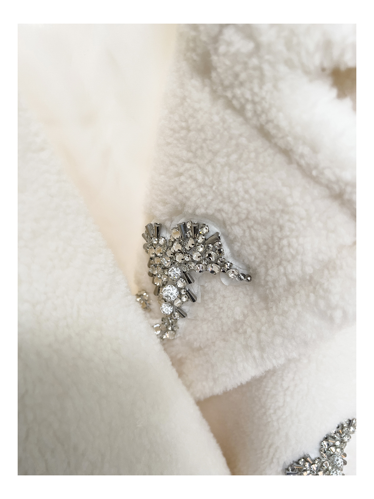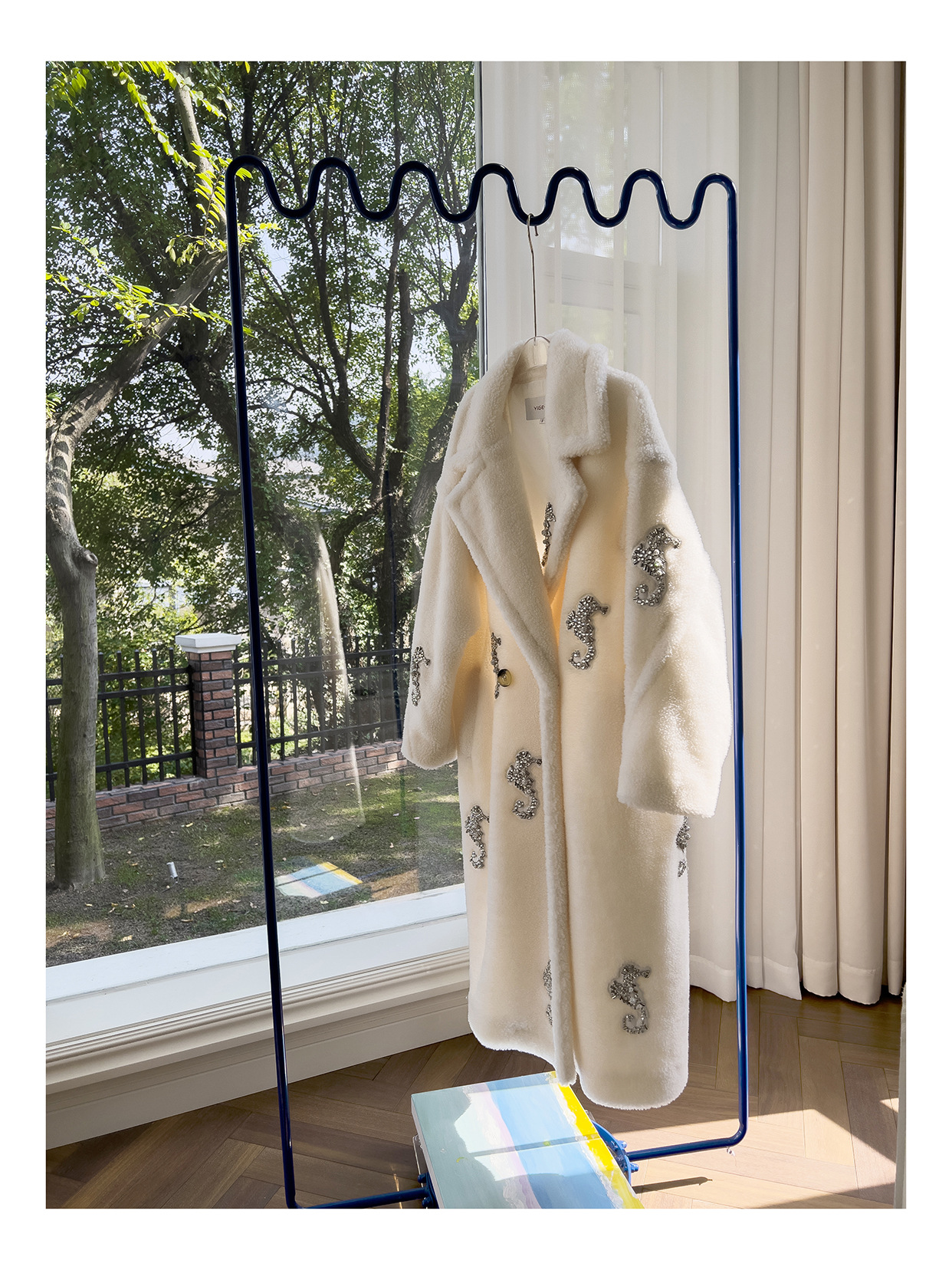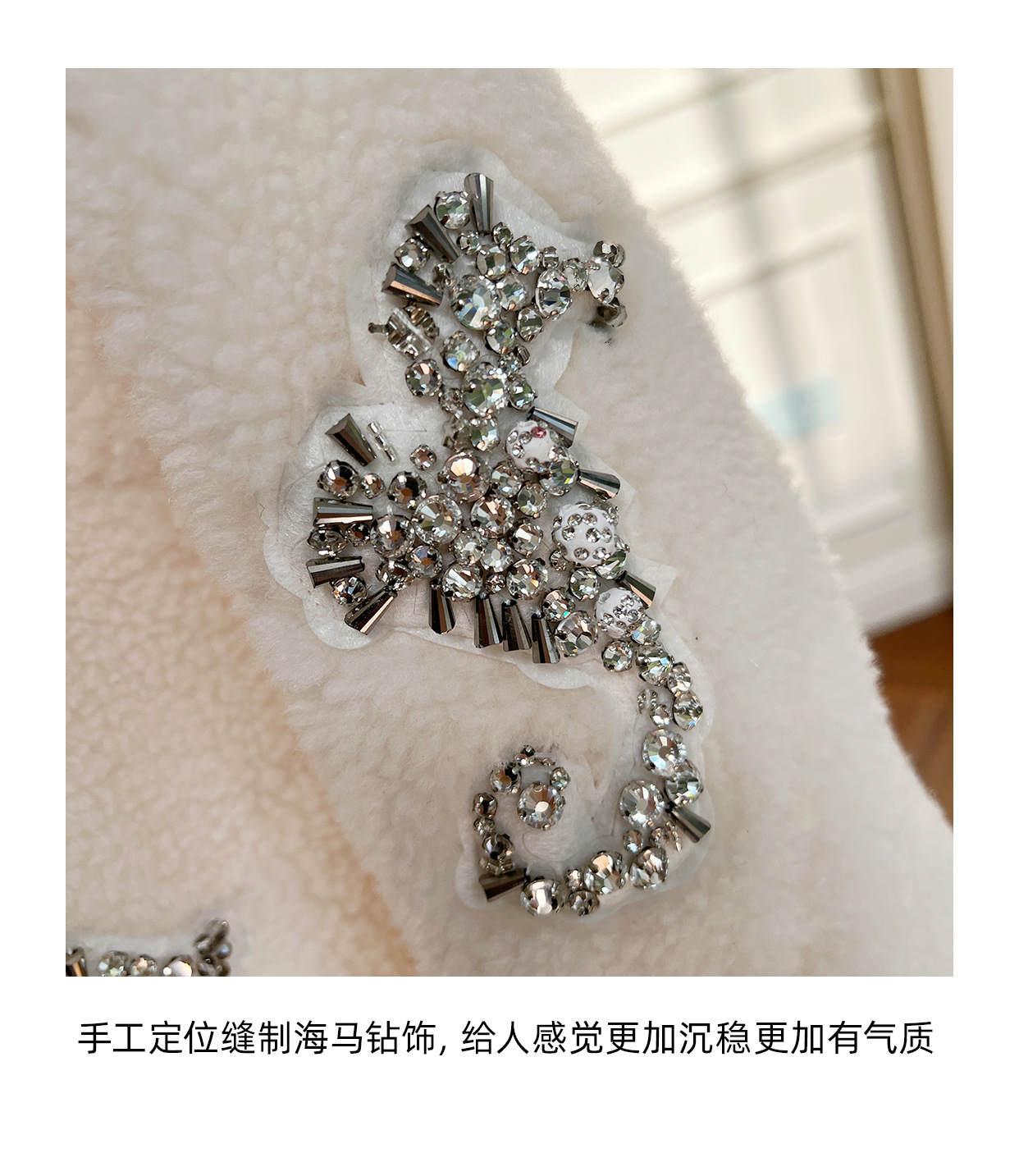 2025 新しい手刺繍タツノオトシゴ明るいダイヤモンドとスパンコール装飾ロングホワイトぬいぐるみテディコート女性用