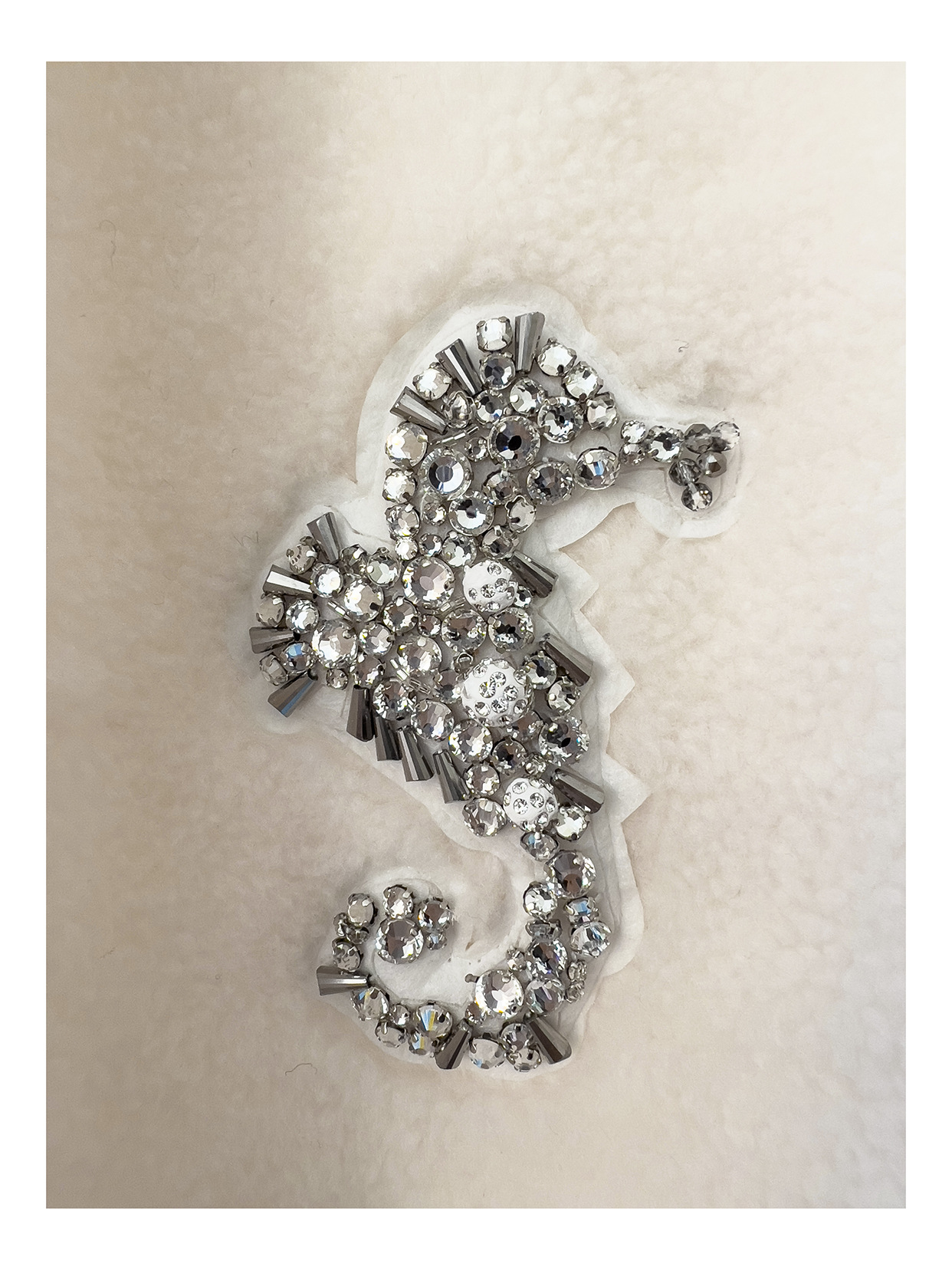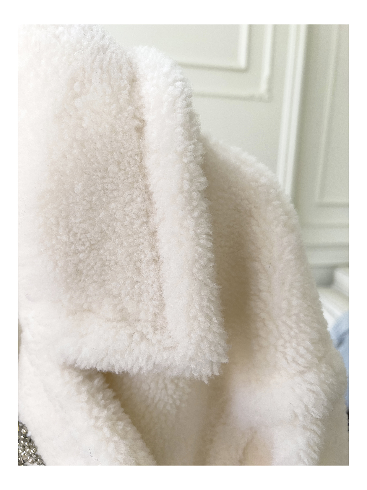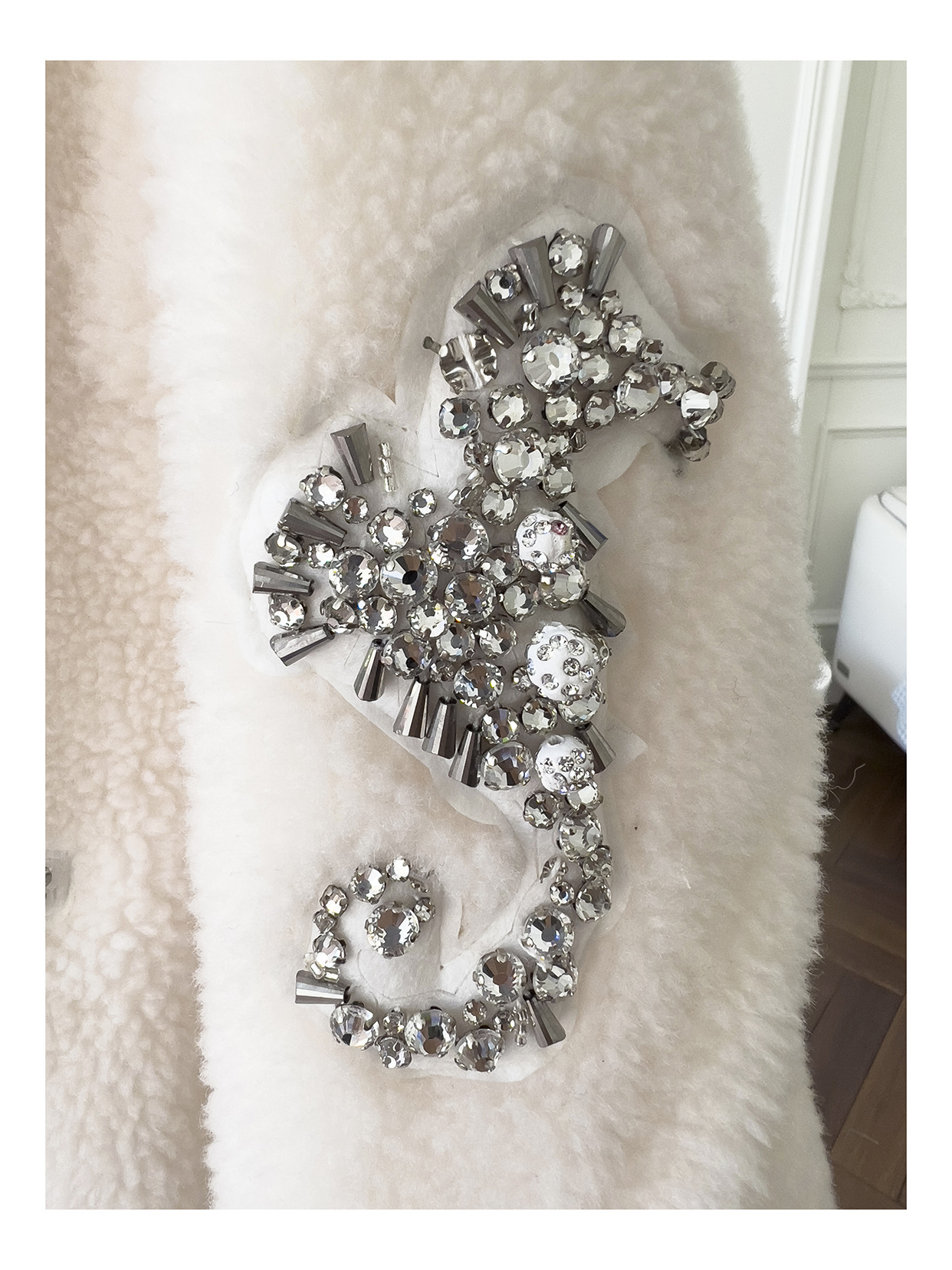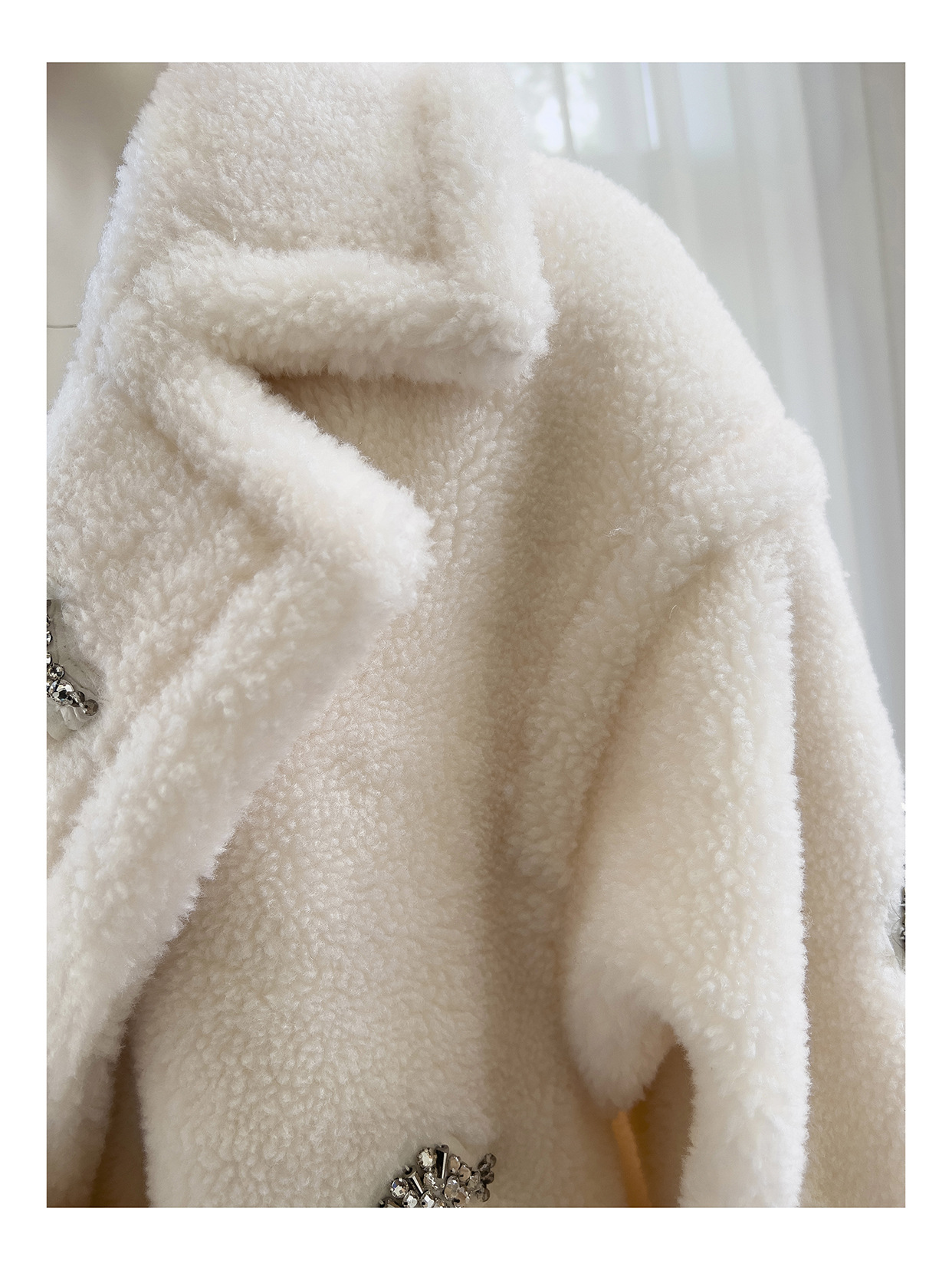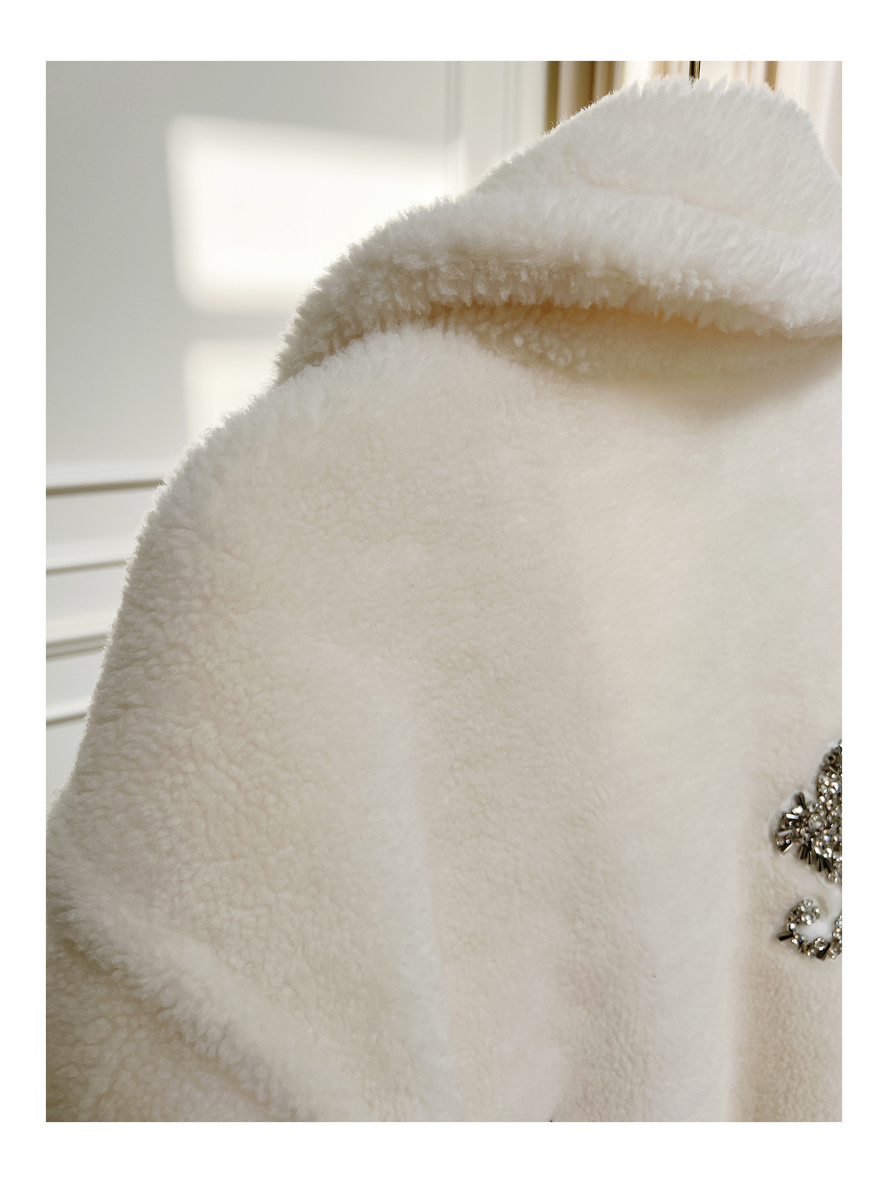 2025 新しい手刺繍タツノオトシゴ明るいダイヤモンドとスパンコール装飾ロングホワイトぬいぐるみテディコート女性用