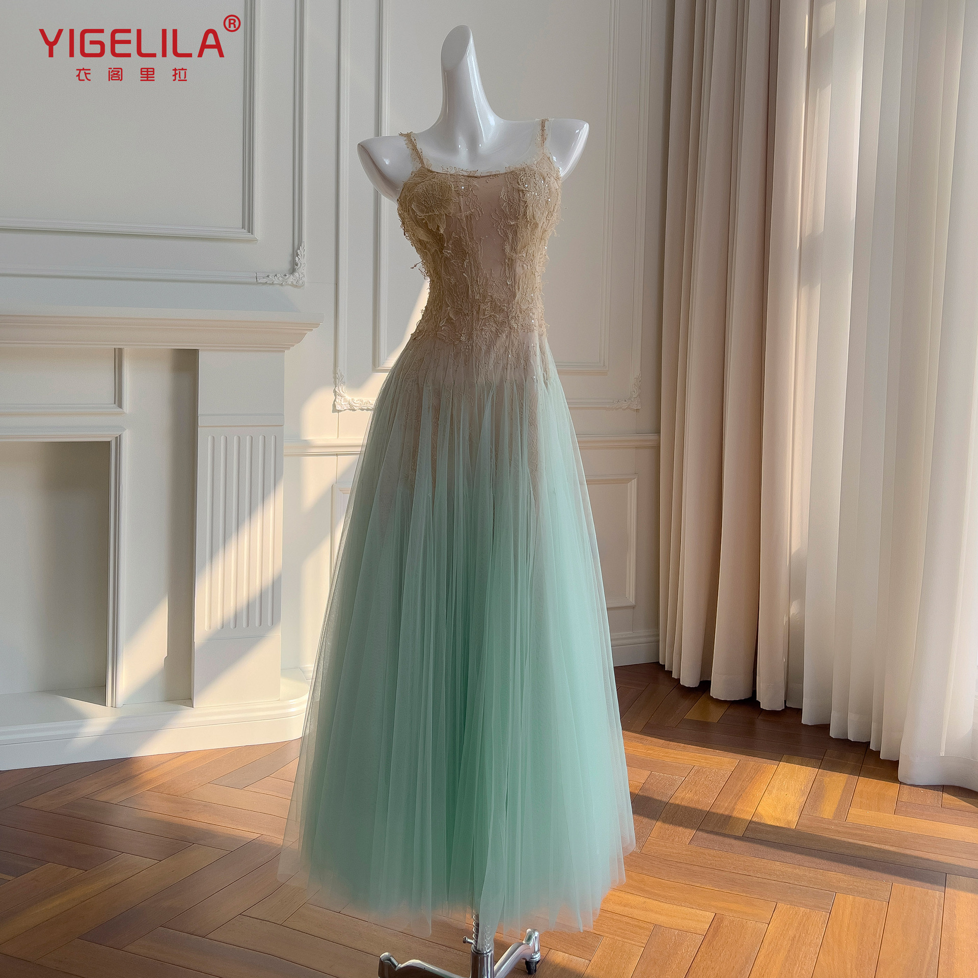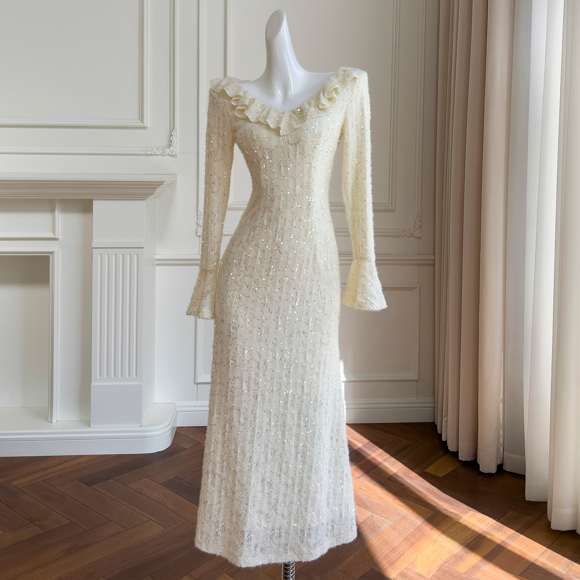 フレンチライトラグジュアリーセレブスタイルケーキドレスレディースシースルー長袖メッシュフリルロングドレス69077