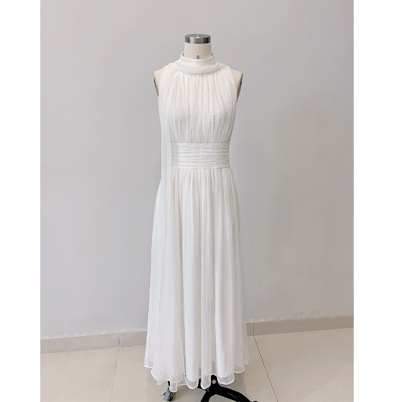 ストラップレスプリーツロングスカートカジュアルホルターネックリボン社交パーティードレス気質ワンラインカラードレス69244