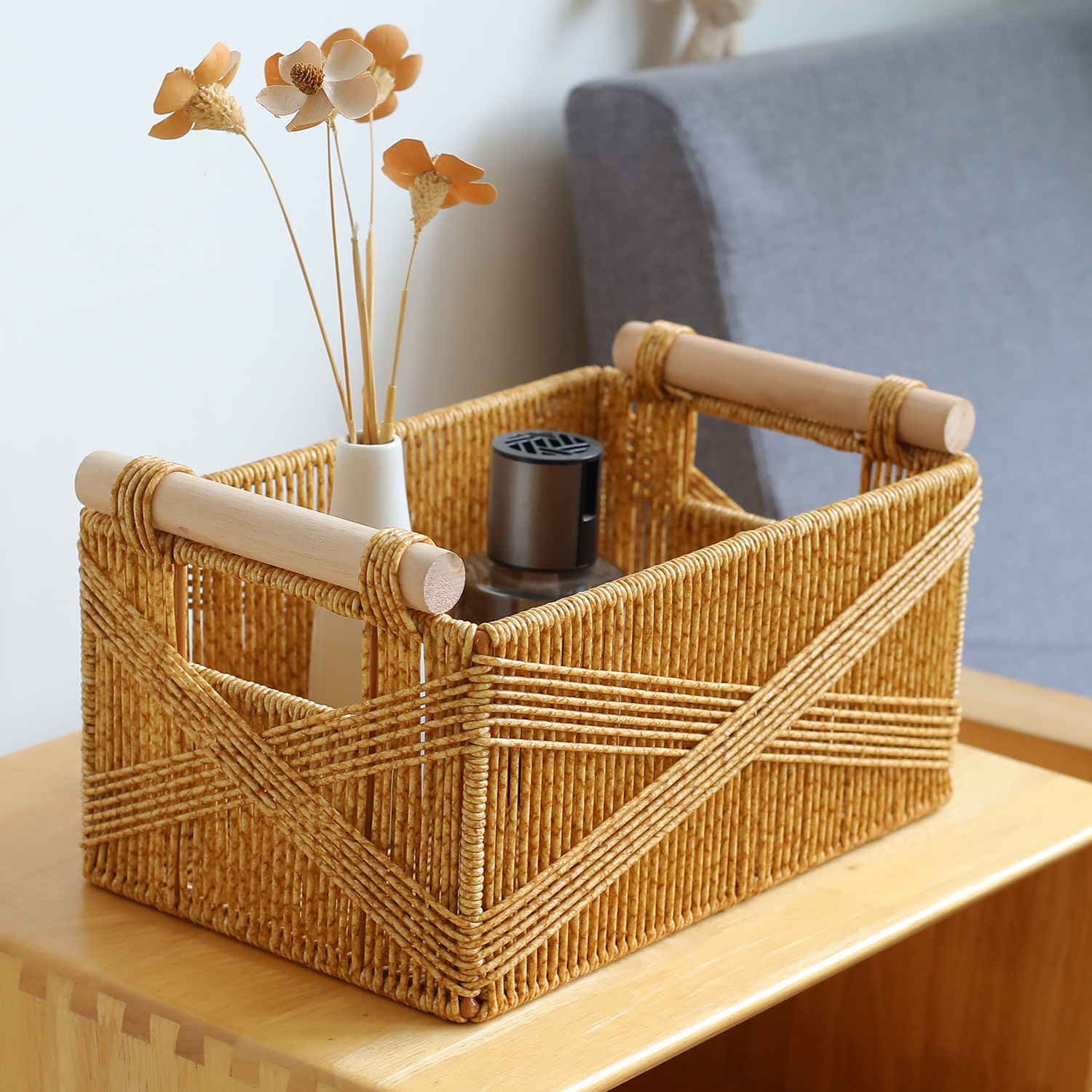 手工编织收纳篮简易玄关储物盒木把手客厅浴室护肤品家用筐