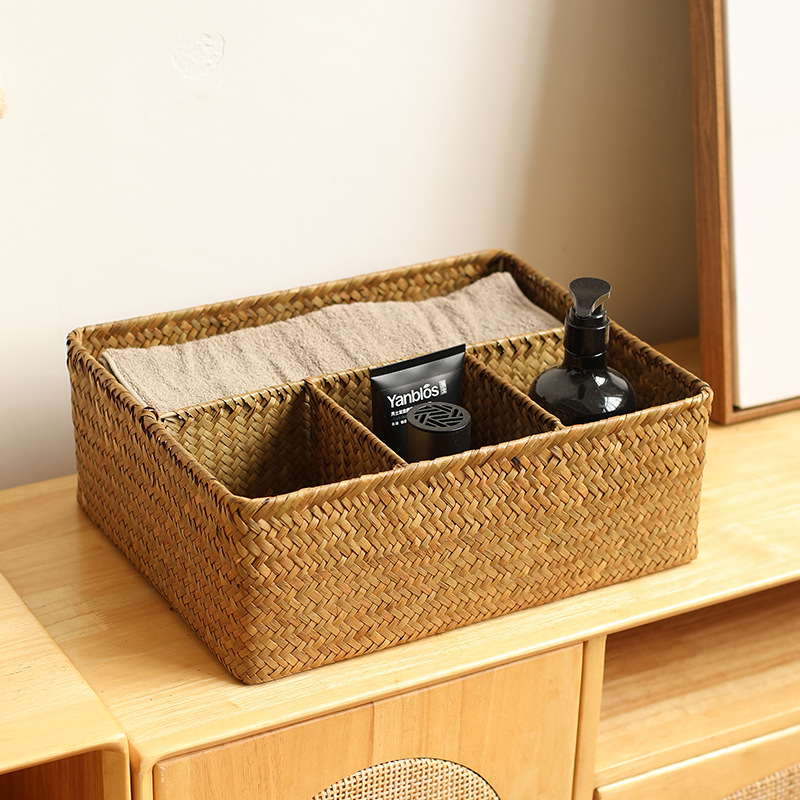 海草編みデスクトップ整理化粧品収納ボックスリビングルーム茶何リモコンスナック仕切りゴミ収納バスケット