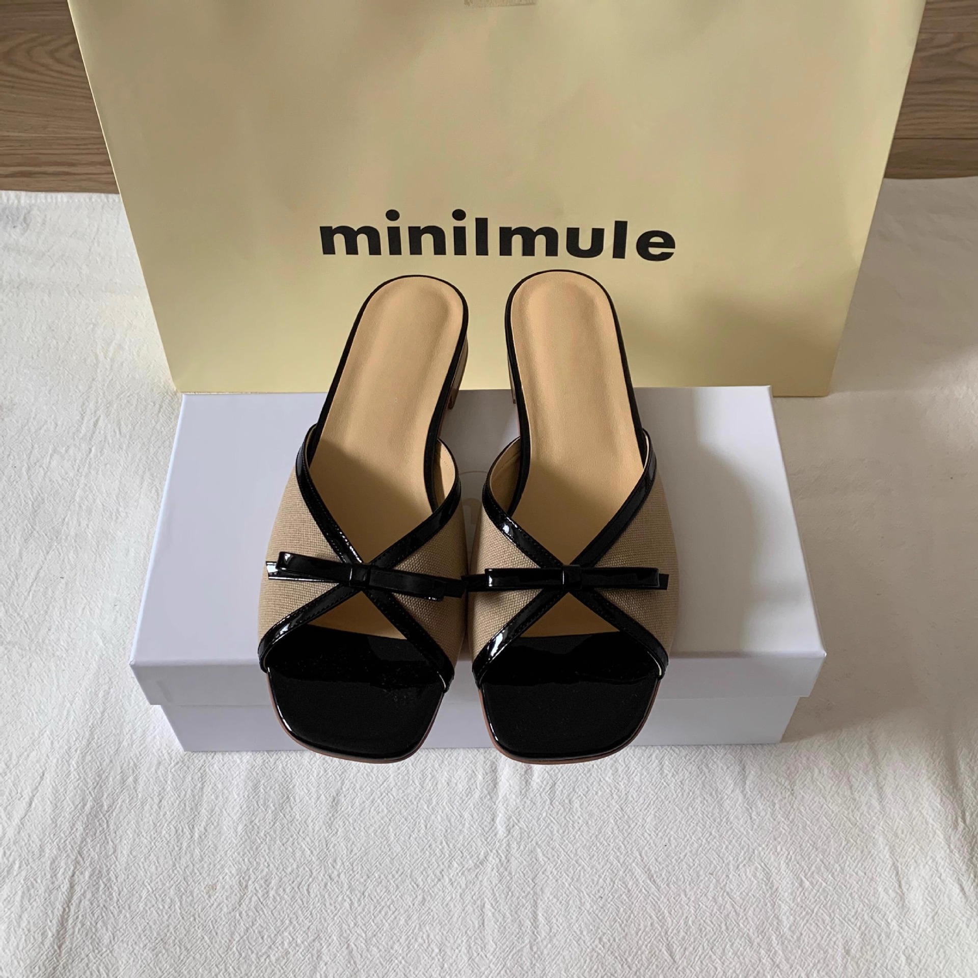 スポットバージョン~韓国風リボン本革スリッパ レディース フレンチ太ヒール スモールサンダル アウター ミュール ハーフスリッパ