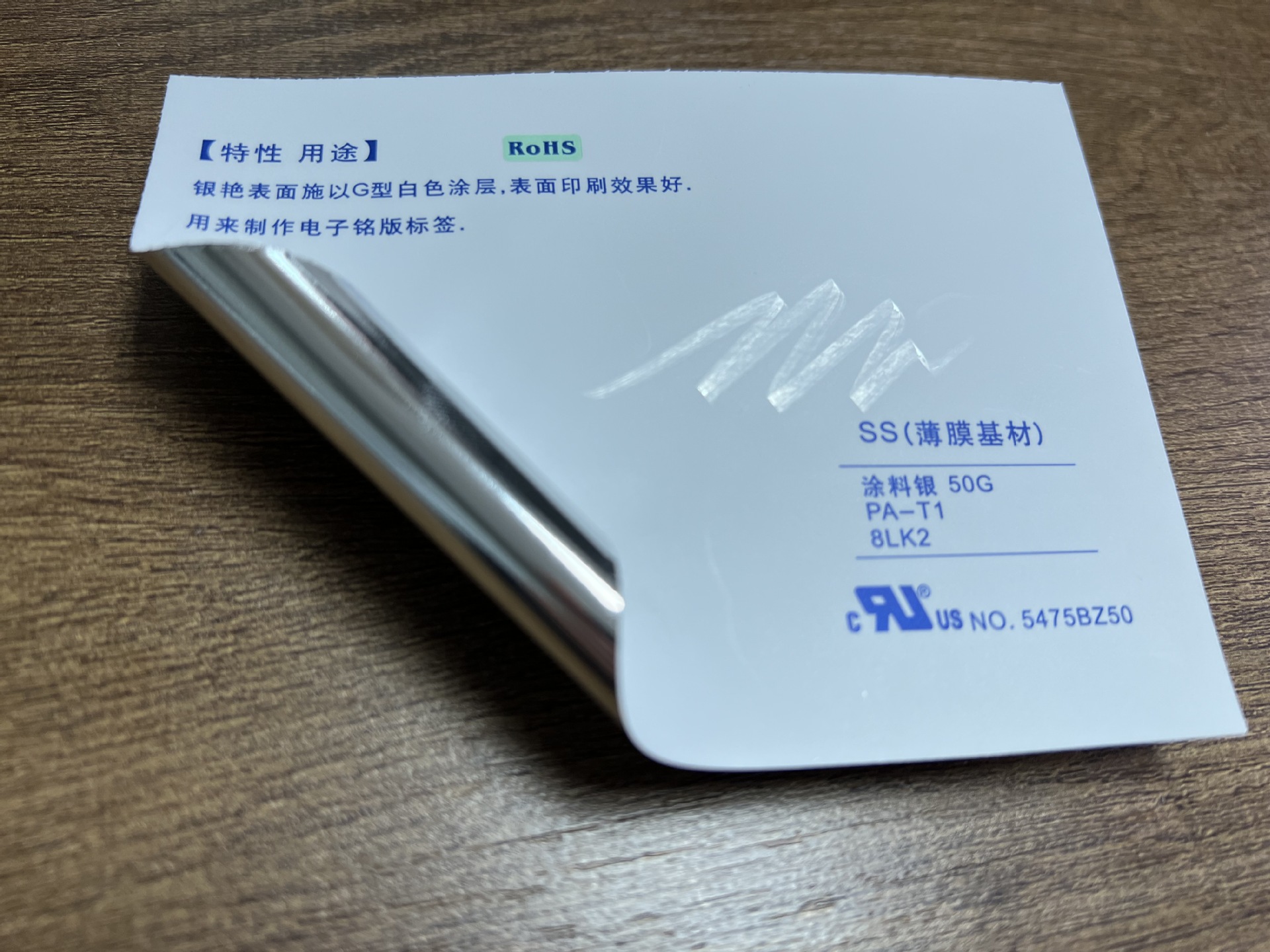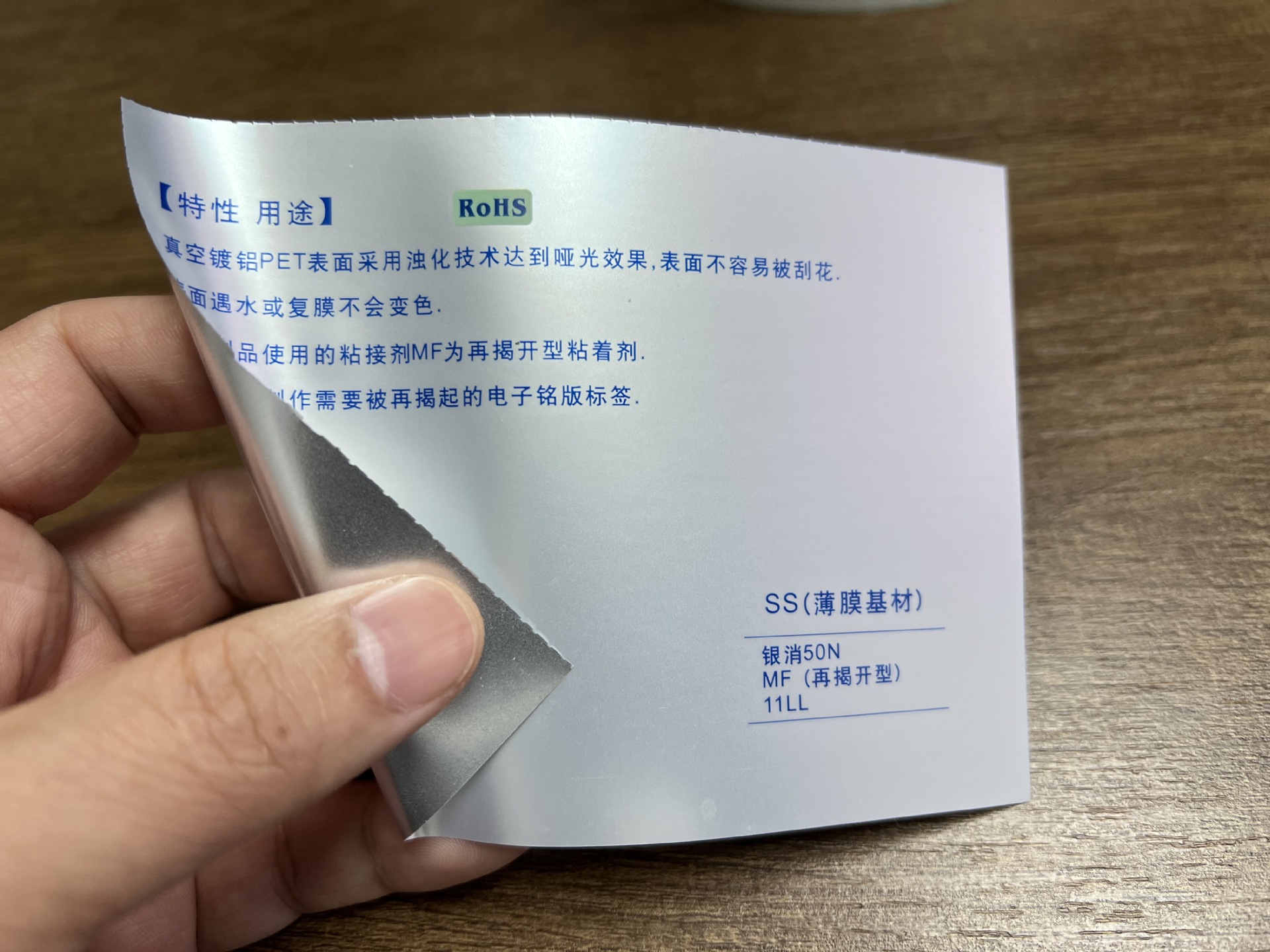 Lintec | 银消50S PA-T1 11L黄牛 | 哑银PET | PAT1 | 强粘型 | 50番厚度。表面不易被刮花,遇水或复膜不会变色。广泛用于制作电子铭版标贴。 |