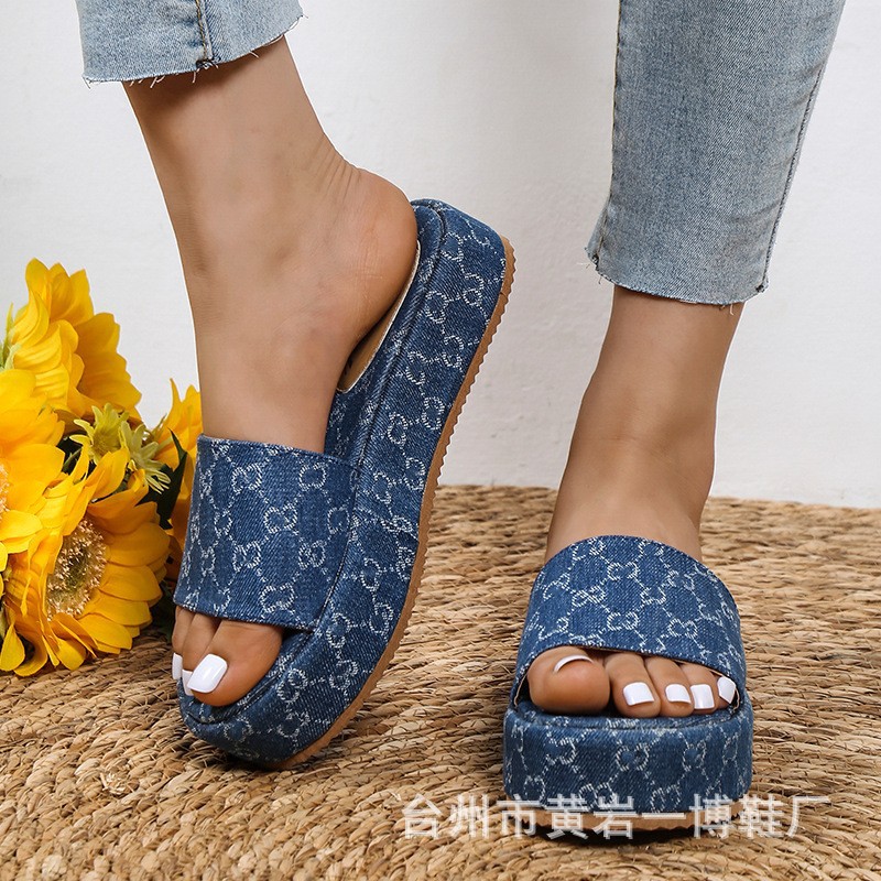 G家の厚い底のアルファベットのスリッパの女性の夏の新型の古い花のデニムのキャンバスの1字のレジャーは高くなって涼しくて外に着ます。