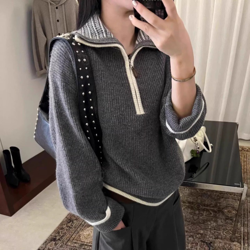 2025秋冬纯羊毛衫女半拉链翻领针织衫毛衣宽松拼色打底羊绒衫