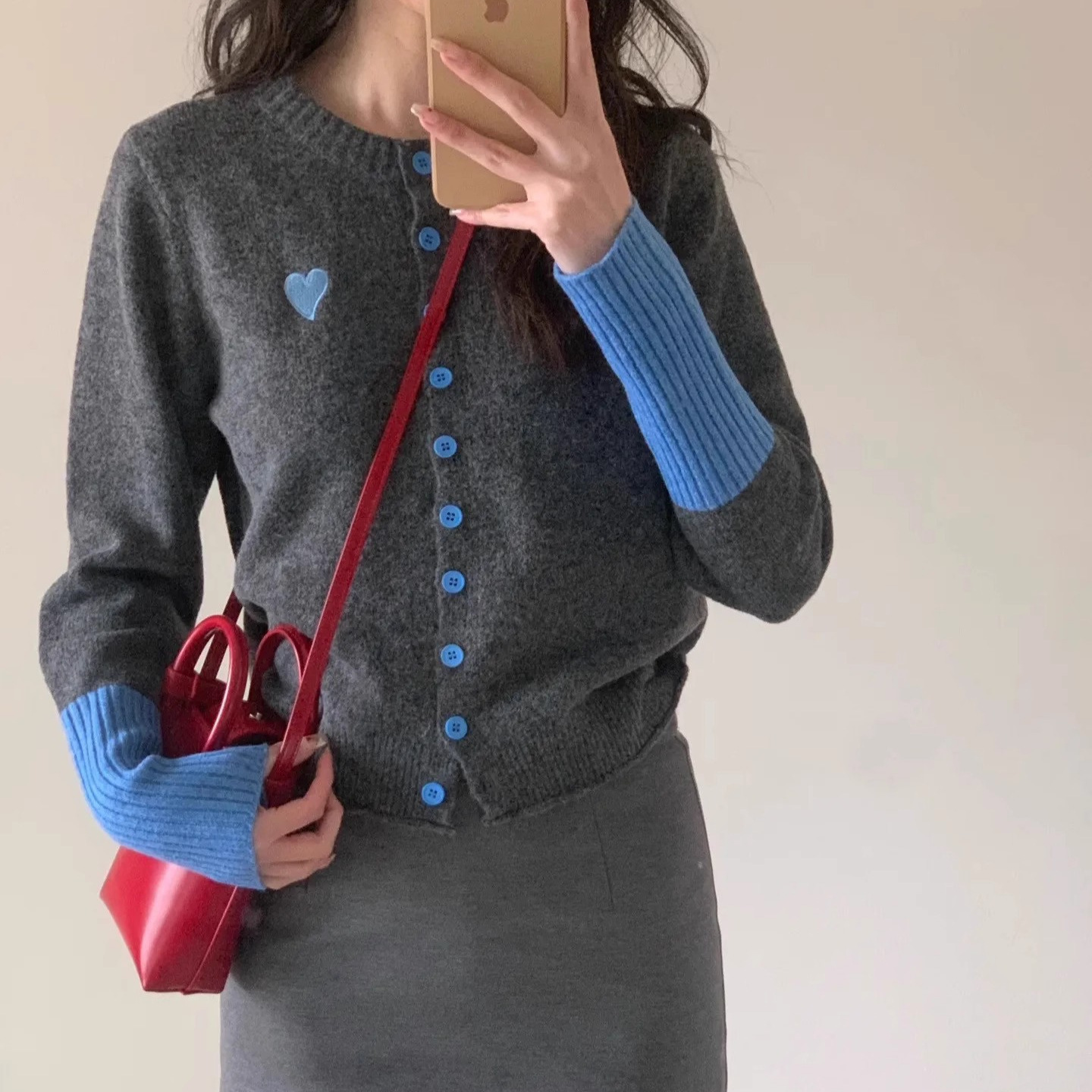 100纯羊毛针织开衫女式圆领拼接袖爱心刺绣设计感慵懒风外套毛衣