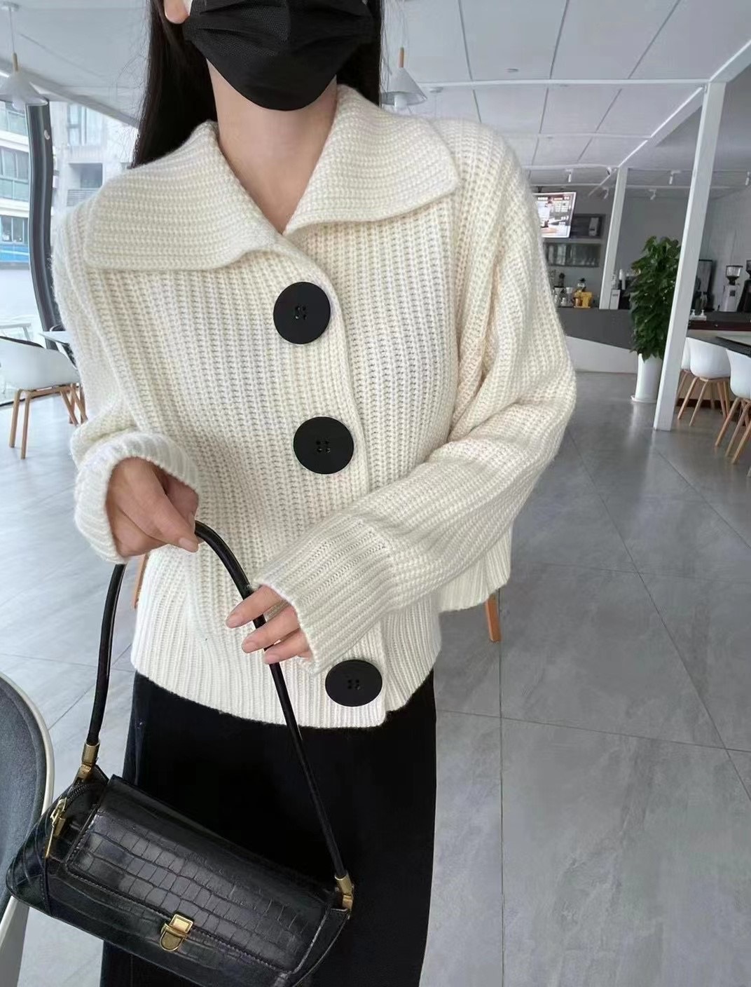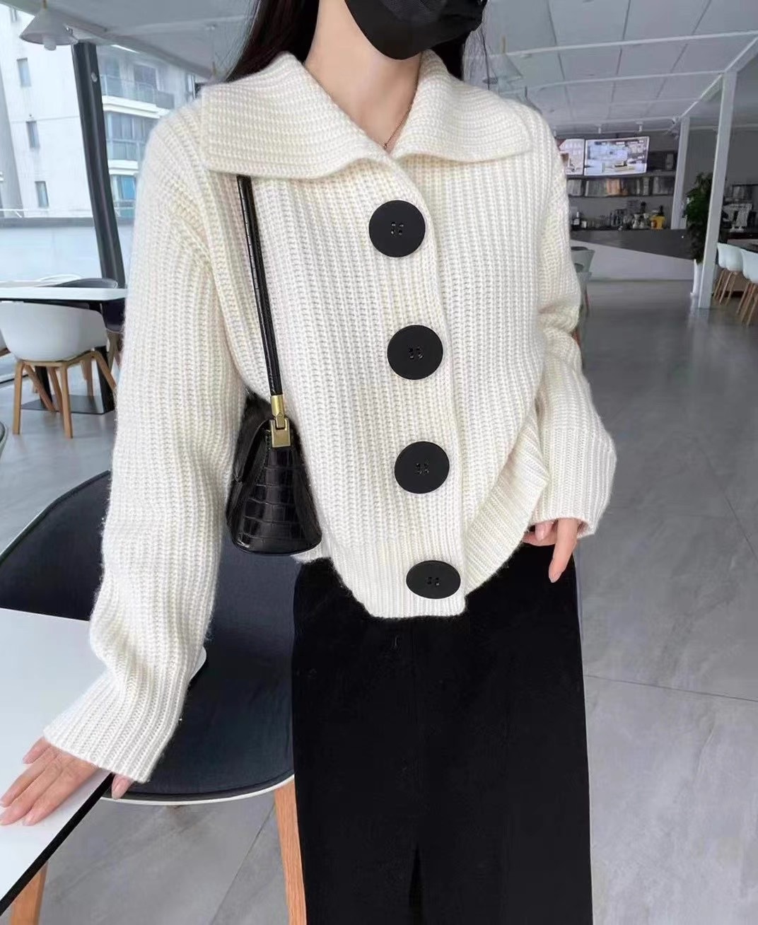 法式气质中长款大翻领100纯羊毛针织开衫女秋冬宽松毛衣打底外套