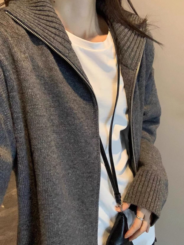秋冬100純ウールカーディガン女性海軍襟ファスナー厚手セーターゆったり大折り襟カシミヤニットコート