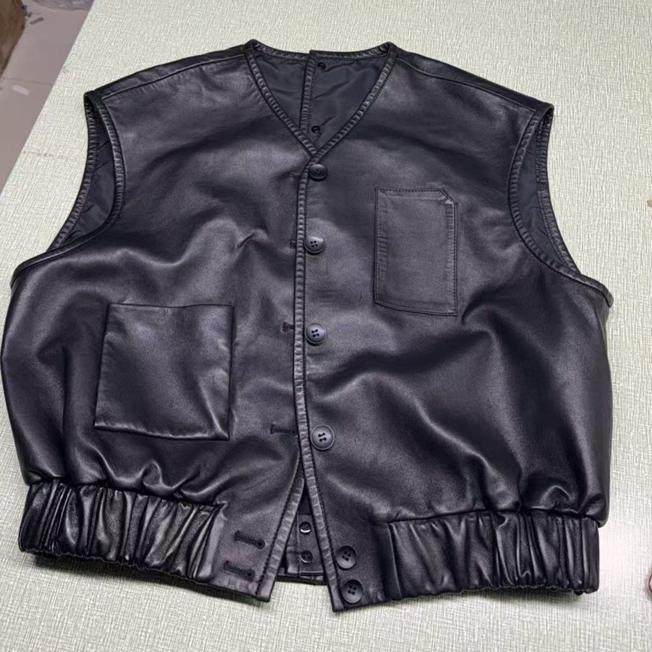 ヨーロッパ駅2025春の婦人服輸入羊皮新型純色袖なしvネック単列ボタンポケットゆるい皮服