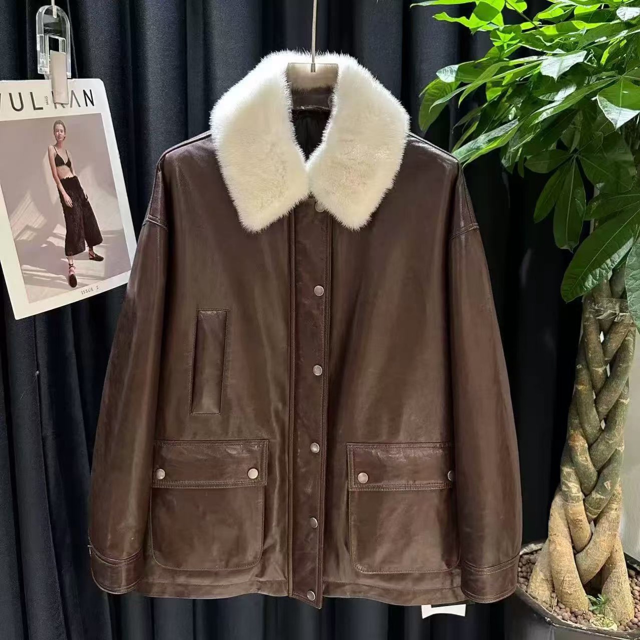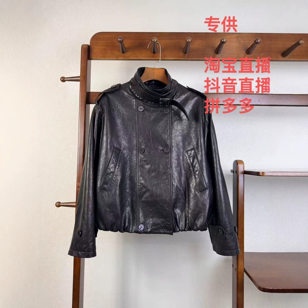 2025早春の新型の頭の層の羊の皮の油のワックスの欧韓のファッションの機関車の風は襟の皮を立てて腰を収めて百合の皮を掛けます。