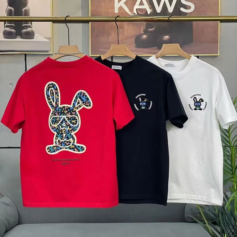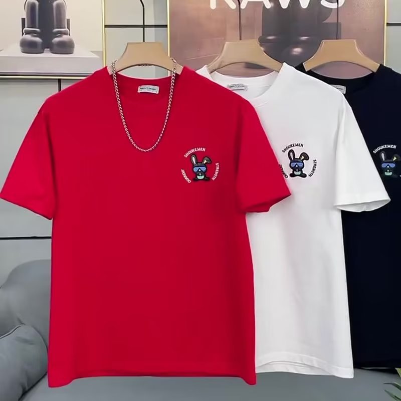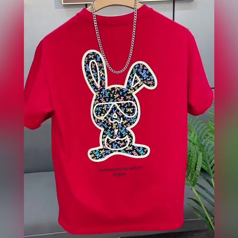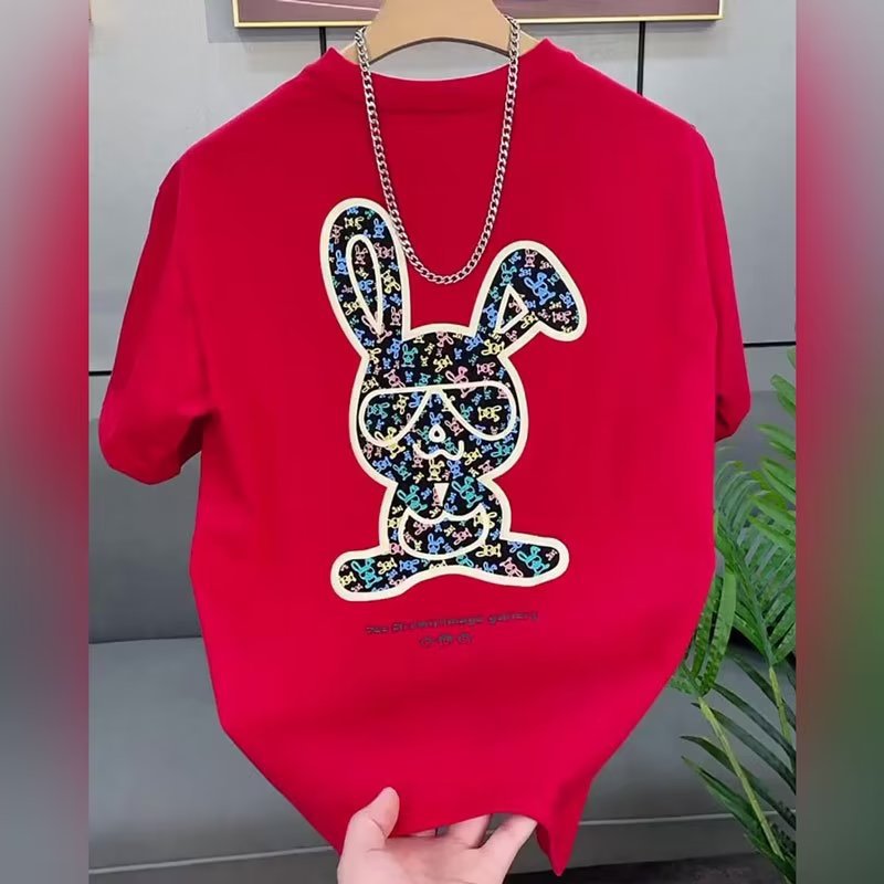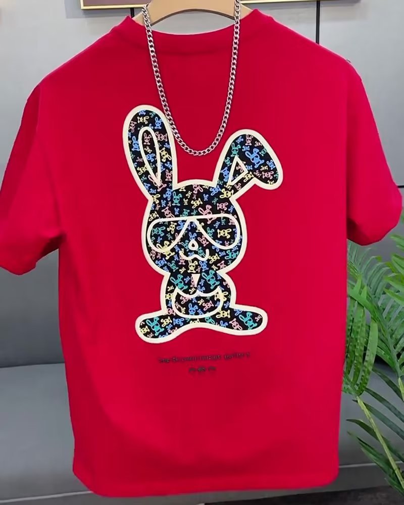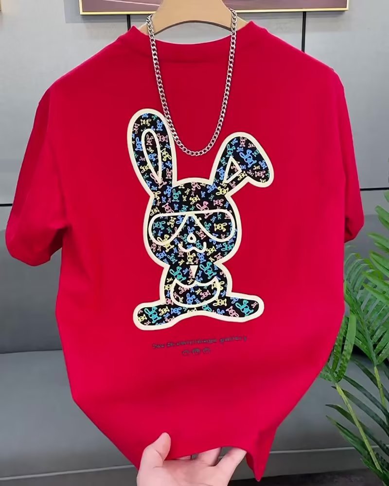 ファッションブランドの新しい男性のウサギのプリントの半袖の赤いファッションはtシャツの漫画の個性の丸首の半袖の上着を修理します。