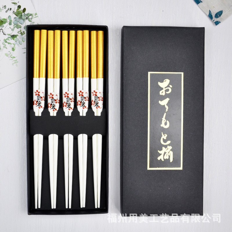 白地に半分金塗りの箸5膳入り箱、家庭用高級食器箸、日本向け輸出、メーカー卸売