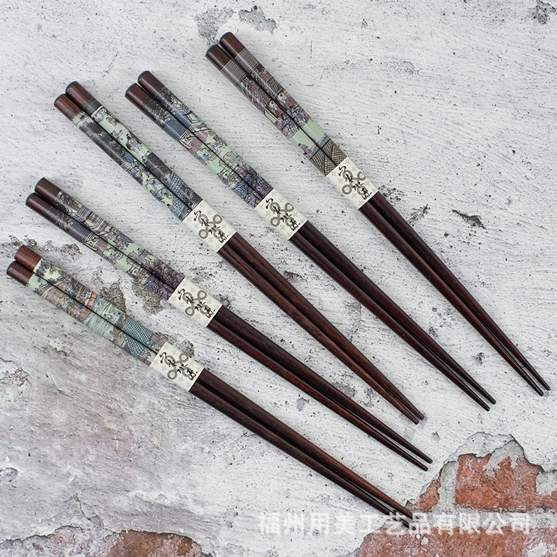 清明の川の絵 2 本の箸と 2 本の箸セット家庭用ハイエンド熱転写カップル箸無垢材箸