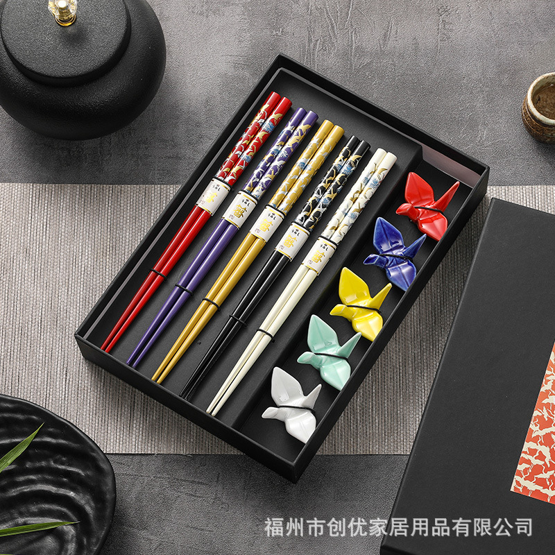 日本製尖った5色フルラッカー箸、高級千羽鶴陶器箸、ギフトボックス、日本食店食器セット、ギフト
