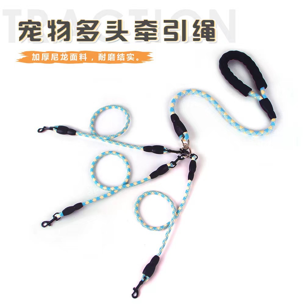 国境を越えて三匹のペット犬の牽引ひもが多頭で犬のひもを散歩して、一本のひもが三匹の犬のペット用品を引いて卸売りします。