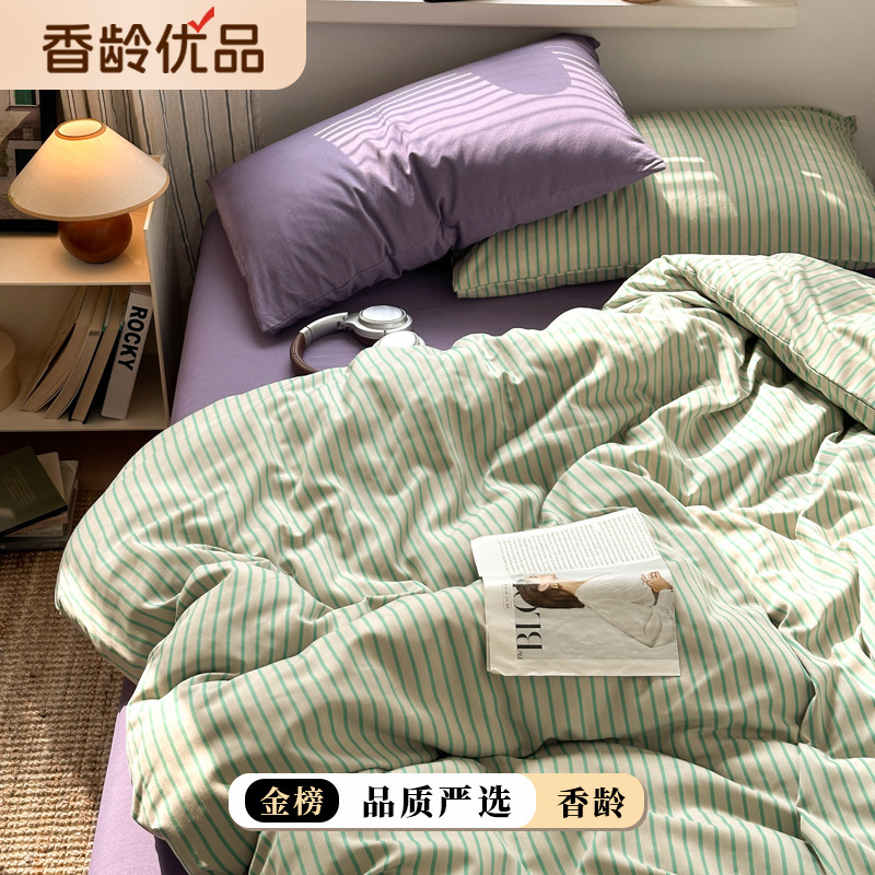 【香龄优品】中古风条纹纯色混搭水洗棉四件套ins风四季通用床品