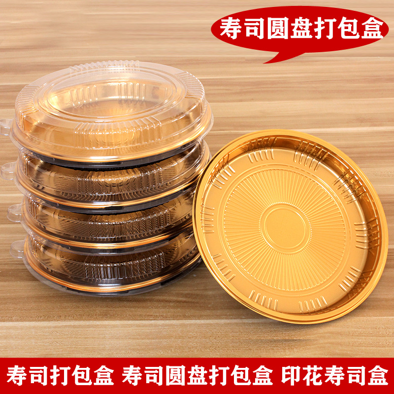 圆形寿司打包盒金色高档日式寿司盒金叶刺身塑料拼盘一次性保鲜盒
