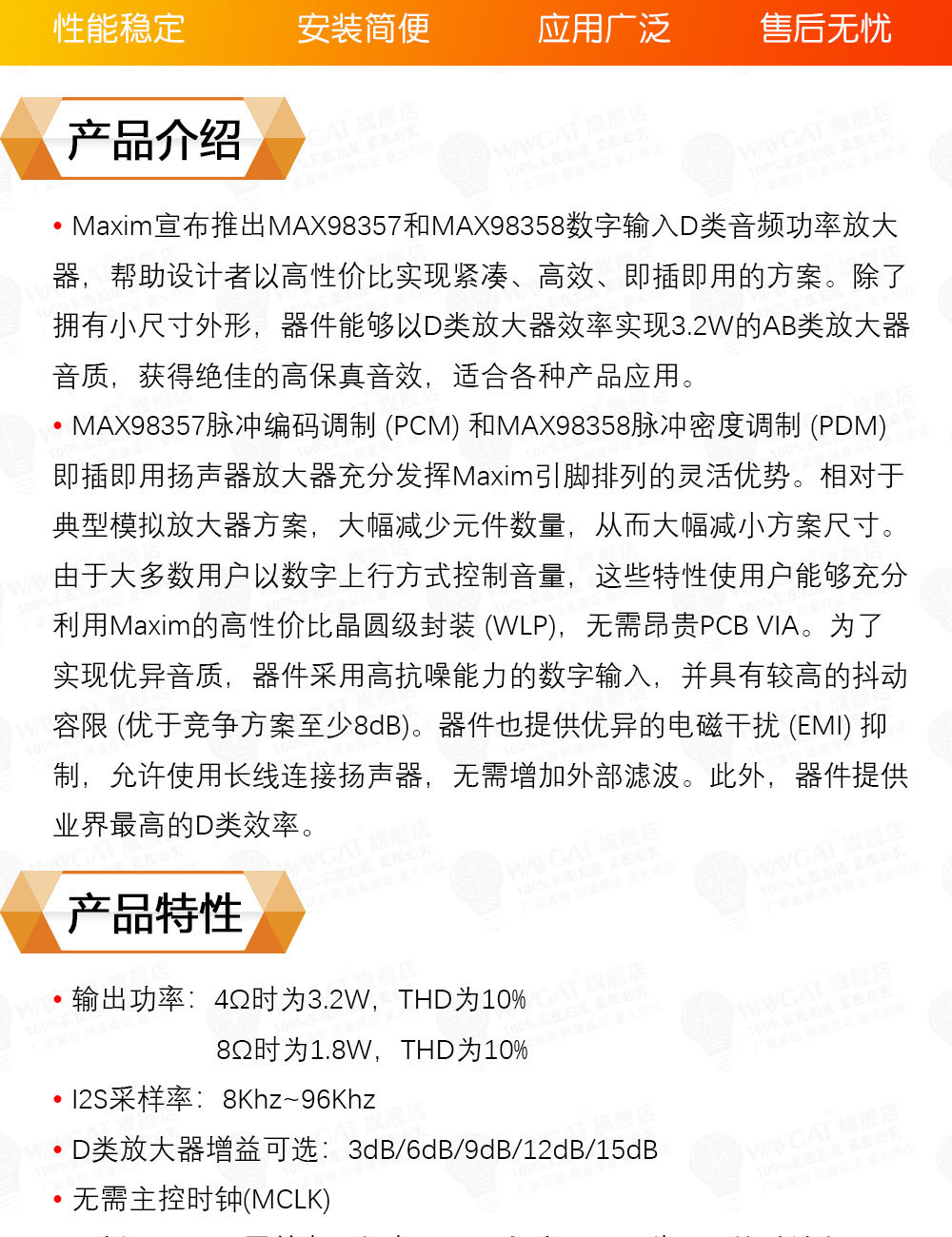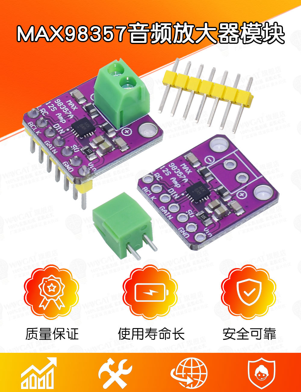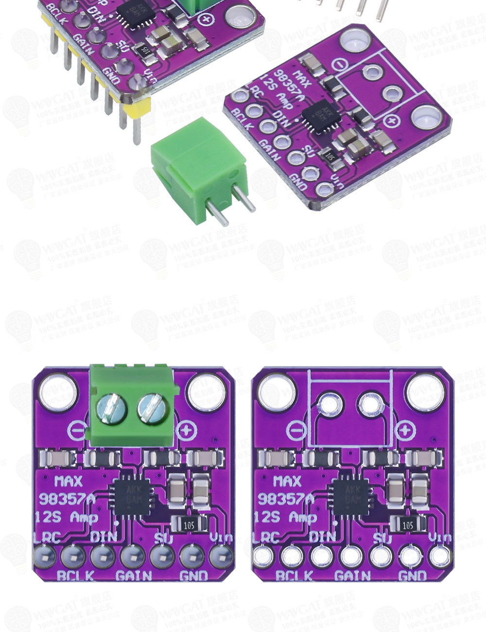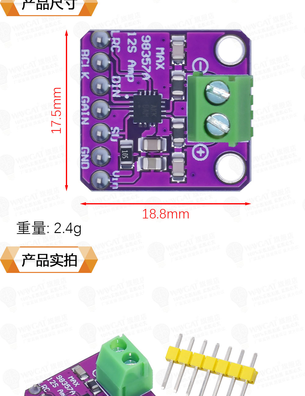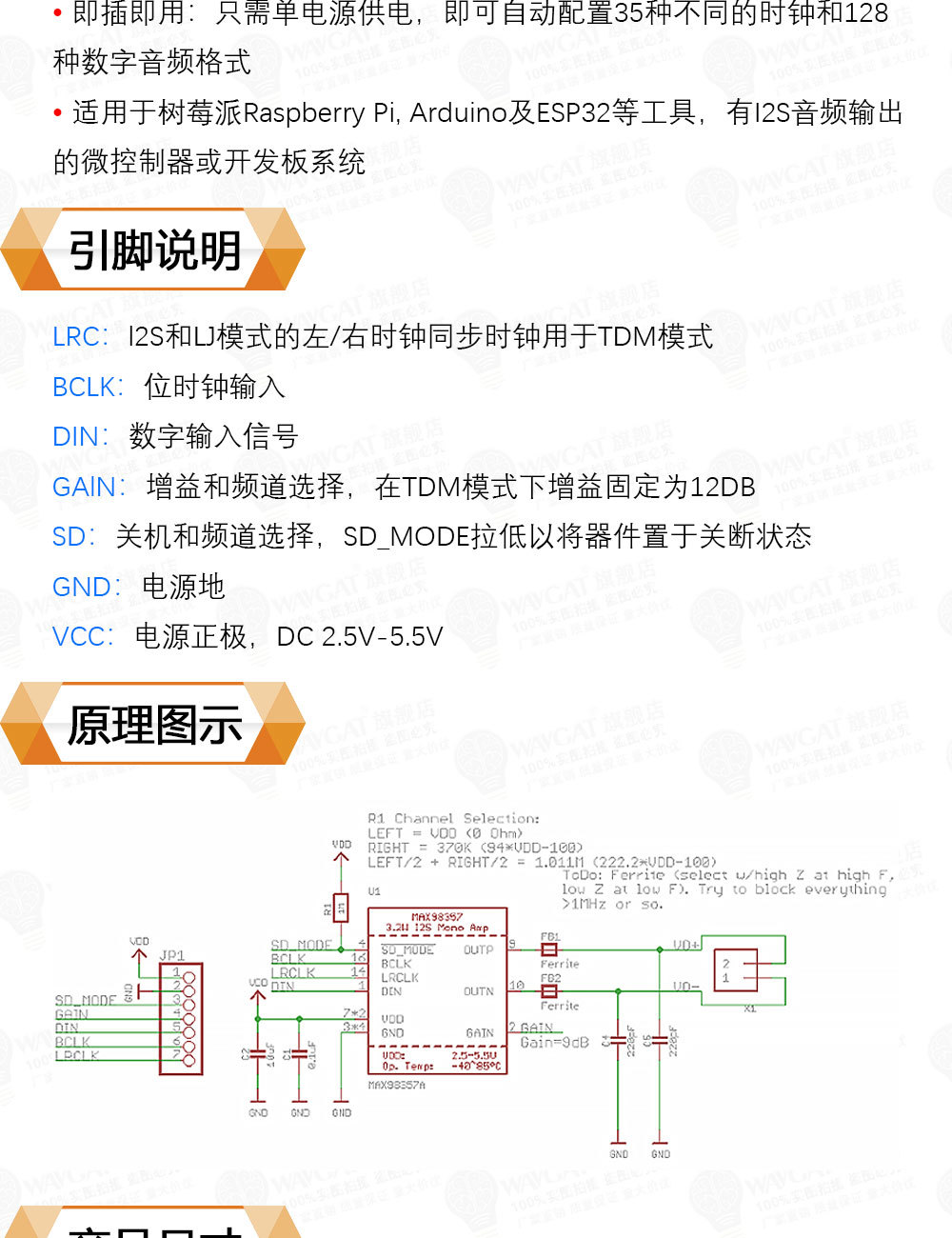 MAX98357 I2S 音频放大器模块 无滤波D类放大 支持ESP32 树莓pi
