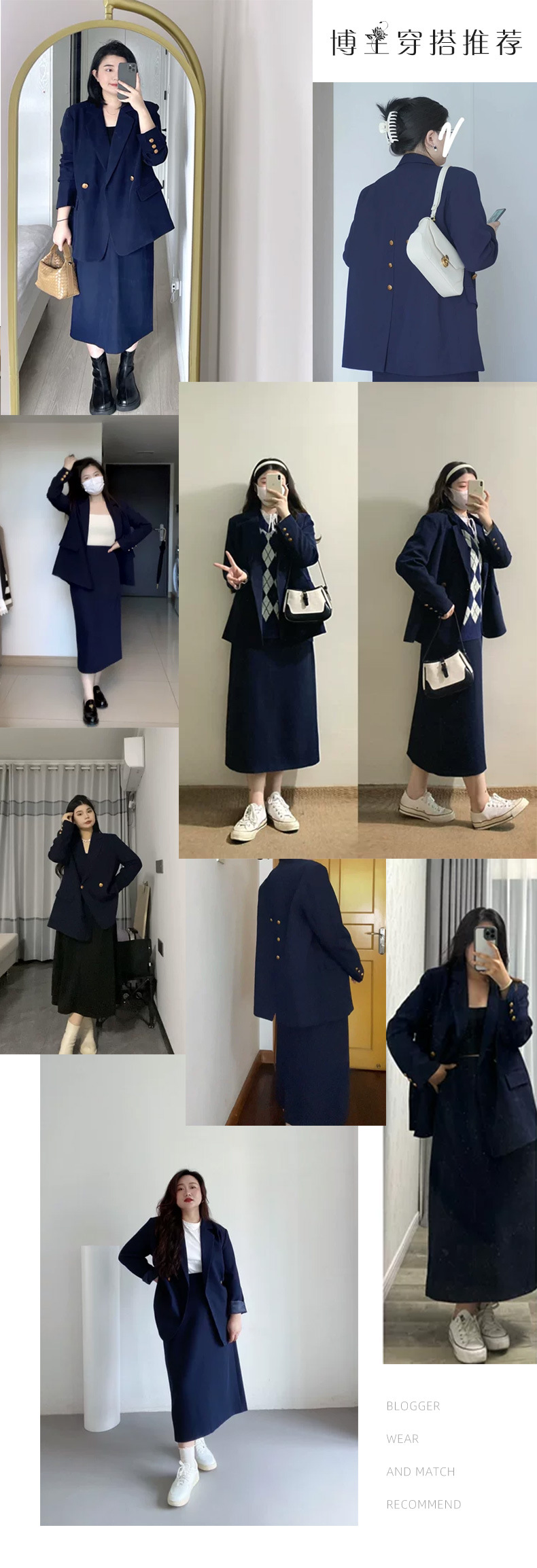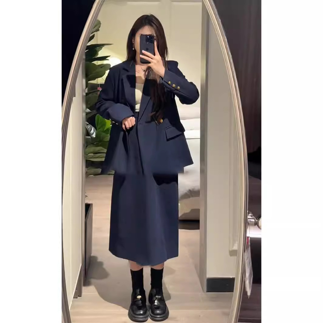 2329春の服の新型の大きいサイズの婦人服のスーツのスーツの女性の太っているmmの紺色の後でフォークのまっすぐな筒の半スカートの2つのセット