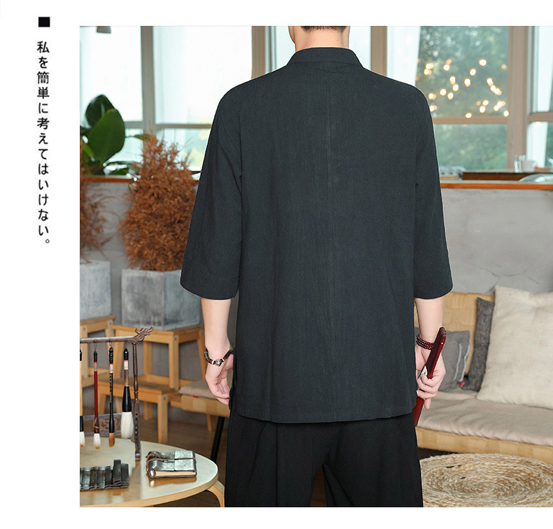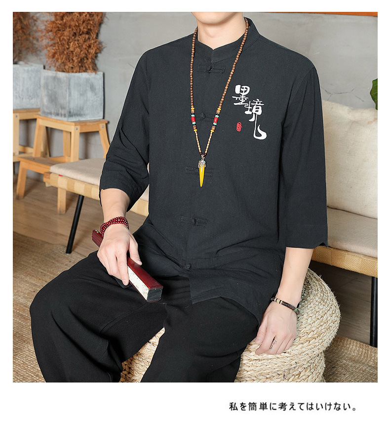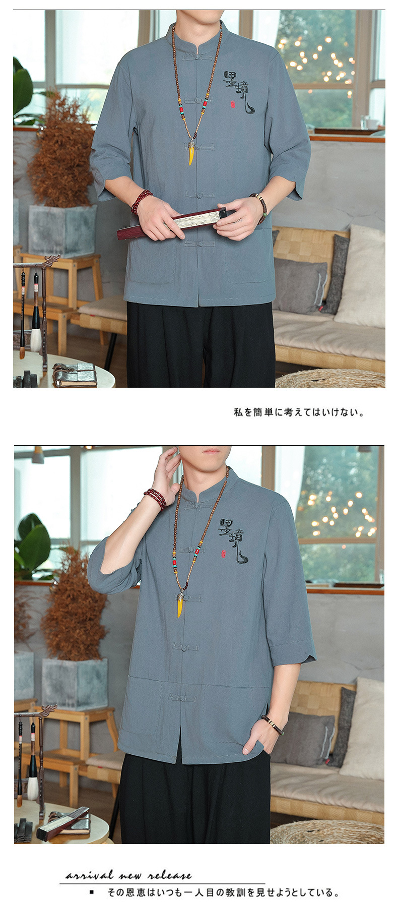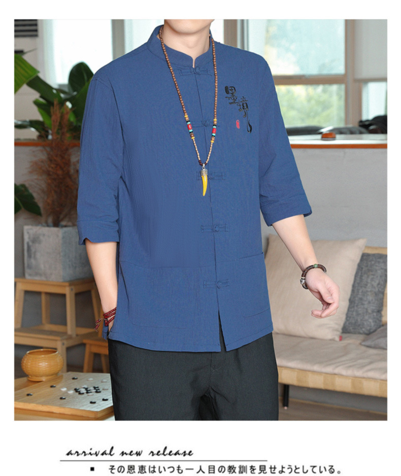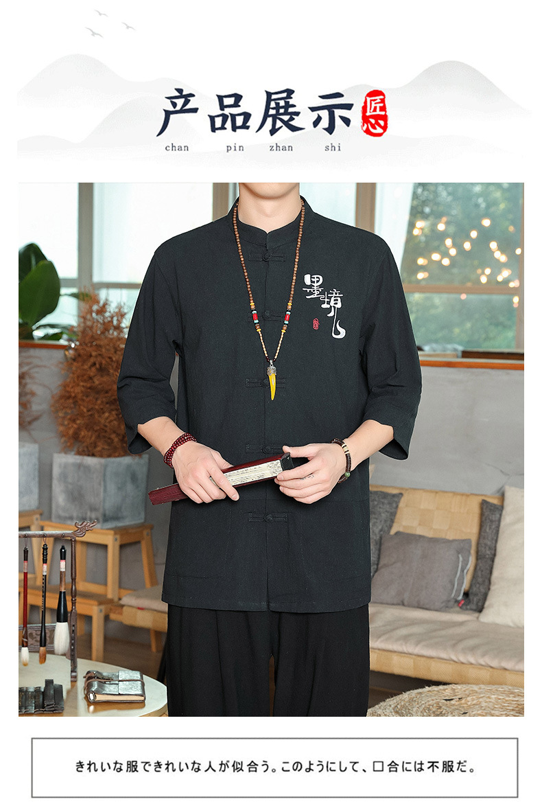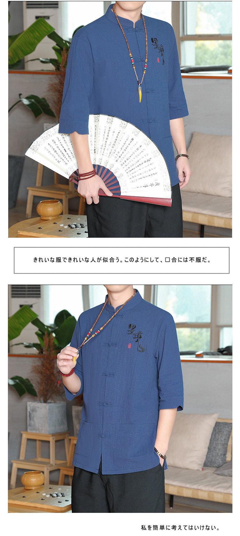 卸売り中国風紳士服復古風半袖tシャツ綿麻唐装漢服七分袖立襟tシャツ半袖男
