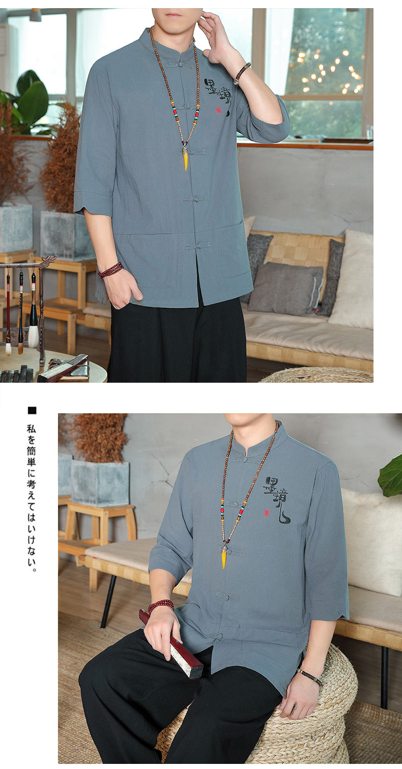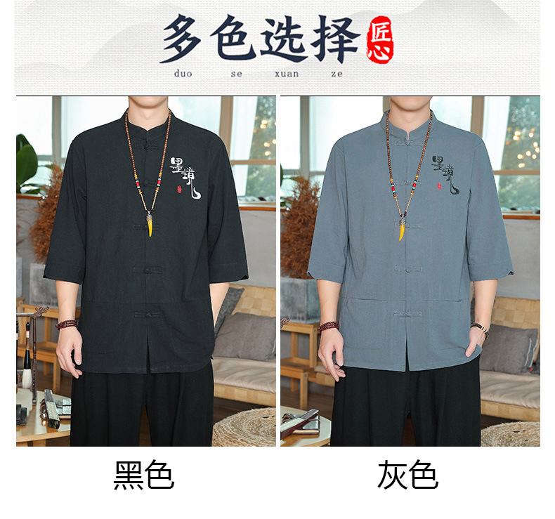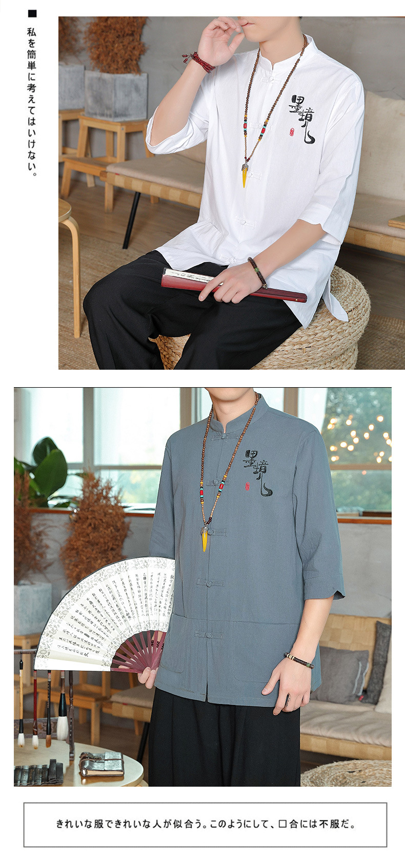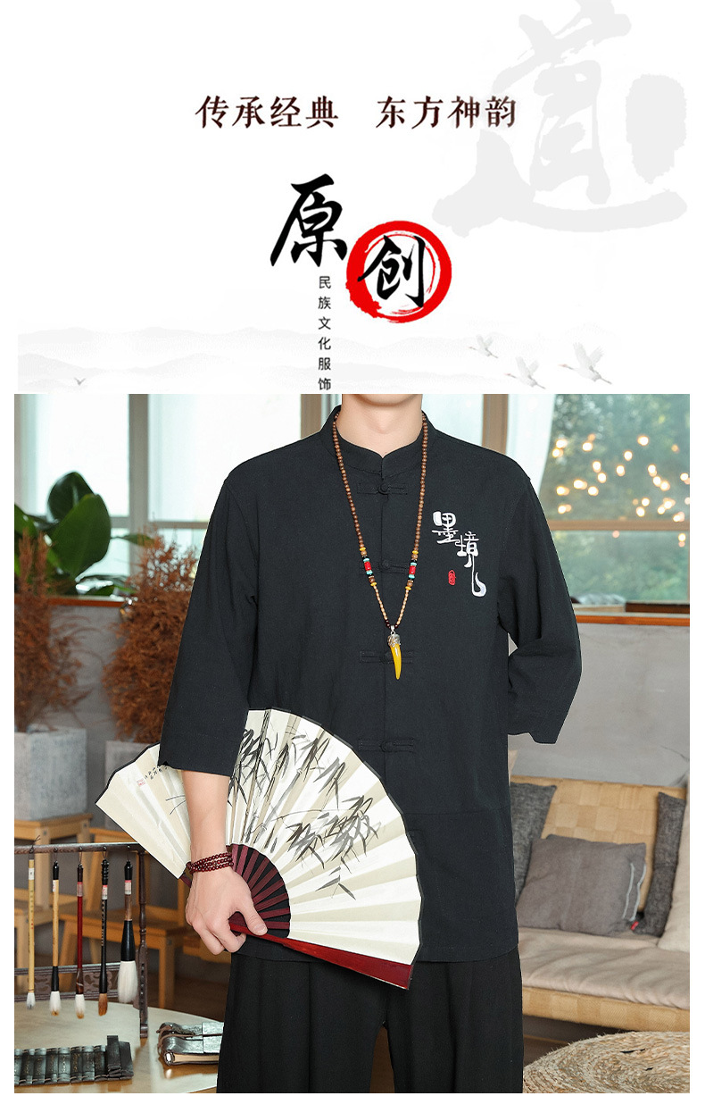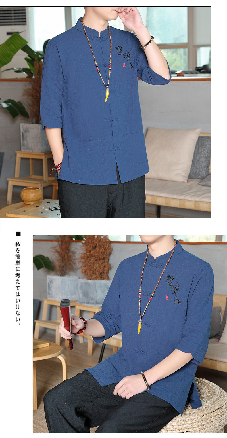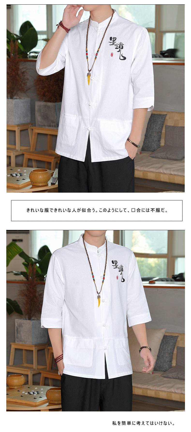卸売り中国風紳士服復古風半袖tシャツ綿麻唐装漢服七分袖立襟tシャツ半袖男