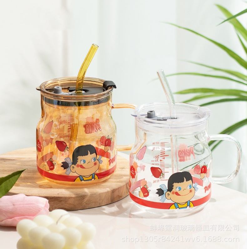 不二家大容量水杯可爱印花高硼硅耐热玻璃杯果茶杯可爱卡通吸管杯